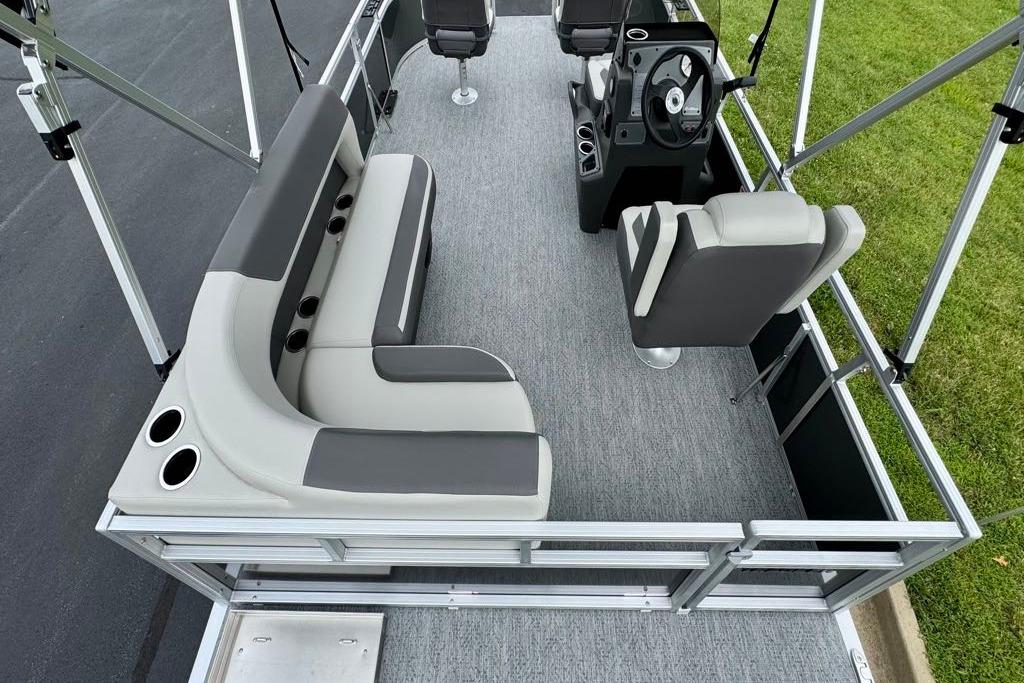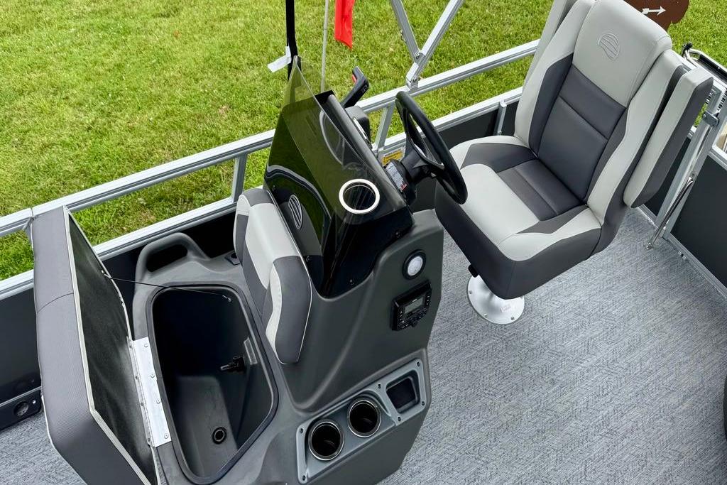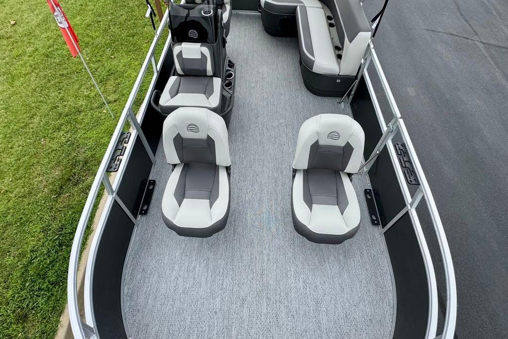 This seven-passenger fishing pontoon hits the water with new console and lounge designs. Get three extra cubic feet of storage thanks to clever backrest cut-outs. The redesign also adds a seat in front of the driver console, phone compartments, and four more cupholders. Cast from the shade of a standard 7' bimini top in one of the two folding fishing seats. Find your spot on the lake from the decked-out driver console, which comes with its own rod holder.