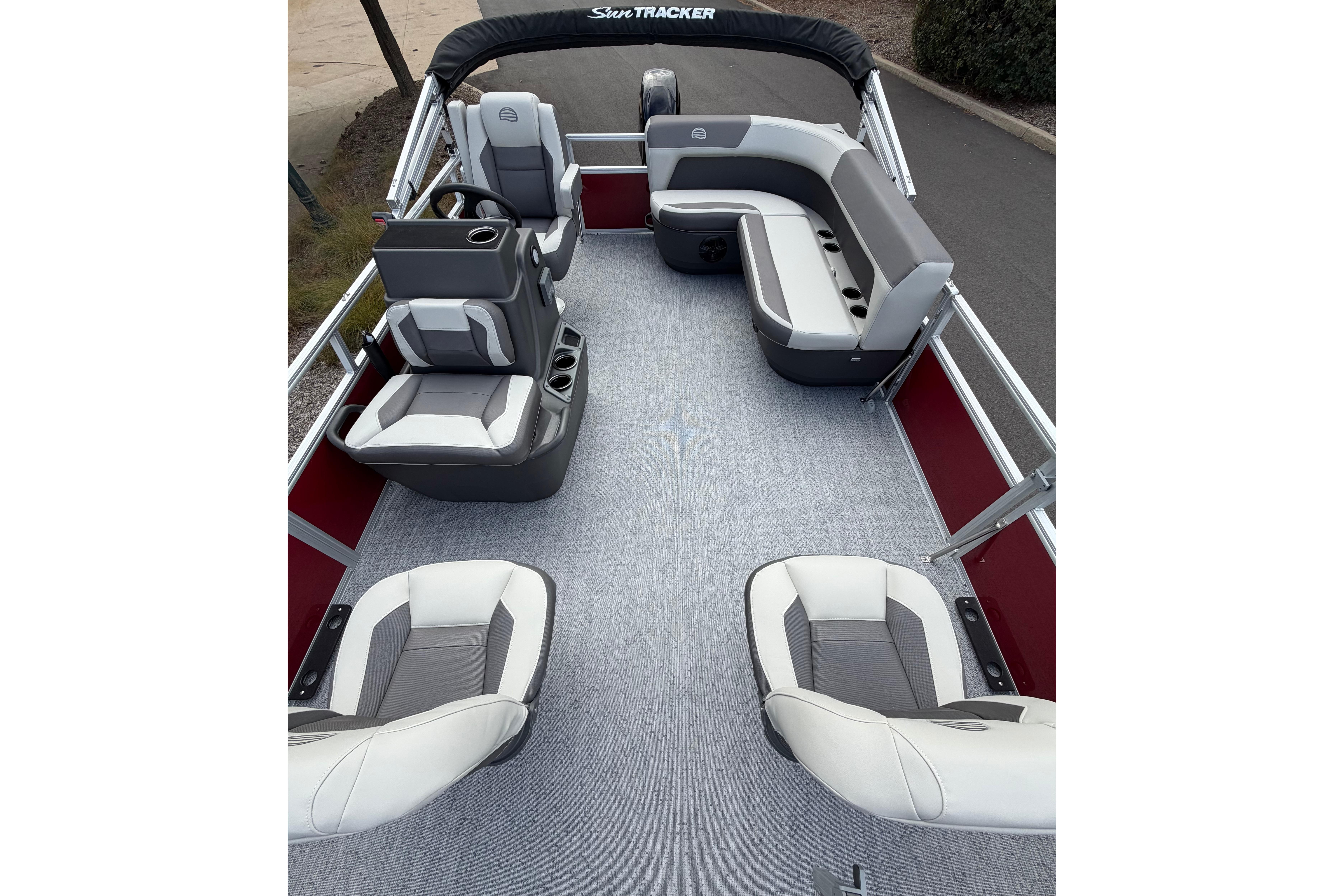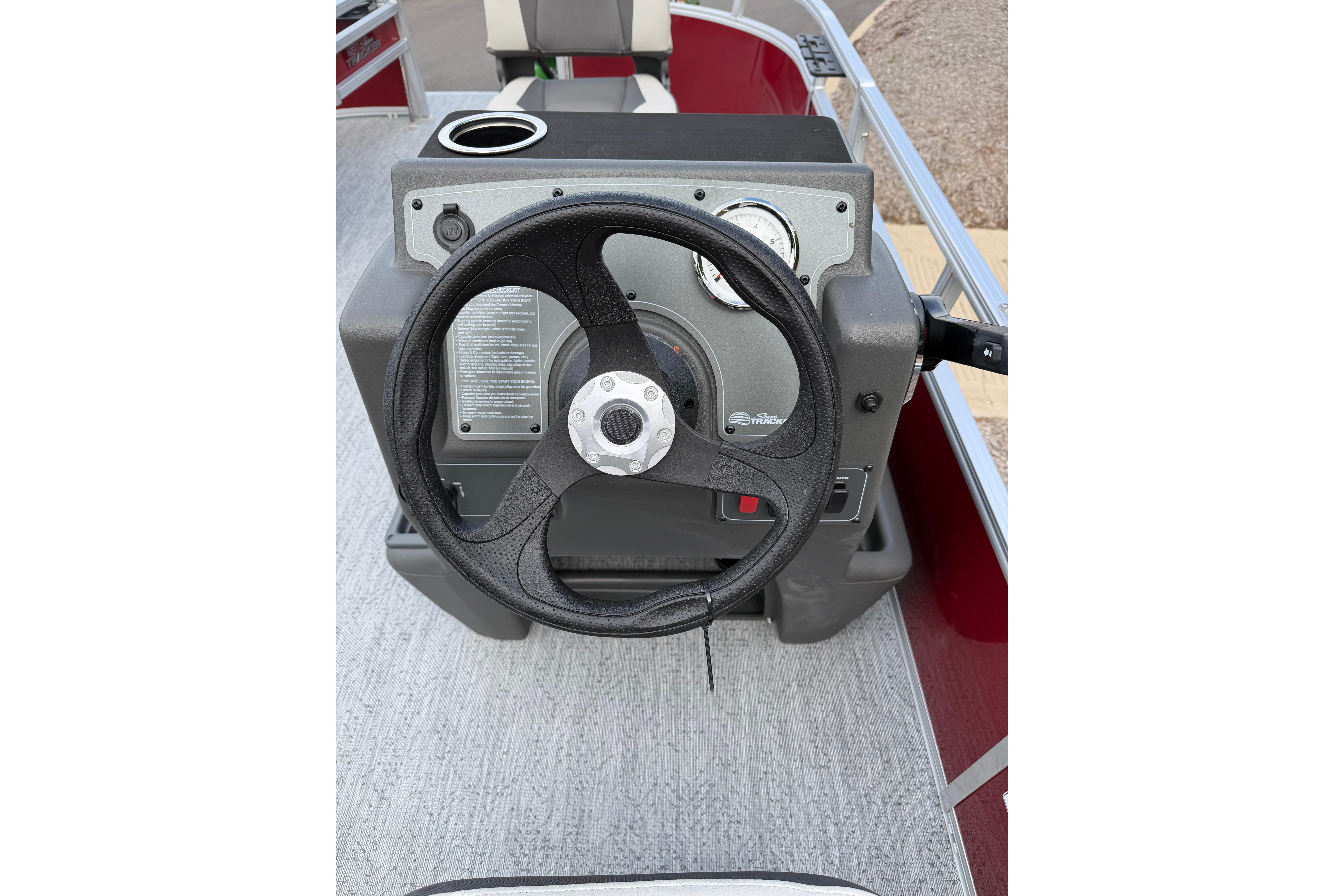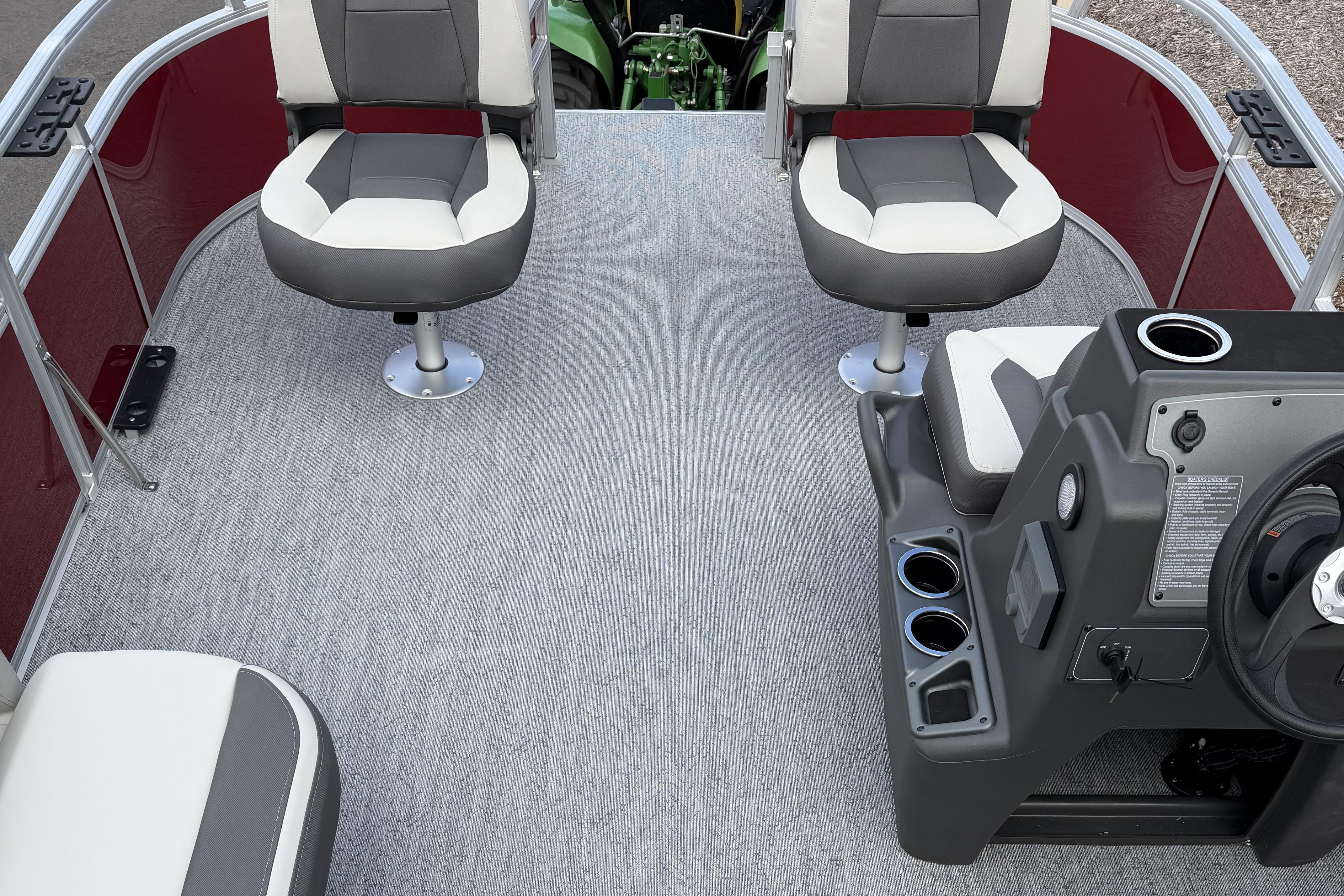 This seven-passenger fishing pontoon hits the water with new console and lounge designs. Get three extra cubic feet of storage thanks to clever backrest cut-outs. The redesign also adds a seat in front of the driver console, phone compartments, and four more cupholders. Cast from the shade of a standard 7' bimini top in one of the two folding fishing seats. Find your spot on the lake from the decked-out driver console, which comes with its own rod holder.