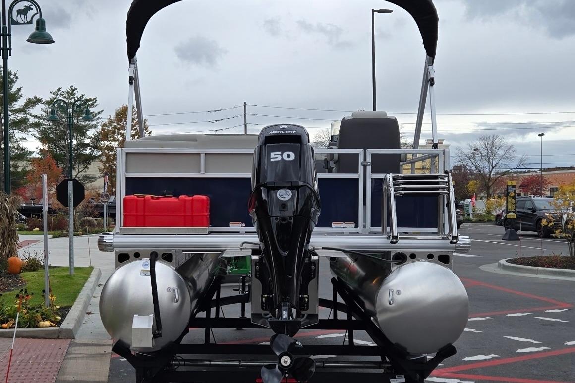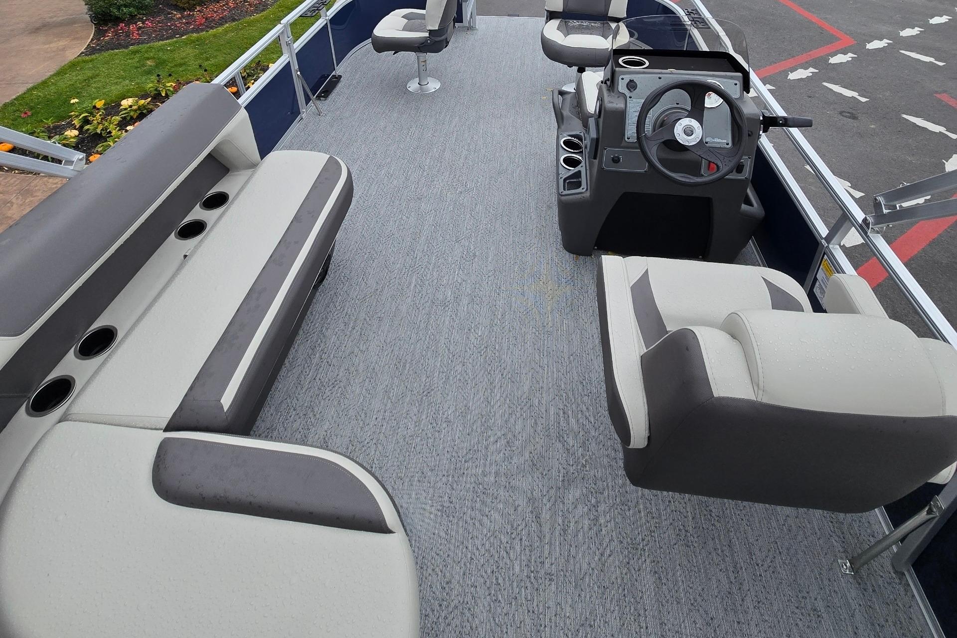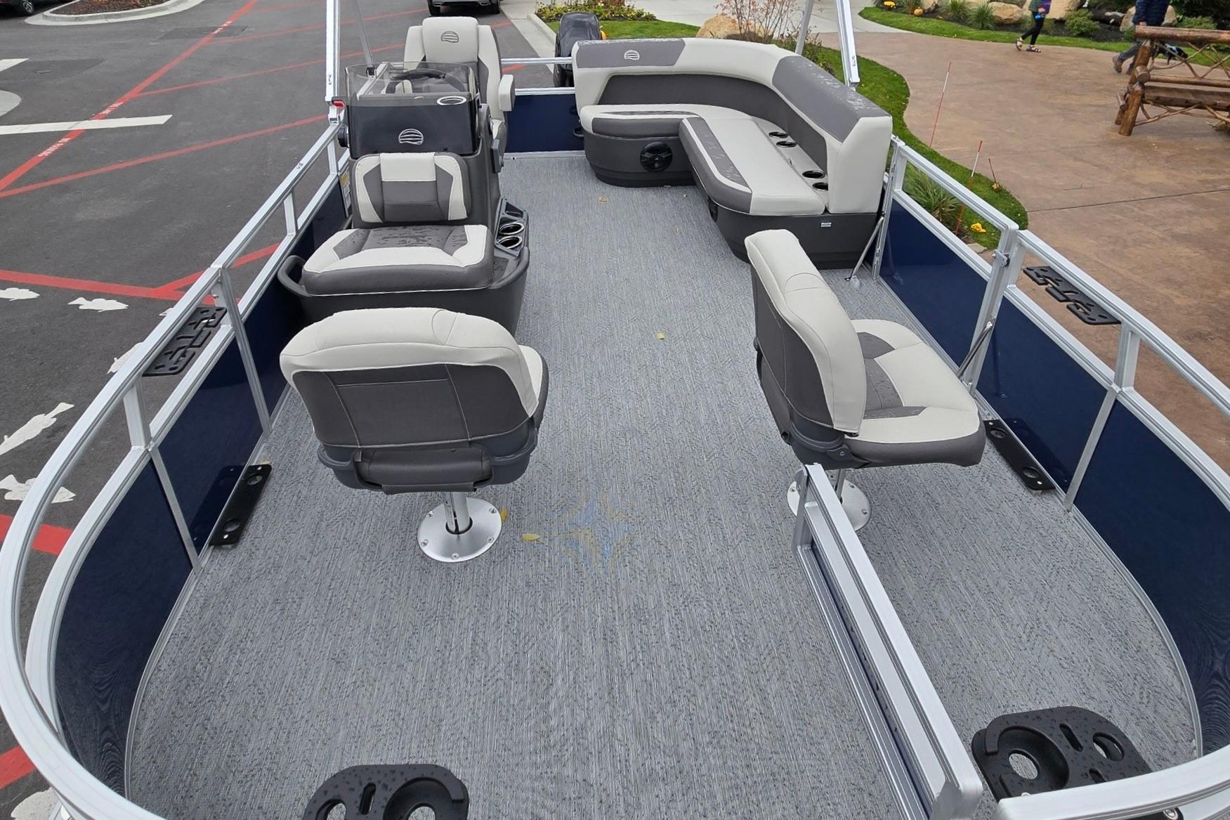 This seven-passenger fishing pontoon hits the water with new console and lounge designs. Get three extra cubic feet of storage thanks to clever backrest cut-outs. The redesign also adds a seat in front of the driver console, phone compartments, and four more cupholders. Cast from the shade of a standard 7' bimini top in one of the two folding fishing seats. Find your spot on the lake from the decked-out driver console, which comes with its own rod holder.