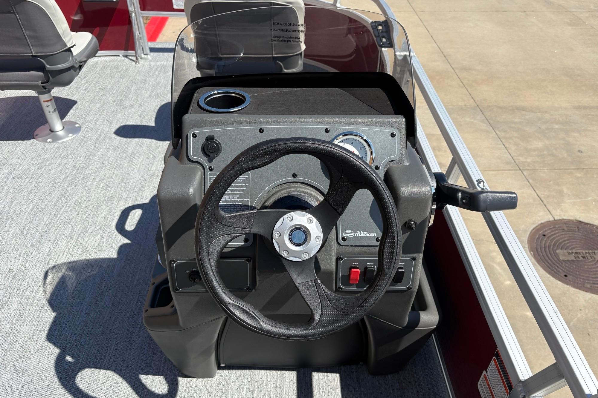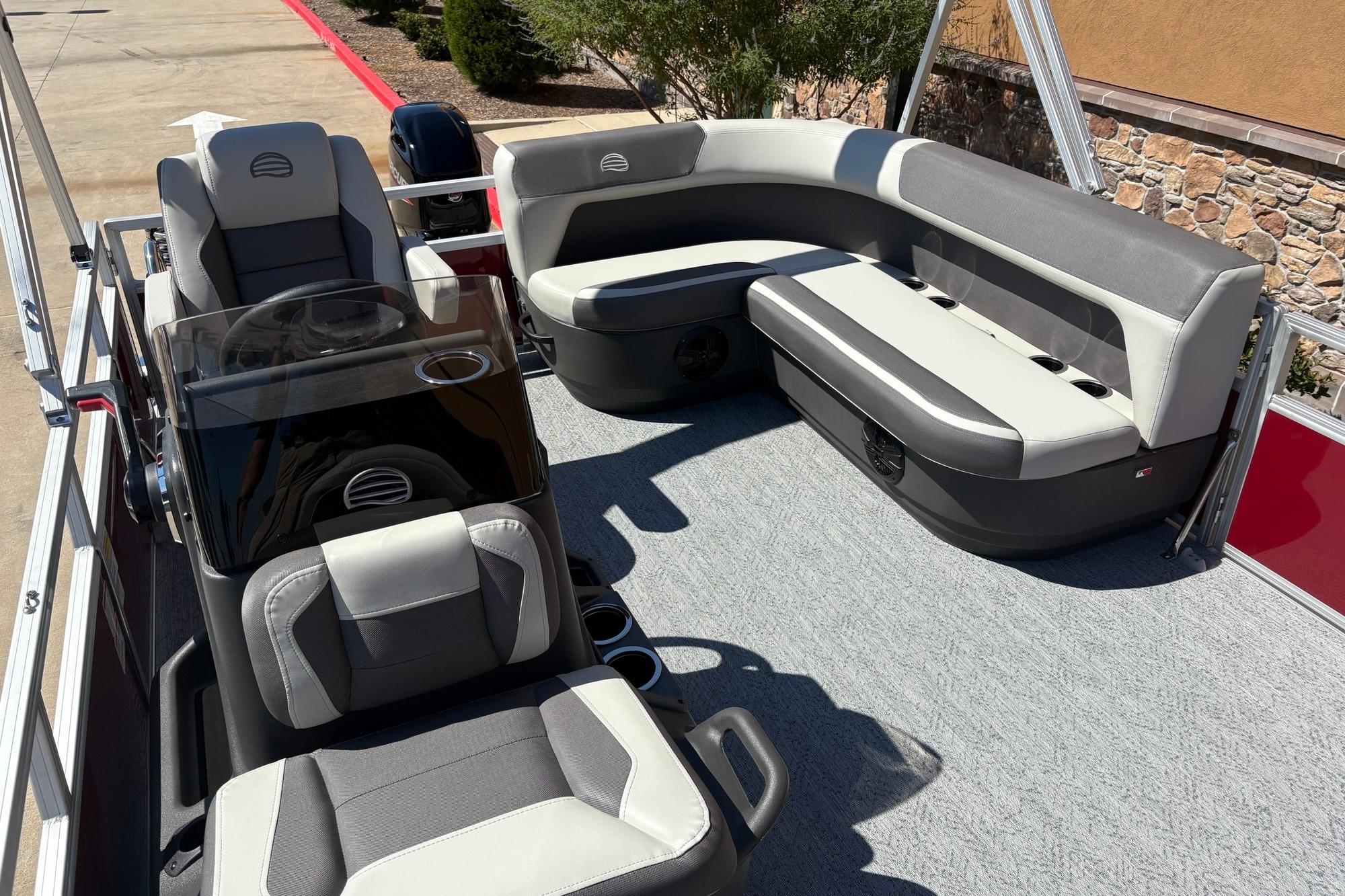 This seven-passenger fishing pontoon hits the water with new console and lounge designs. Get three extra cubic feet of storage thanks to clever backrest cut-outs. The redesign also adds a seat in front of the driver console, phone compartments, and four more cupholders. Cast from the shade of a standard 7' bimini top in one of the two folding fishing seats. Find your spot on the lake from the decked-out driver console, which comes with its own rod holder.
