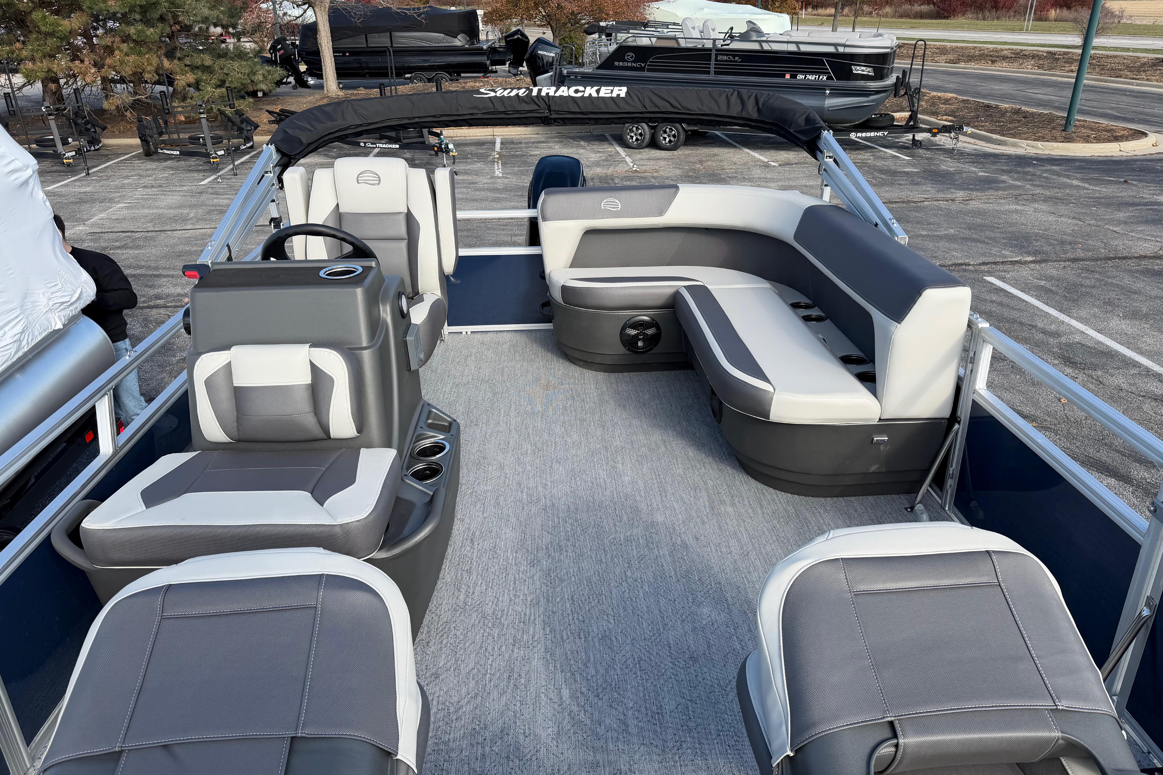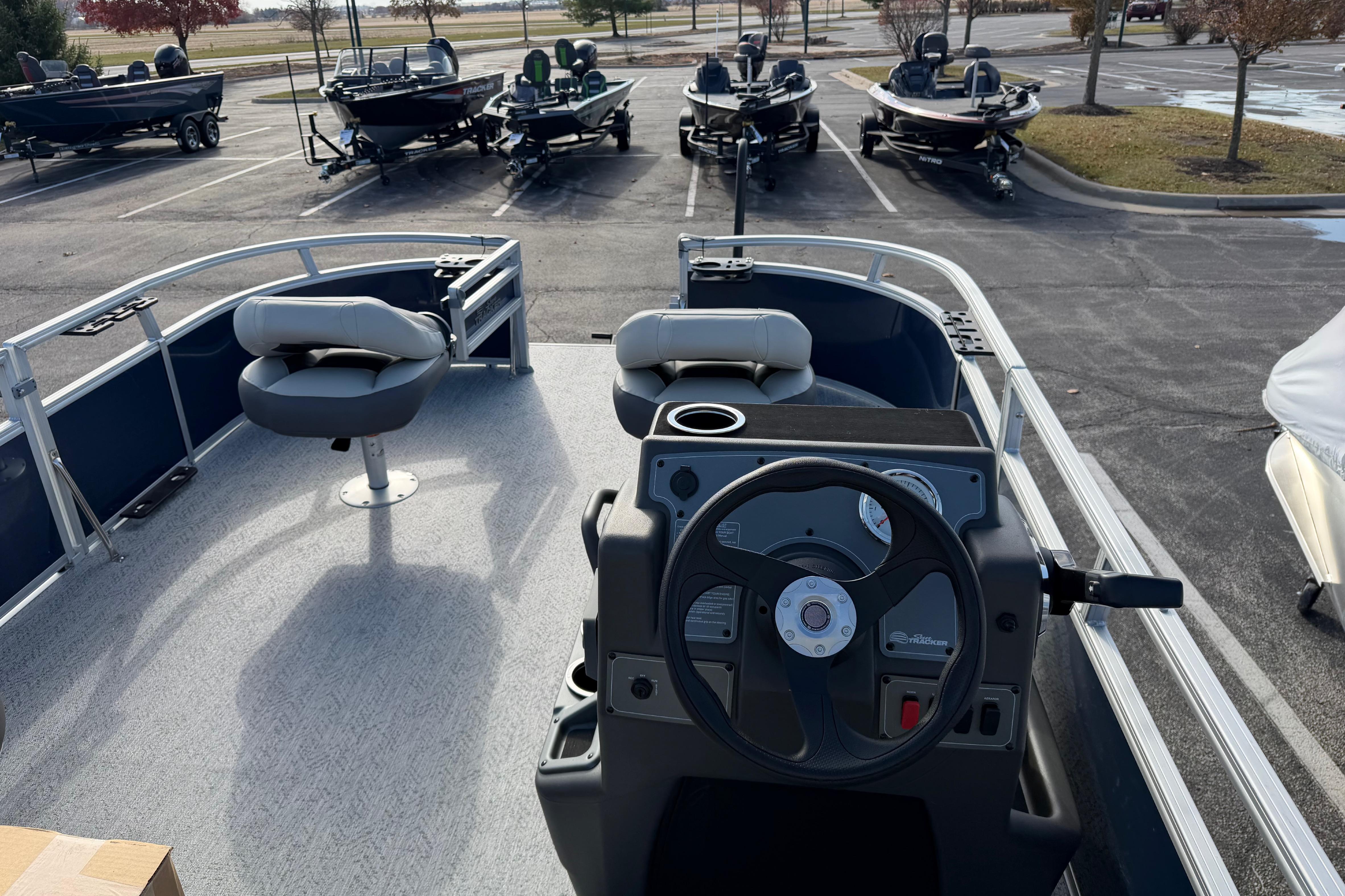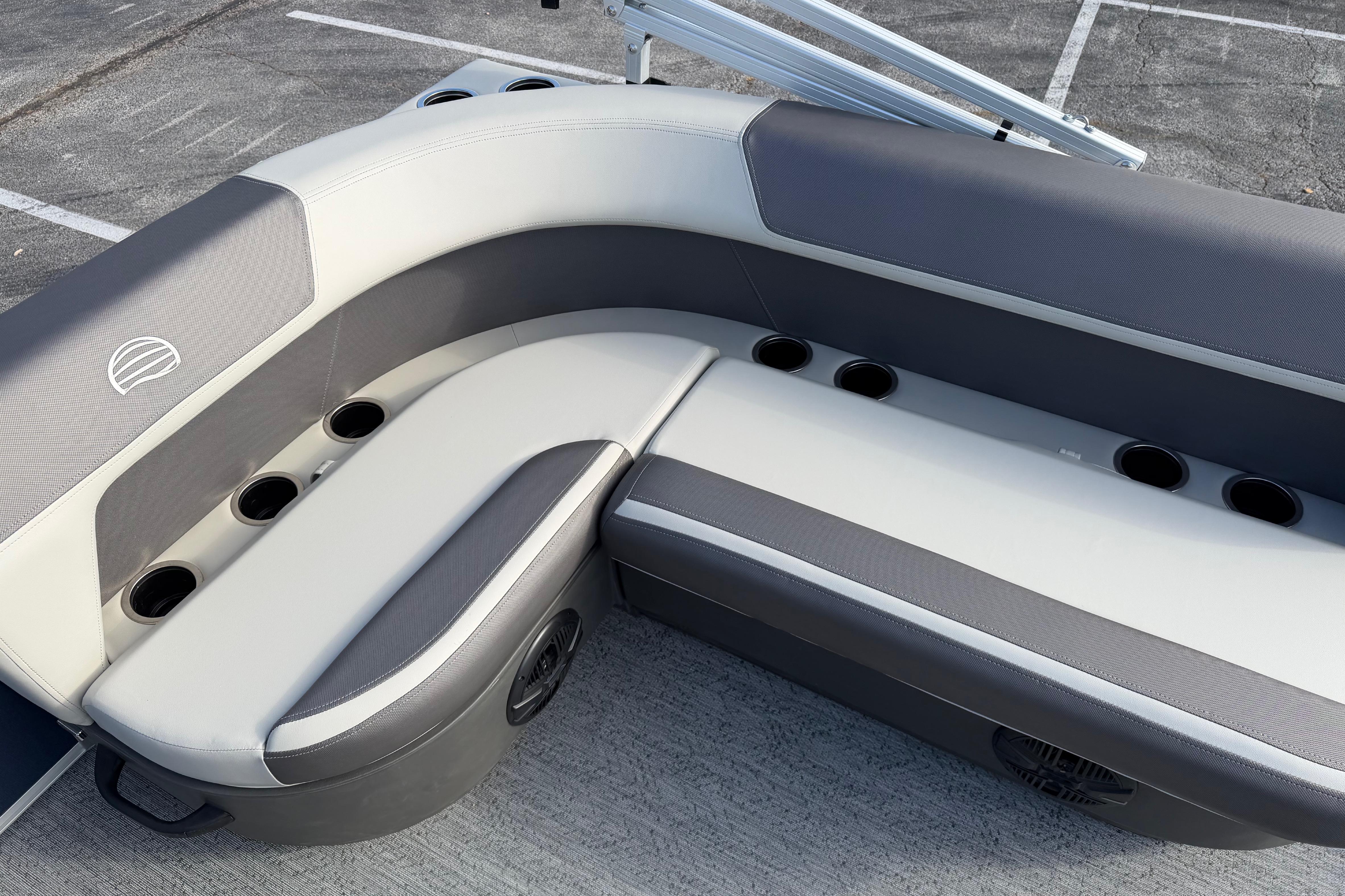 This seven-passenger fishing pontoon hits the water with new console and lounge designs. Get three extra cubic feet of storage thanks to clever backrest cut-outs. The redesign also adds a seat in front of the driver console, phone compartments, and four more cupholders. Cast from the shade of a standard 7' bimini top in one of the two folding fishing seats. Find your spot on the lake from the decked-out driver console, which comes with its own rod holder.