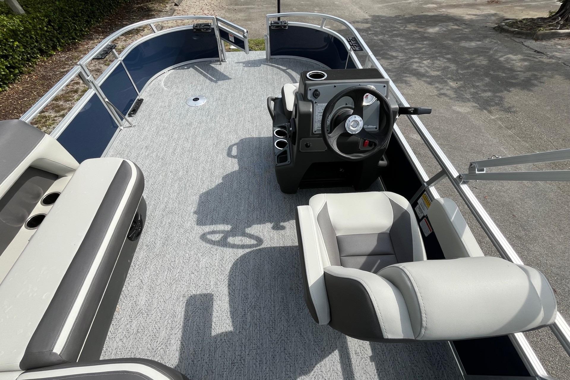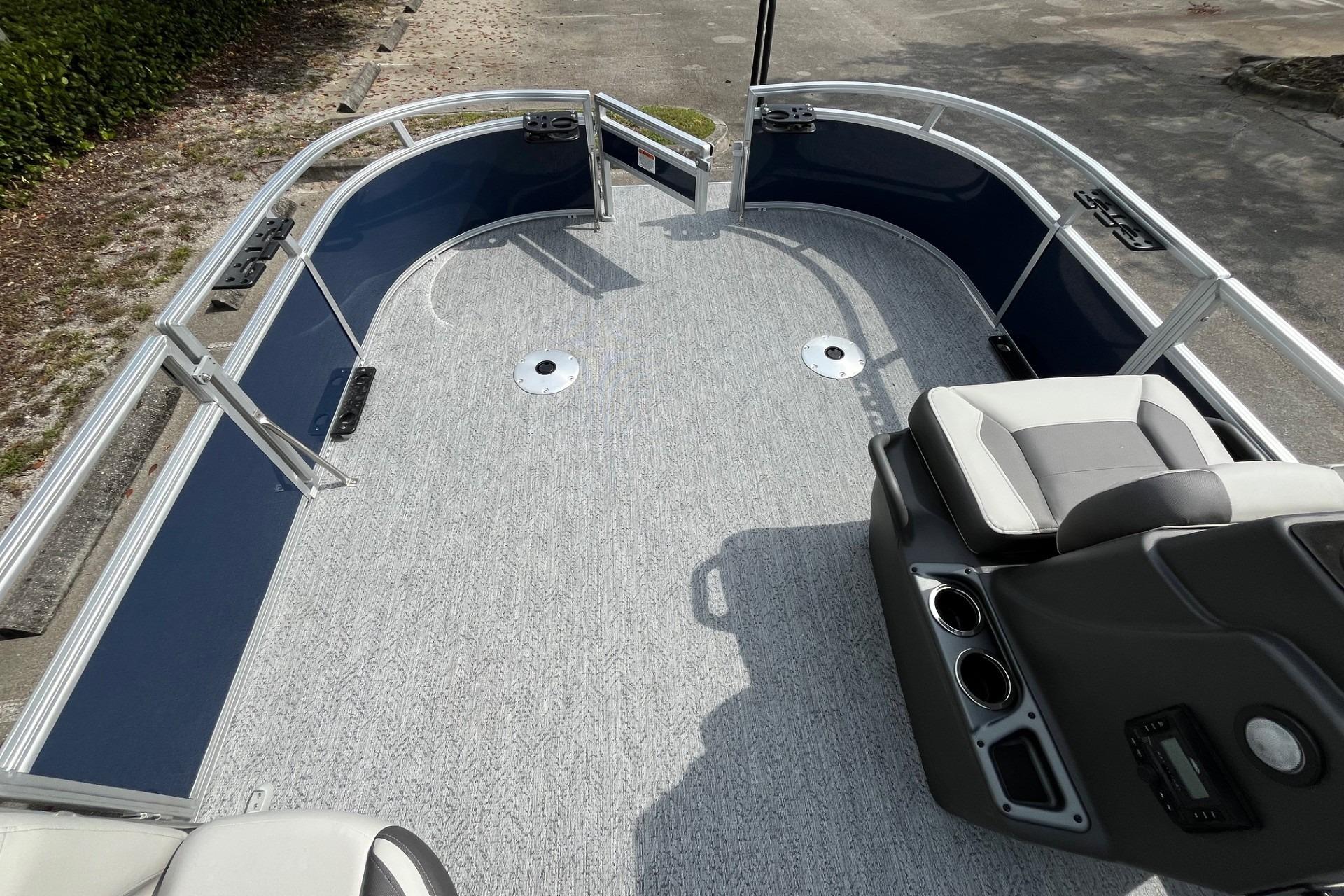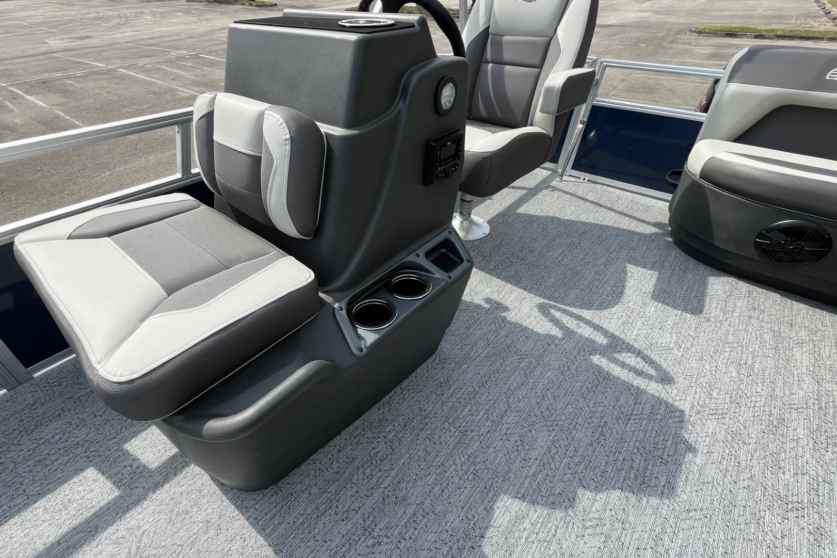 This seven-passenger fishing pontoon hits the water with new console and lounge designs. Get three extra cubic feet of storage thanks to clever backrest cut-outs. The redesign also adds a seat in front of the driver console, phone compartments, and four more cupholders. Cast from the shade of a standard 7' bimini top in one of the two folding fishing seats. Find your spot on the lake from the decked-out driver console, which comes with its own rod holder.