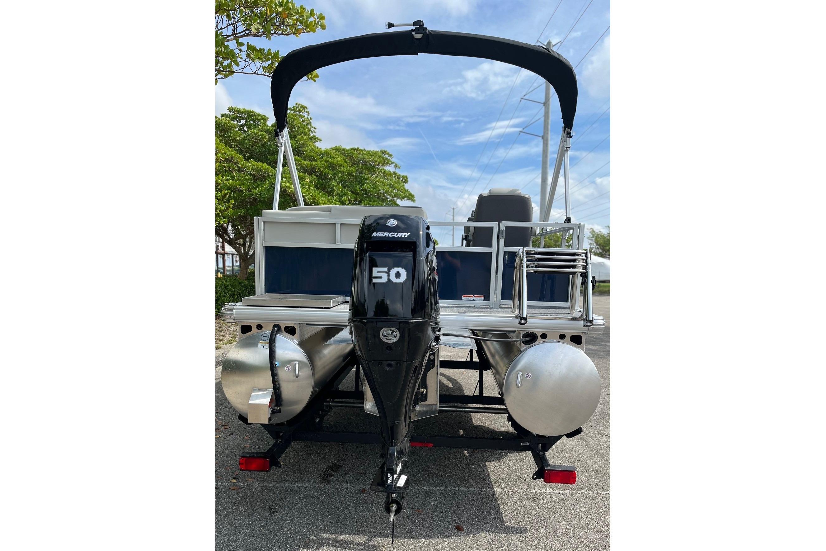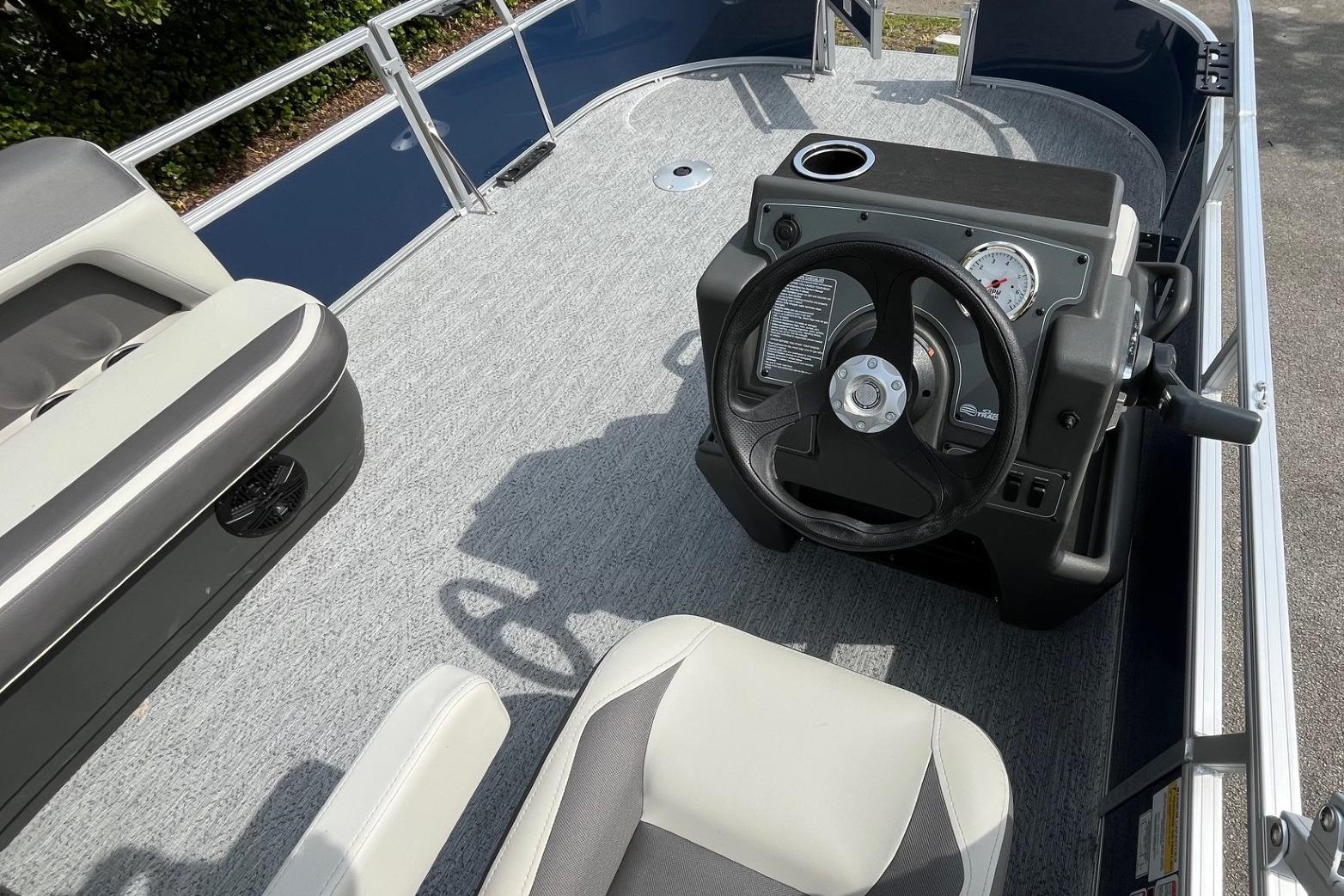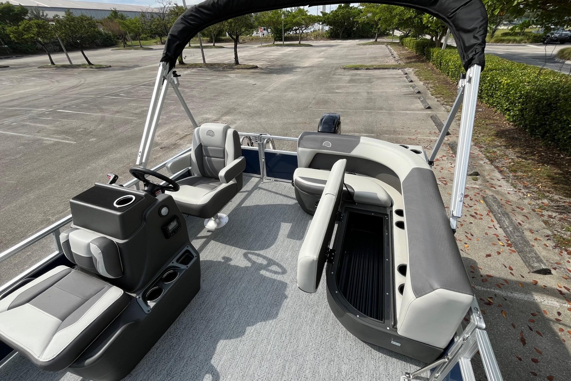 This seven-passenger fishing pontoon hits the water with new console and lounge designs. Get three extra cubic feet of storage thanks to clever backrest cut-outs. The redesign also adds a seat in front of the driver console, phone compartments, and four more cupholders. Cast from the shade of a standard 7' bimini top in one of the two folding fishing seats. Find your spot on the lake from the decked-out driver console, which comes with its own rod holder.