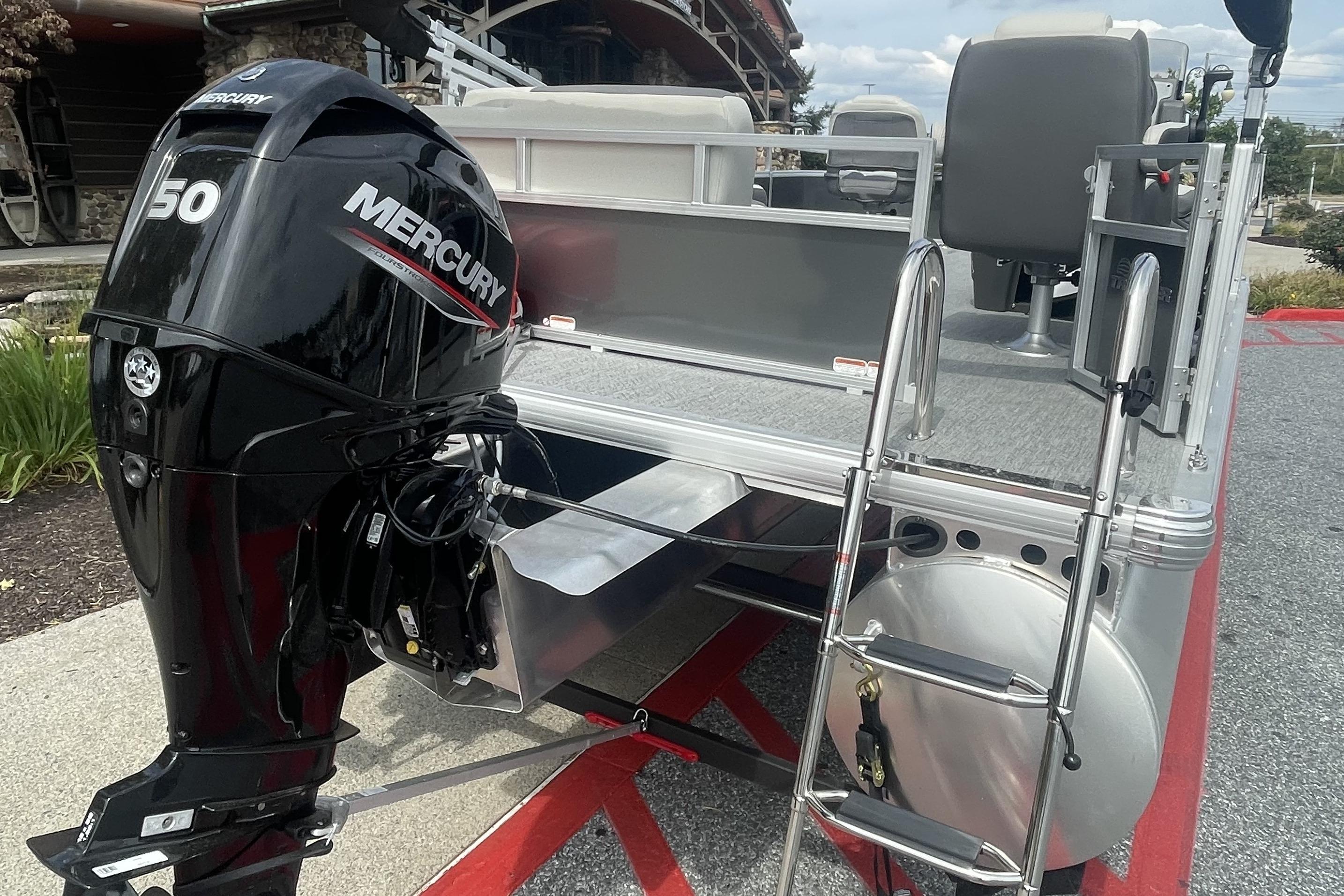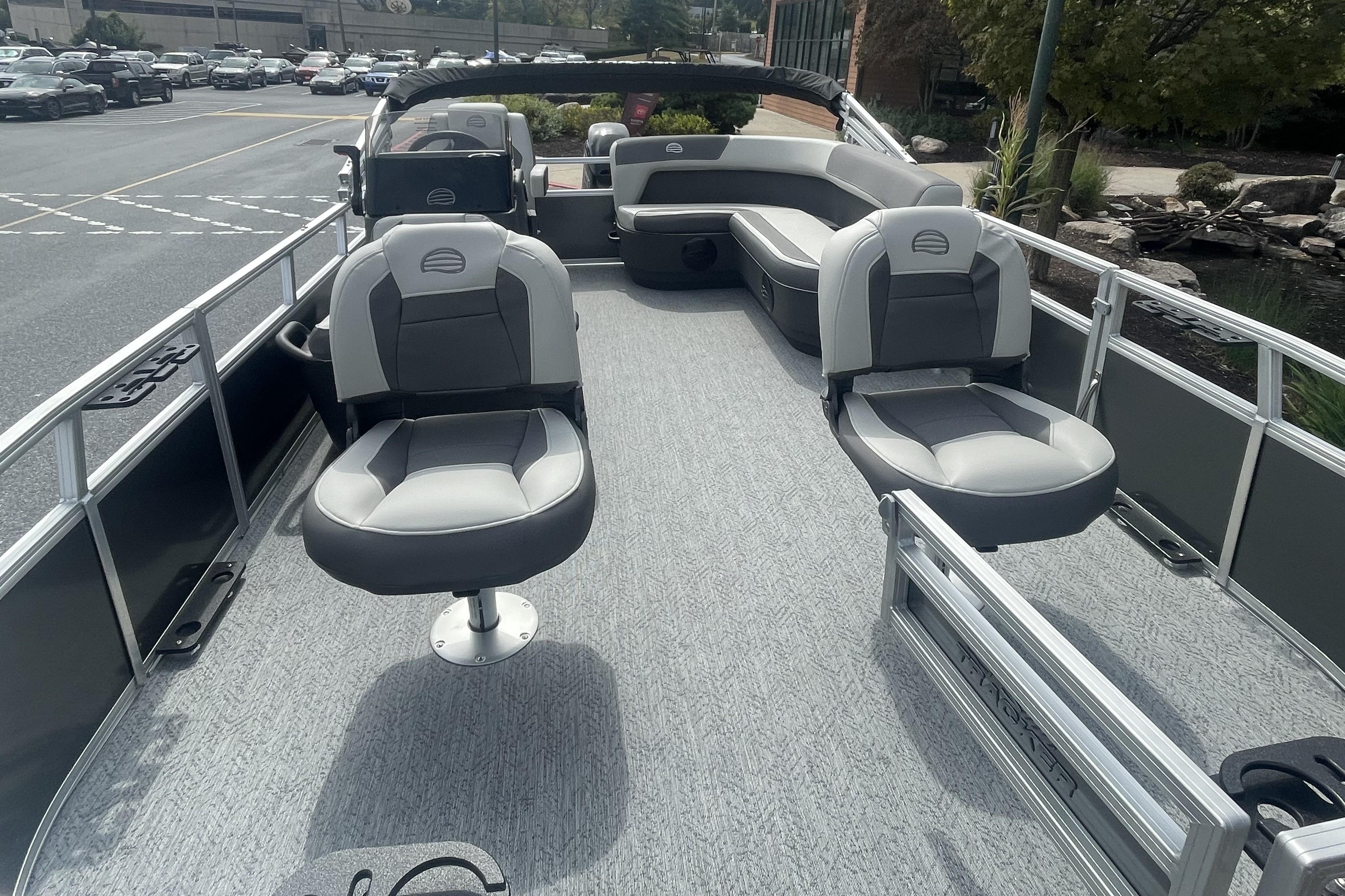 This seven-passenger fishing pontoon hits the water with new console and lounge designs. Get three extra cubic feet of storage thanks to clever backrest cut-outs. The redesign also adds a seat in front of the driver console, phone compartments, and four more cupholders. Cast from the shade of a standard 7' bimini top in one of the two folding fishing seats. Find your spot on the lake from the decked-out driver console, which comes with its own rod holder.
