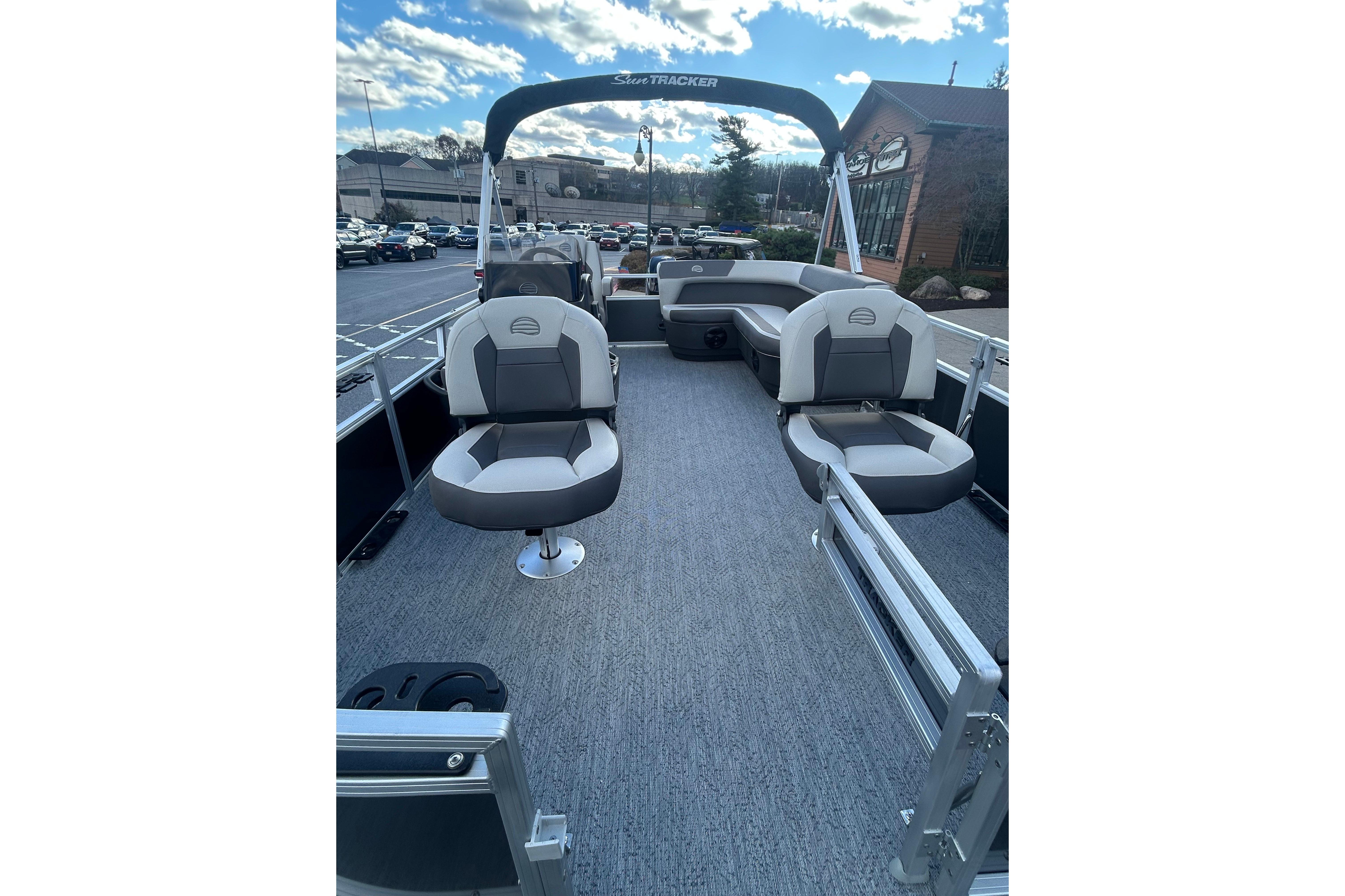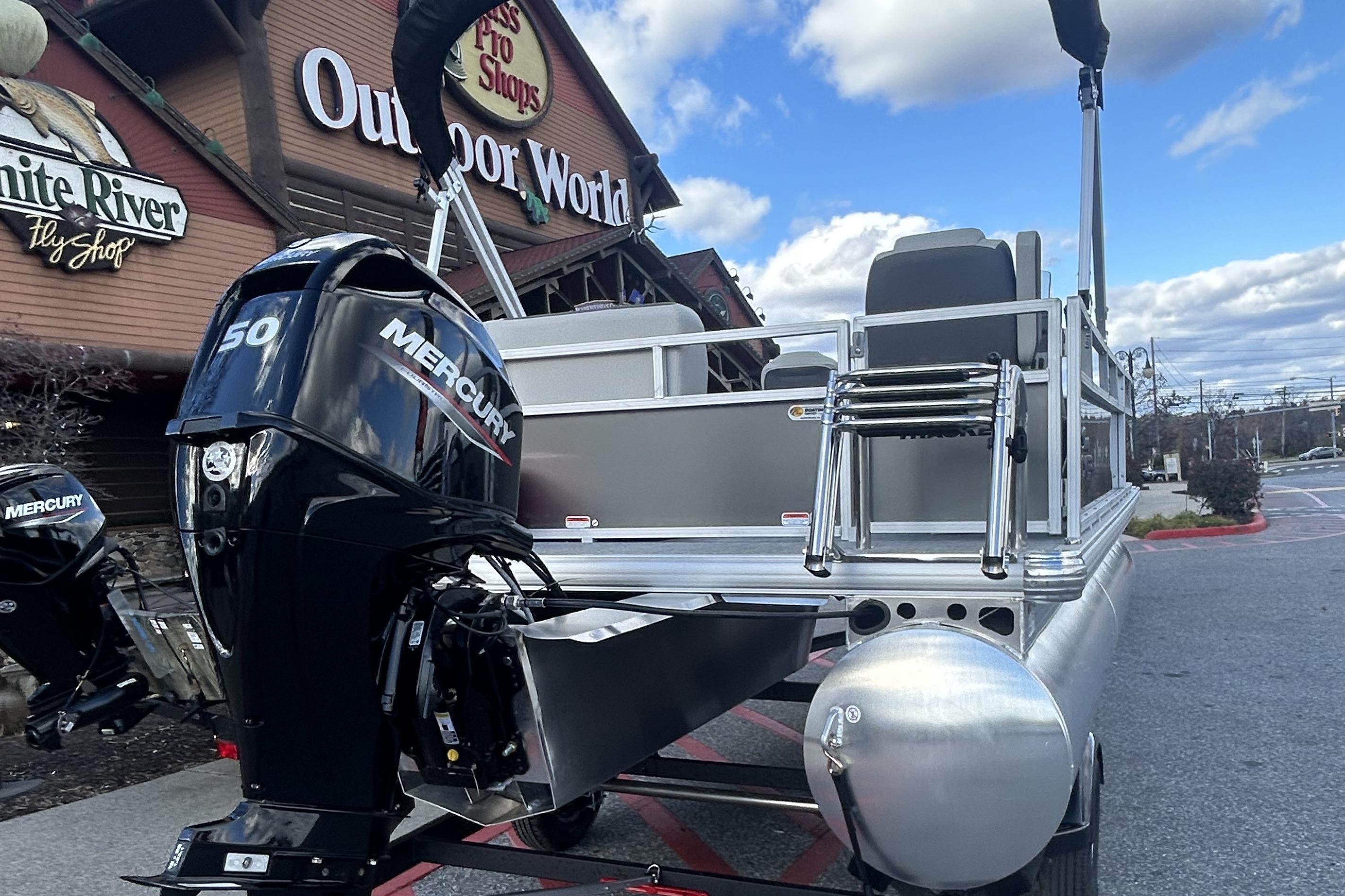 This seven-passenger fishing pontoon hits the water with new console and lounge designs. Get three extra cubic feet of storage thanks to clever backrest cut-outs. The redesign also adds a seat in front of the driver console, phone compartments, and four more cupholders. Cast from the shade of a standard 7' bimini top in one of the two folding fishing seats. Find your spot on the lake from the decked-out driver console, which comes with its own rod holder.