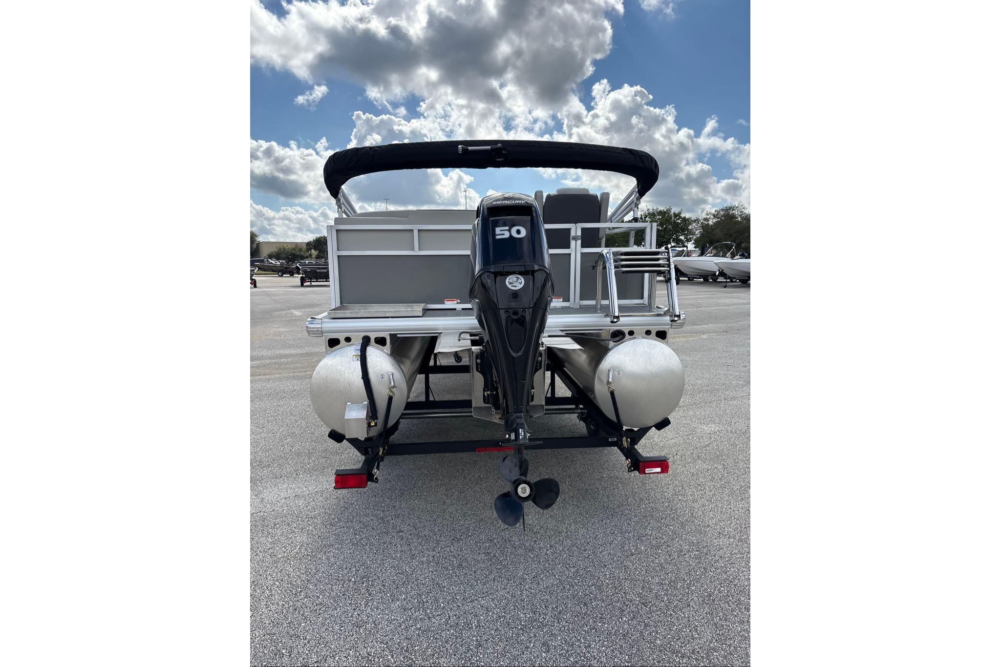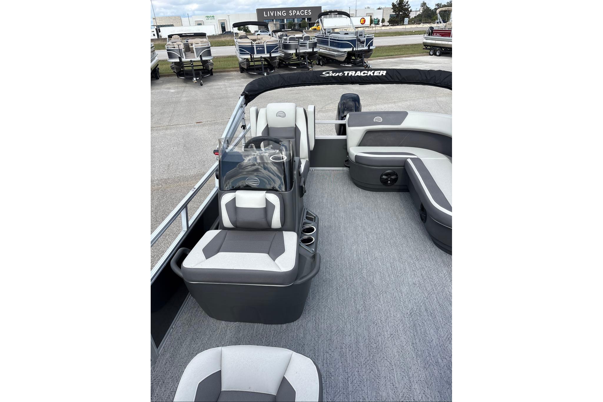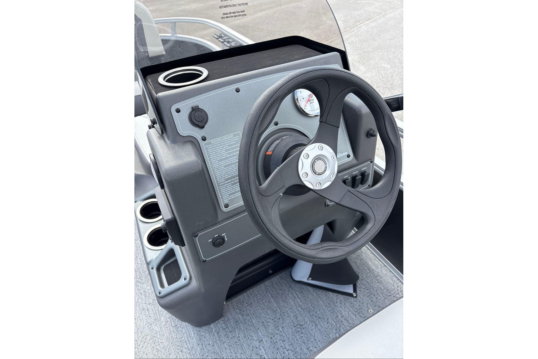 This seven-passenger fishing pontoon hits the water with new console and lounge designs. Get three extra cubic feet of storage thanks to clever backrest cut-outs. The redesign also adds a seat in front of the driver console, phone compartments, and four more cupholders. Cast from the shade of a standard 7' bimini top in one of the two folding fishing seats. Find your spot on the lake from the decked-out driver console, which comes with its own rod holder.