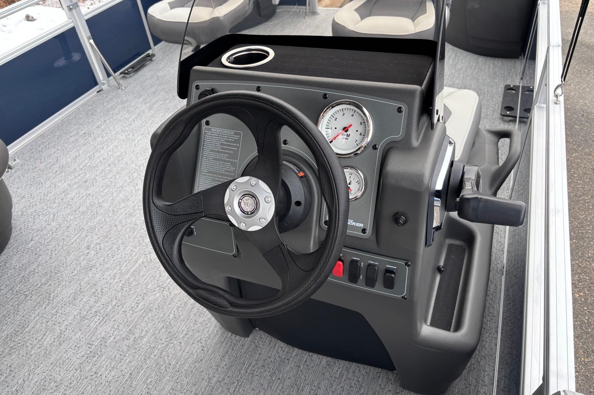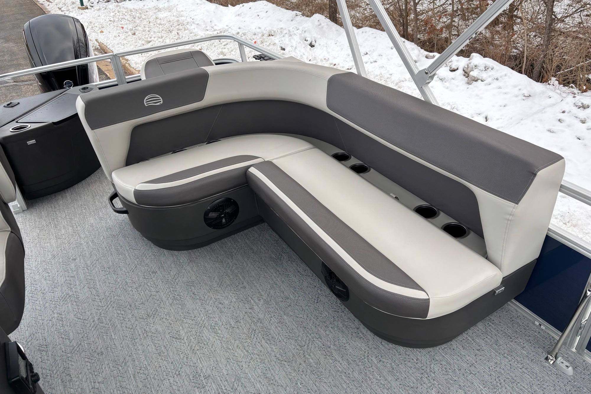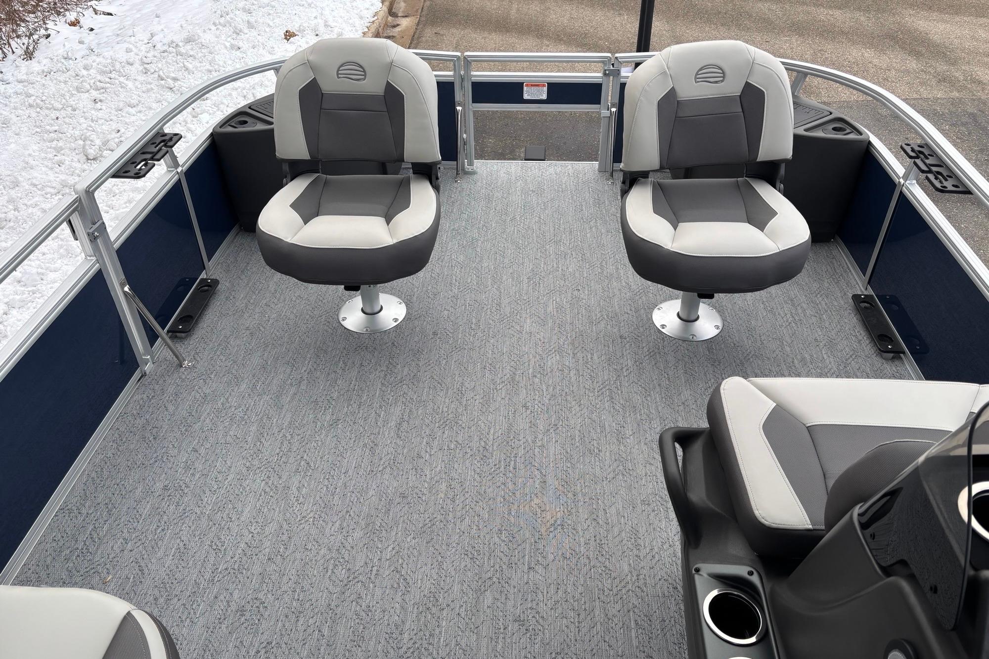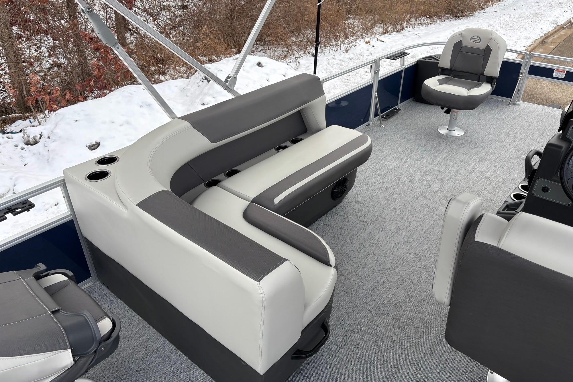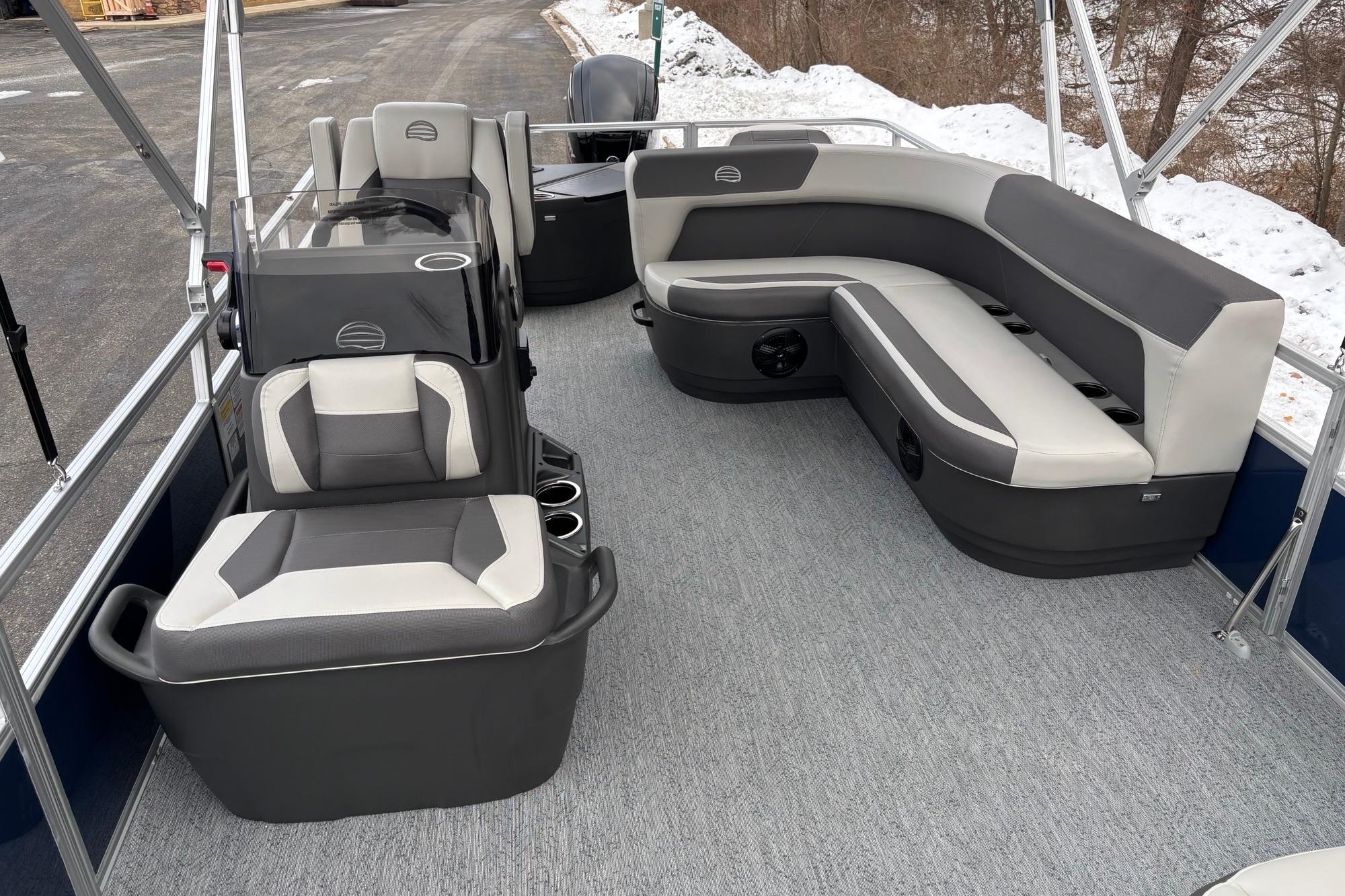 Up to eight fishin' buddies can take to the dual fishing decks of this redesigned fishin' pontoon. Three swiveling fishing chairs around a 10-gal. bow livewell and an 8-gal. aft livewell headline the list of features that make this the perfect boat for casting lines to catch fish and memories. When the fishing's done, sprawl out on the L-shaped lounge and crank up the stereo. The new and improved boarding ladder makes follow-up cannonballs a breeze. Other features new to the 2026 model year include three extra cubic feet of storage space, more cupholders, in-lounge storage, and a new seat in front of the helm.