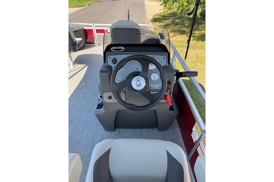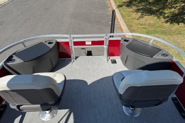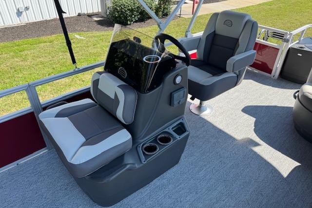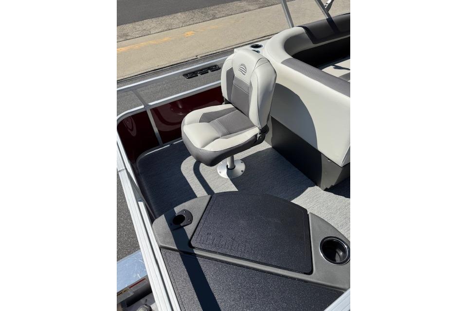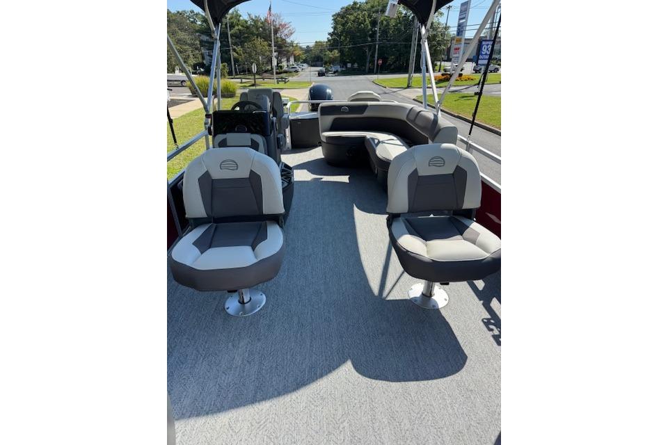 Up to eight fishin' buddies can take to the dual fishing decks of this redesigned fishin' pontoon. Three swiveling fishing chairs around a 10-gal. bow livewell and an 8-gal. aft livewell headline the list of features that make this the perfect boat for casting lines to catch fish and memories. When the fishing's done, sprawl out on the L-shaped lounge and crank up the stereo. The new and improved boarding ladder makes follow-up cannonballs a breeze. Other features new to the 2026 model year include three extra cubic feet of storage space, more cupholders, in-lounge storage, and a new seat in front of the helm.