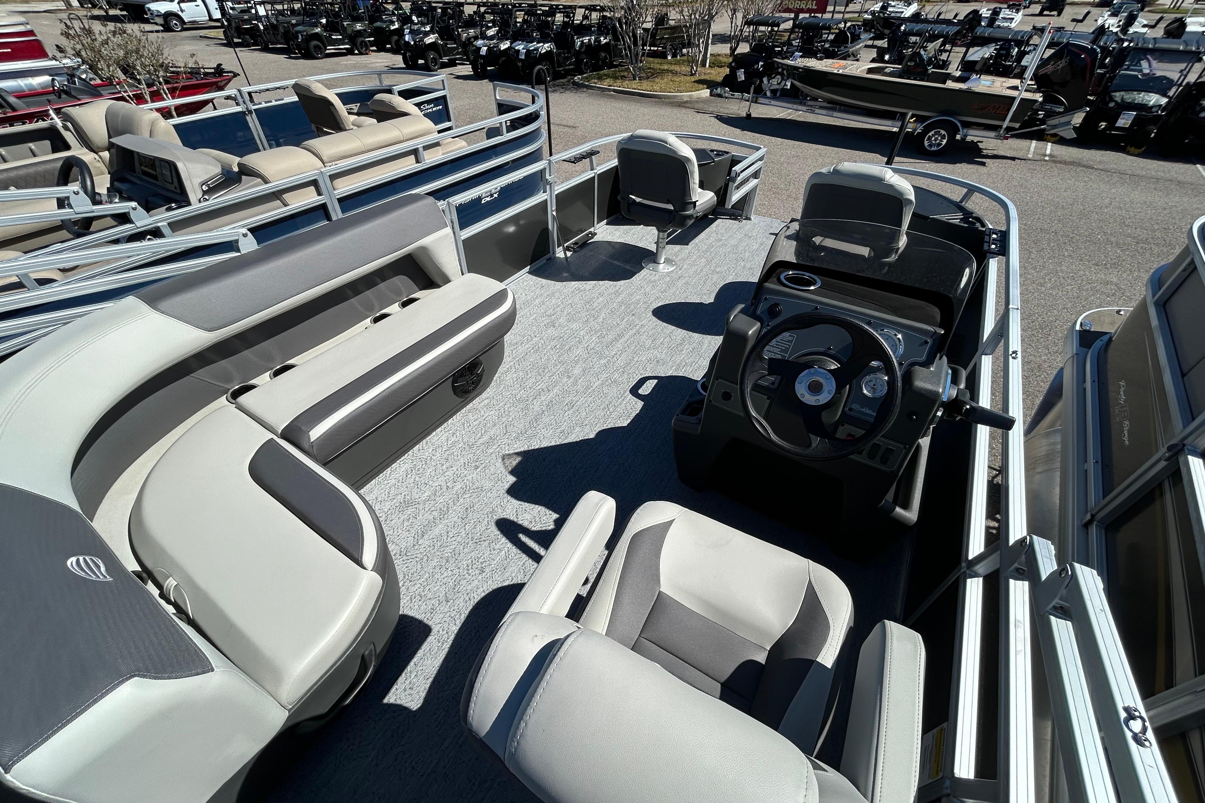 Up to eight fishin' buddies can take to the dual fishing decks of this redesigned fishin' pontoon. Three swiveling fishing chairs around a 10-gal. bow livewell and an 8-gal. aft livewell headline the list of features that make this the perfect boat for casting lines to catch fish and memories. When the fishing's done, sprawl out on the L-shaped lounge and crank up the stereo. The new and improved boarding ladder makes follow-up cannonballs a breeze. Other features new to the 2026 model year include three extra cubic feet of storage space, more cupholders, in-lounge storage, and a new seat in front of the helm.