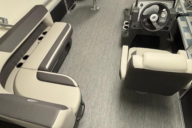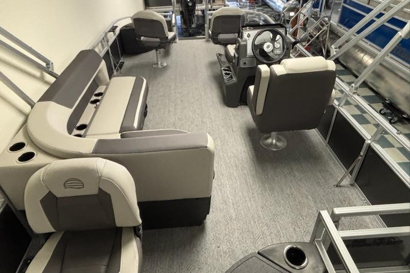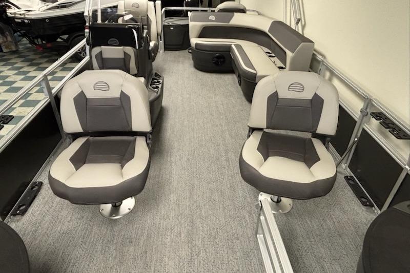 Up to eight fishin' buddies can take to the dual fishing decks of this redesigned fishin' pontoon. Three swiveling fishing chairs around a 10-gal. bow livewell and an 8-gal. aft livewell headline the list of features that make this the perfect boat for casting lines to catch fish and memories. When the fishing's done, sprawl out on the L-shaped lounge and crank up the stereo. The new and improved boarding ladder makes follow-up cannonballs a breeze. Other features new to the 2026 model year include three extra cubic feet of storage space, more cupholders, in-lounge storage, and a new seat in front of the helm.