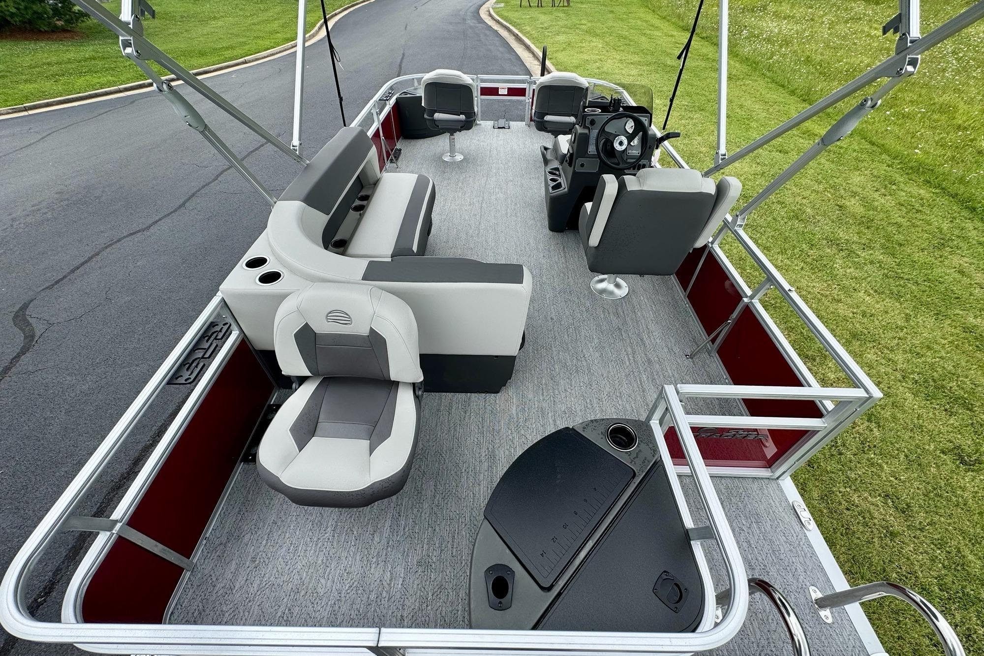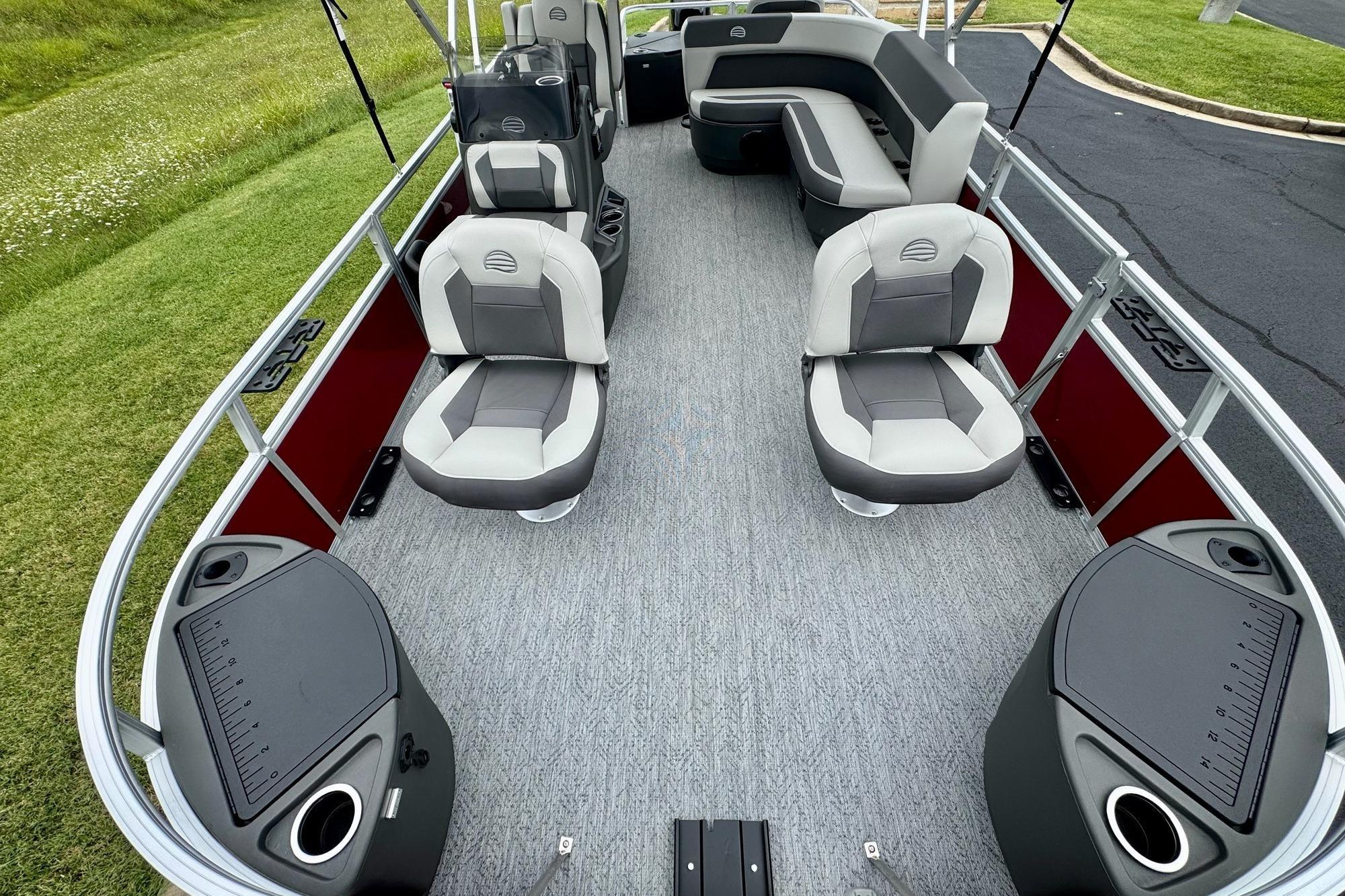 Up to eight fishin' buddies can take to the dual fishing decks of this redesigned fishin' pontoon. Three swiveling fishing chairs around a 10-gal. bow livewell and an 8-gal. aft livewell headline the list of features that make this the perfect boat for casting lines to catch fish and memories. When the fishing's done, sprawl out on the L-shaped lounge and crank up the stereo. The new and improved boarding ladder makes follow-up cannonballs a breeze. Other features new to the 2026 model year include three extra cubic feet of storage space, more cupholders, in-lounge storage, and a new seat in front of the helm.