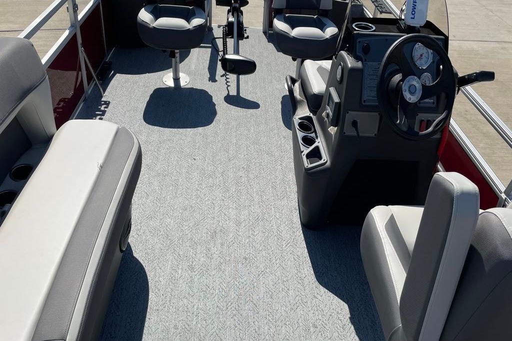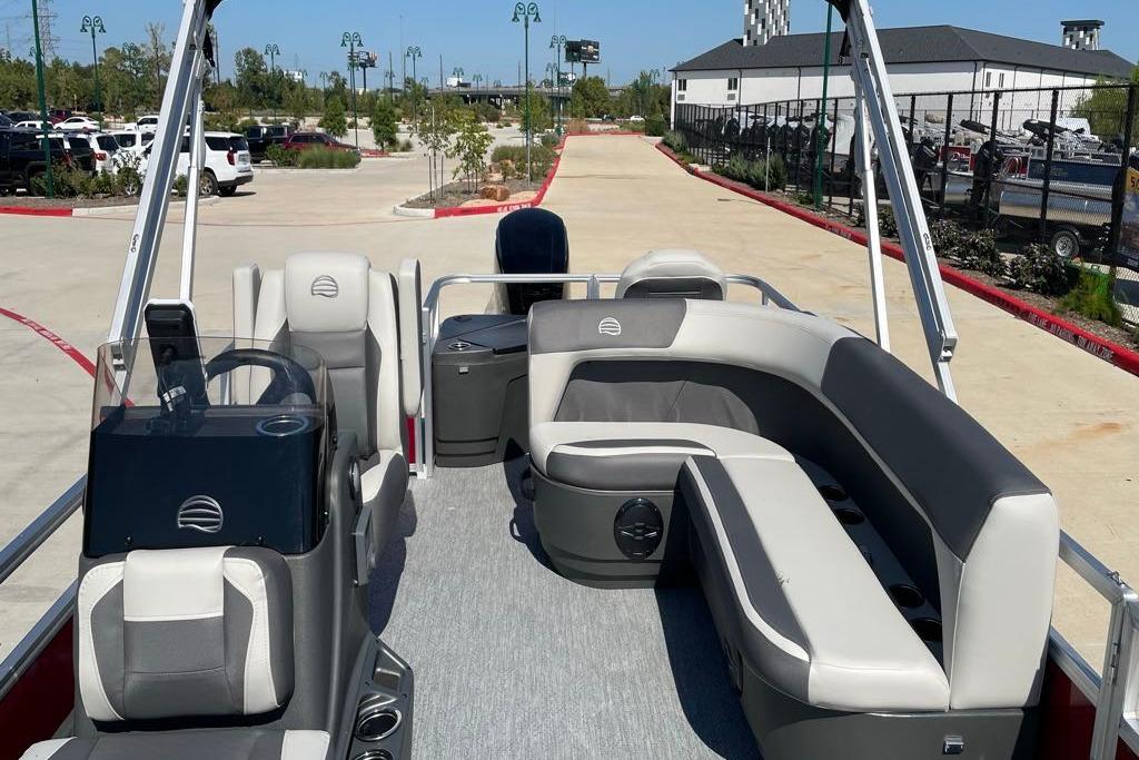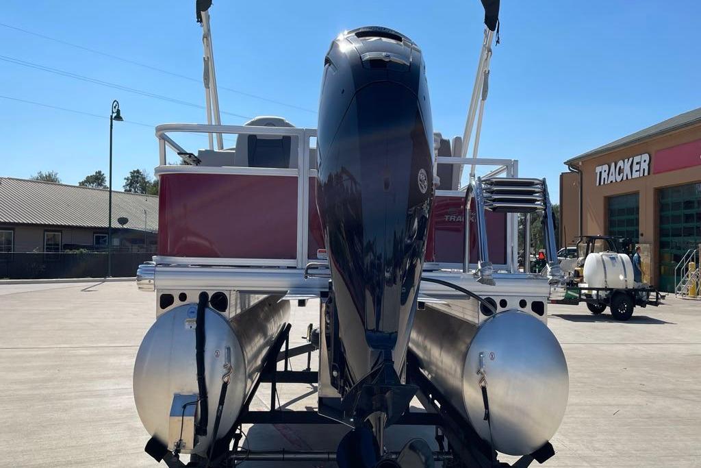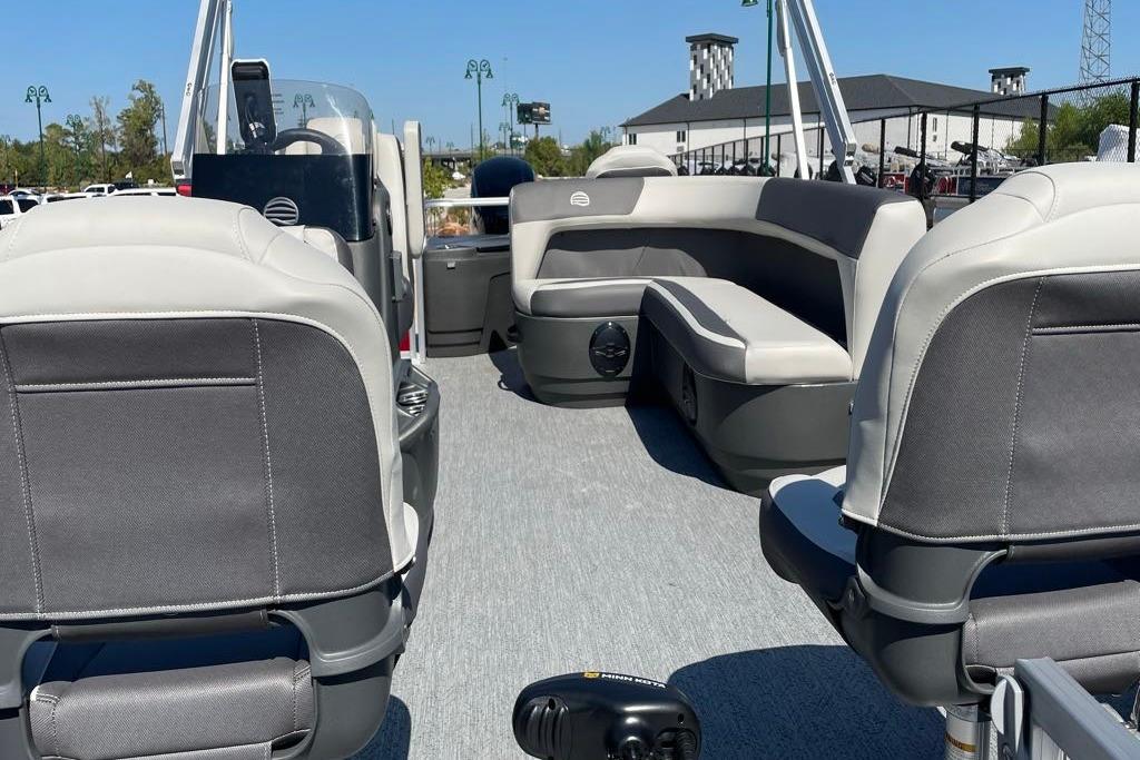 Up to eight fishin' buddies can take to the dual fishing decks of this redesigned fishin' pontoon. Three swiveling fishing chairs around a 10-gal. bow livewell and an 8-gal. aft livewell headline the list of features that make this the perfect boat for casting lines to catch fish and memories. When the fishing's done, sprawl out on the L-shaped lounge and crank up the stereo. The new and improved boarding ladder makes follow-up cannonballs a breeze. Other features new to the 2026 model year include three extra cubic feet of storage space, more cupholders, in-lounge storage, and a new seat in front of the helm.