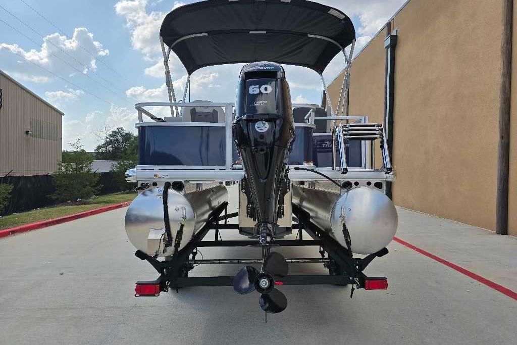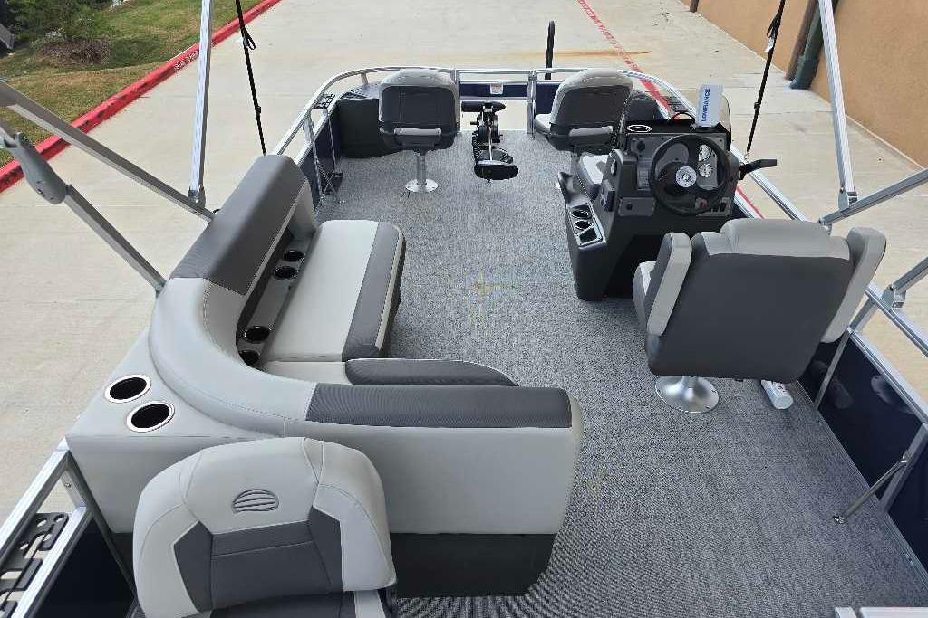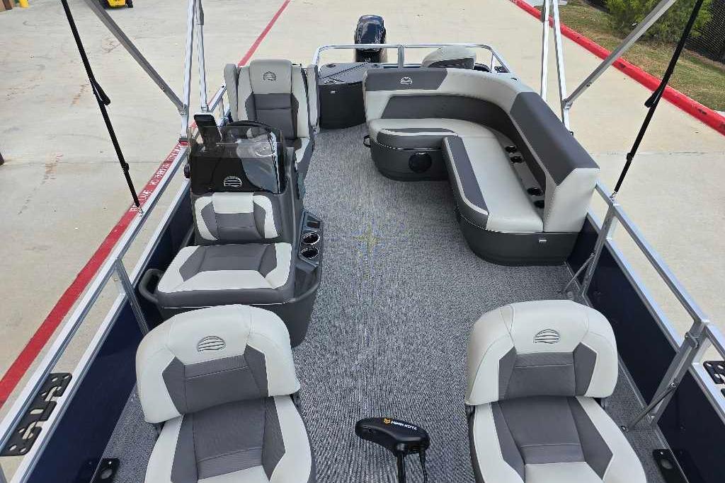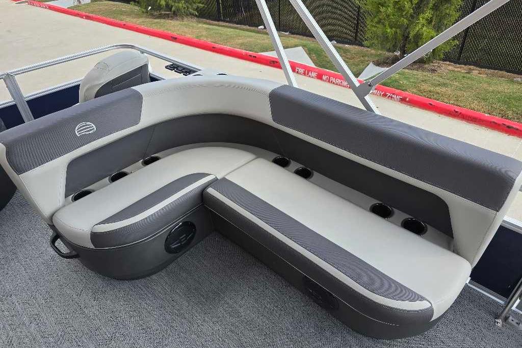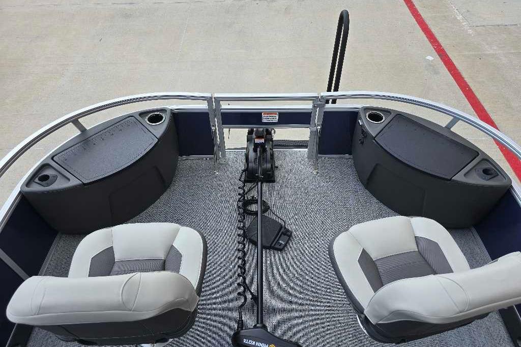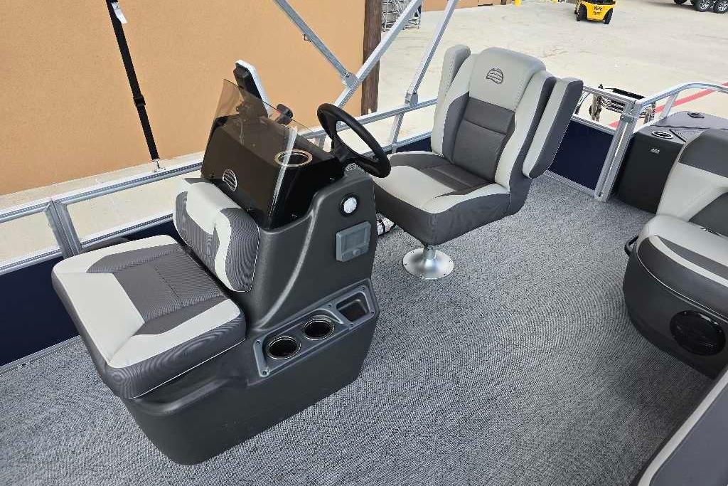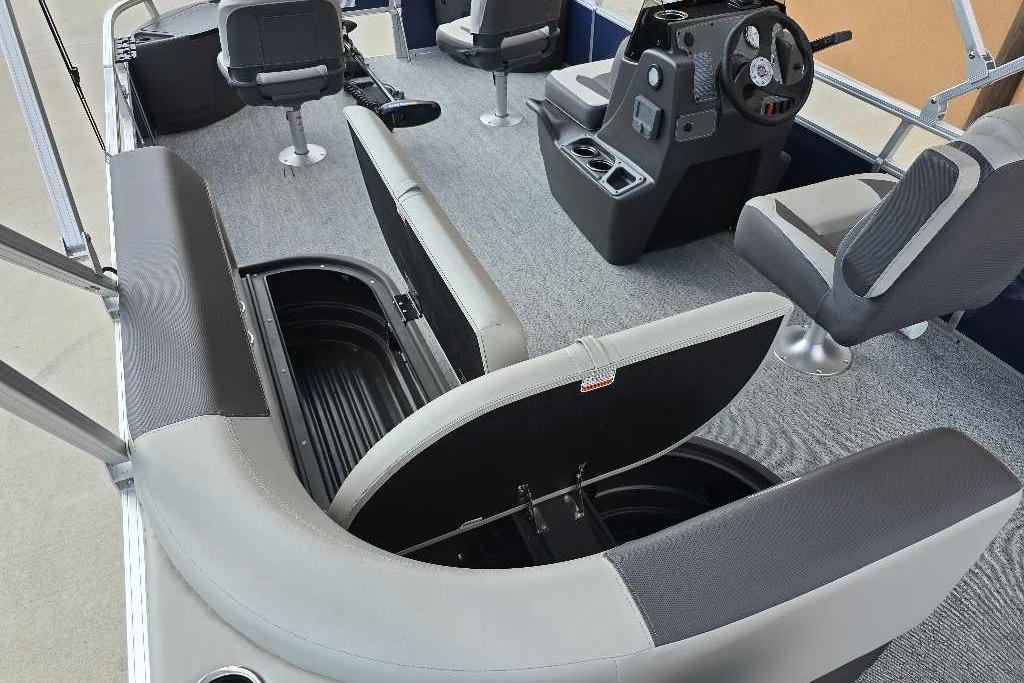 Up to eight fishin' buddies can take to the dual fishing decks of this redesigned fishin' pontoon. Three swiveling fishing chairs around a 10-gal. bow livewell and an 8-gal. aft livewell headline the list of features that make this the perfect boat for casting lines to catch fish and memories. When the fishing's done, sprawl out on the L-shaped lounge and crank up the stereo. The new and improved boarding ladder makes follow-up cannonballs a breeze. Other features new to the 2026 model year include three extra cubic feet of storage space, more cupholders, in-lounge storage, and a new seat in front of the helm.