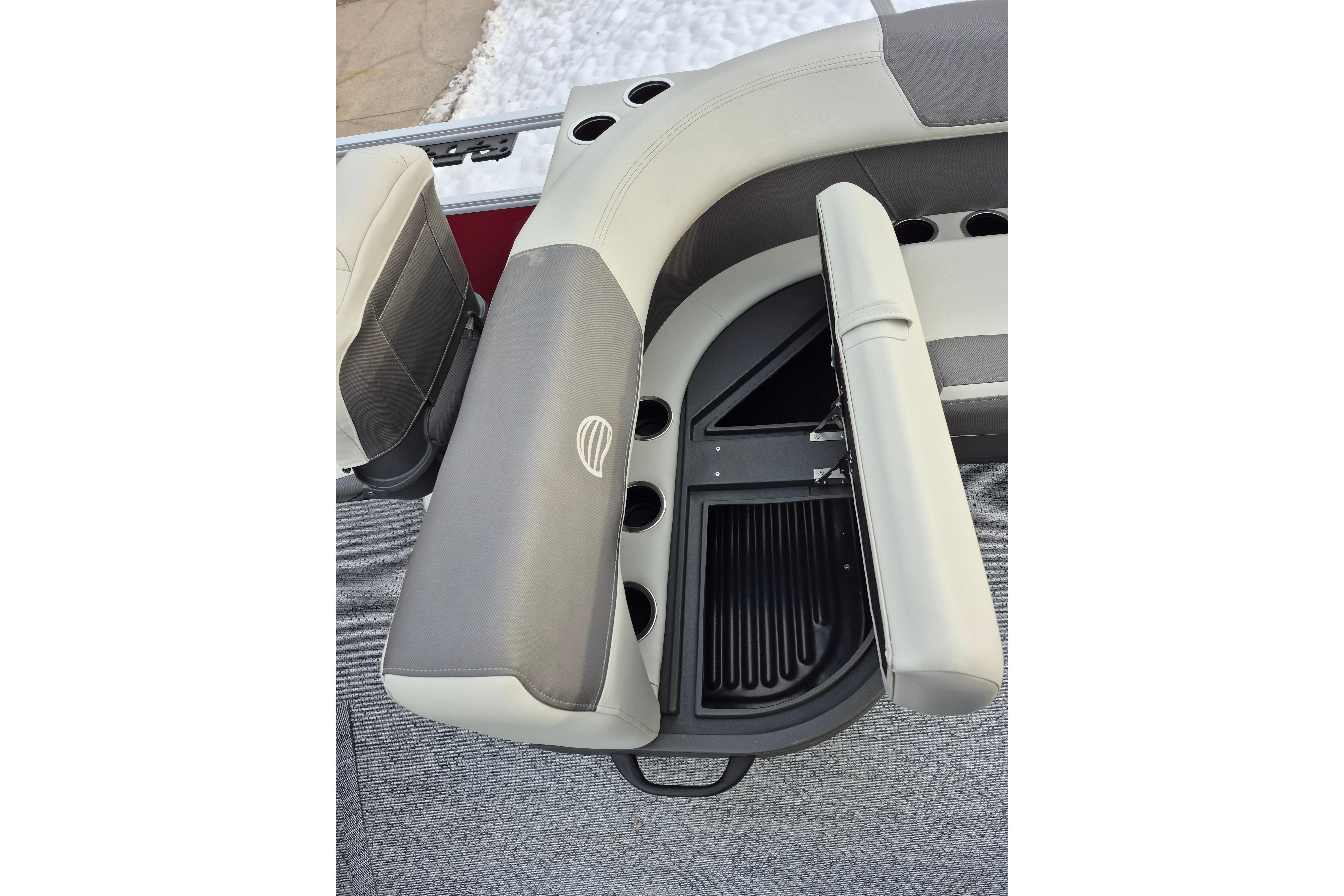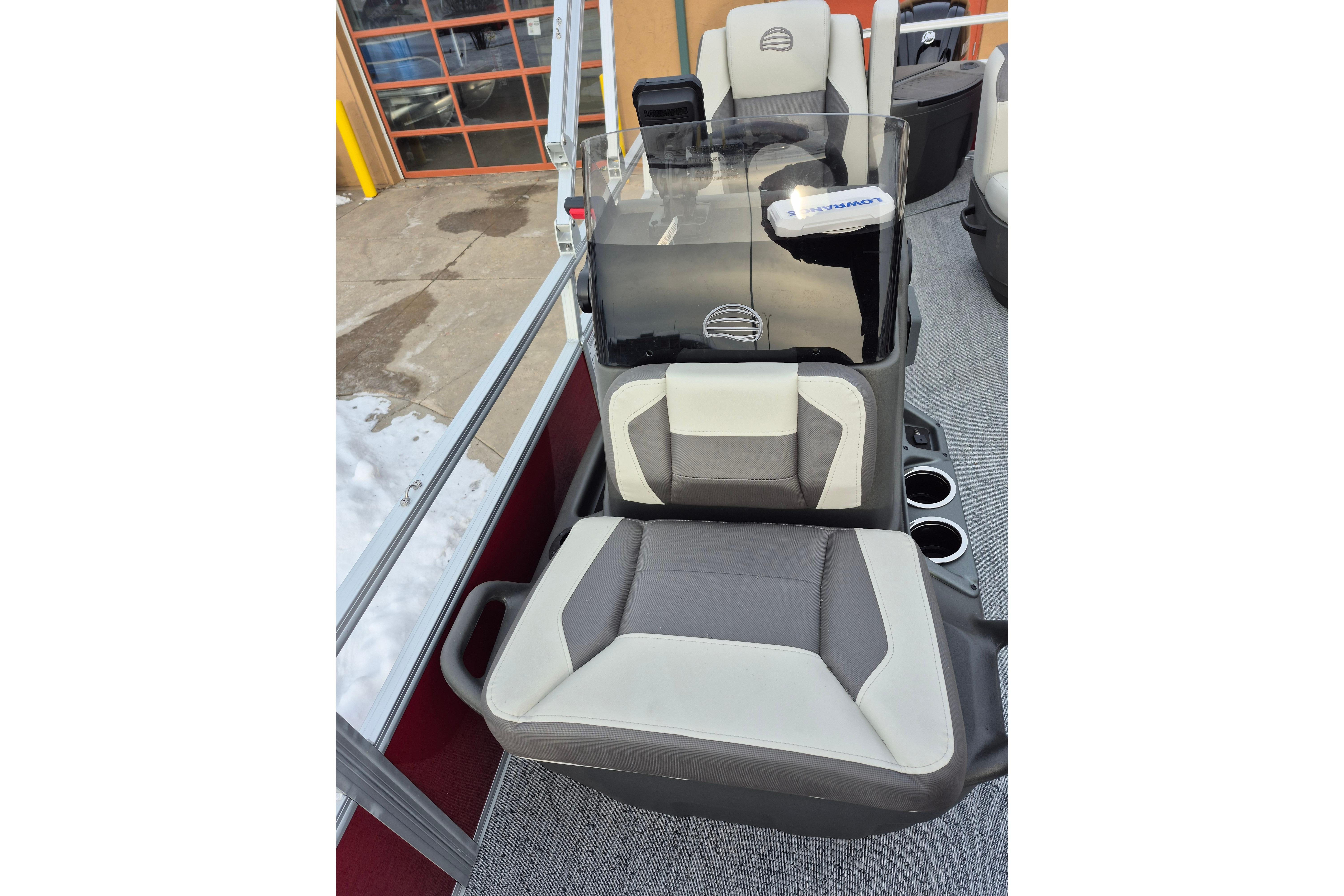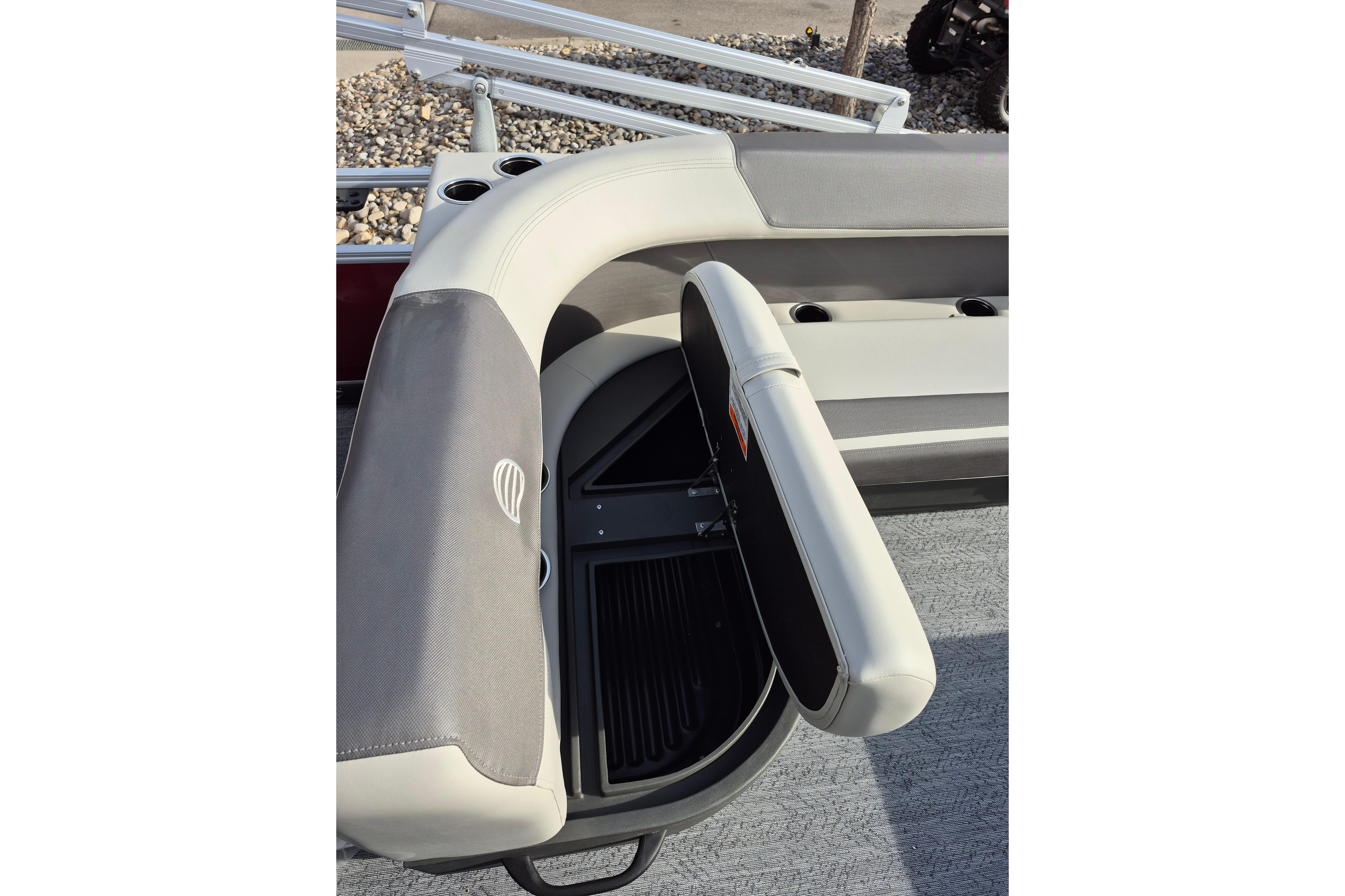 Up to eight fishin' buddies can take to the dual fishing decks of this redesigned fishin' pontoon. Three swiveling fishing chairs around a 10-gal. bow livewell and an 8-gal. aft livewell headline the list of features that make this the perfect boat for casting lines to catch fish and memories. When the fishing's done, sprawl out on the L-shaped lounge and crank up the stereo. The new and improved boarding ladder makes follow-up cannonballs a breeze. Other features new to the 2026 model year include three extra cubic feet of storage space, more cupholders, in-lounge storage, and a new seat in front of the helm.