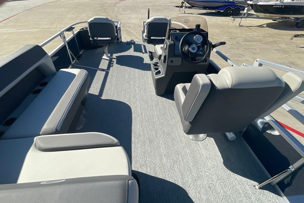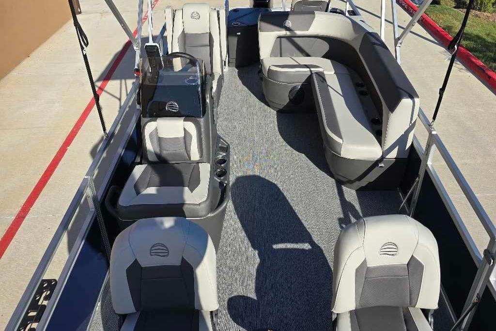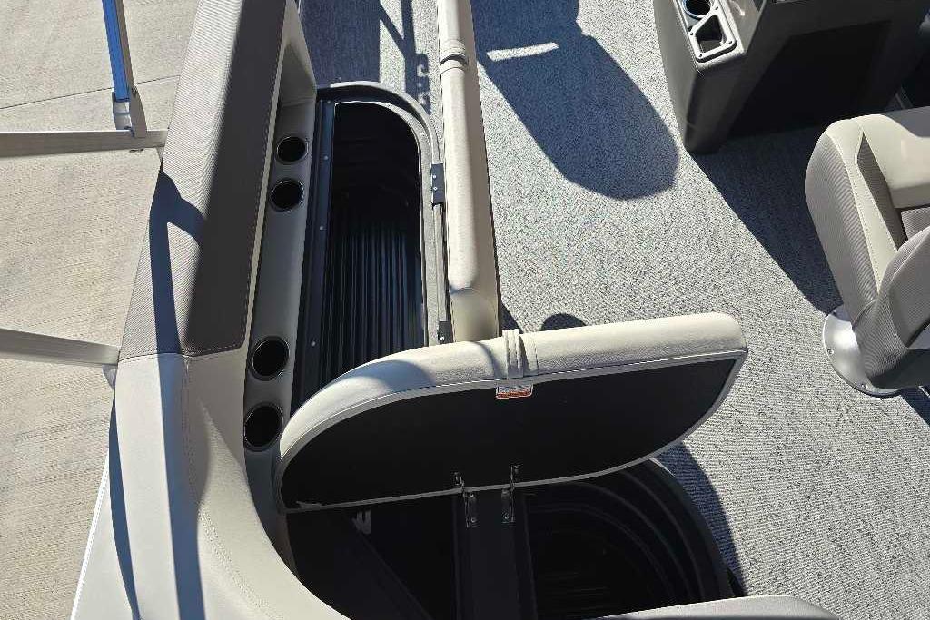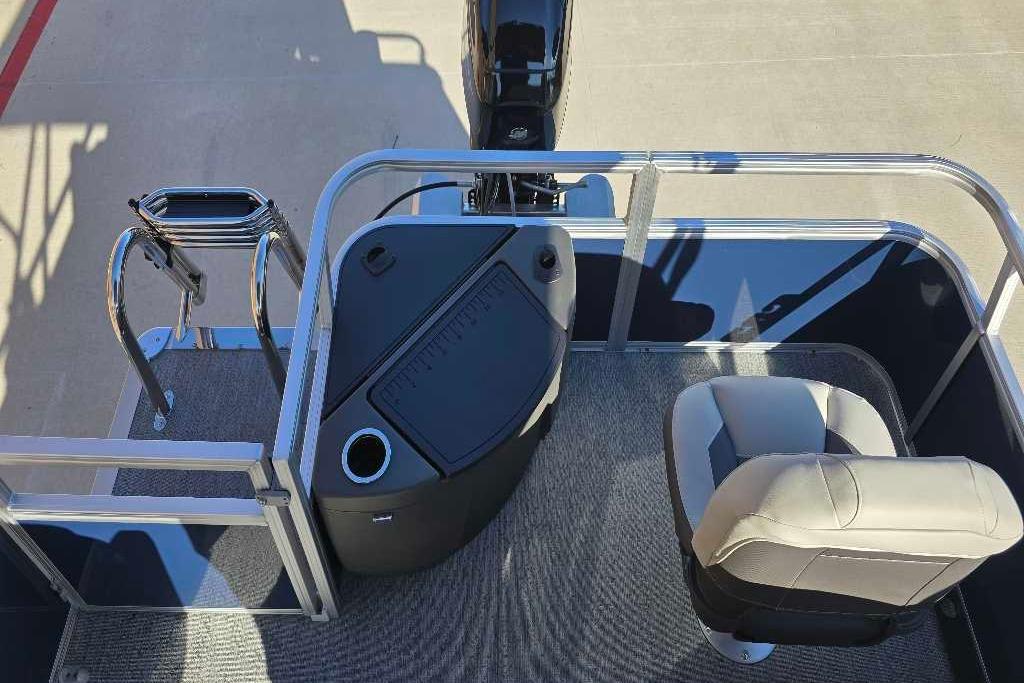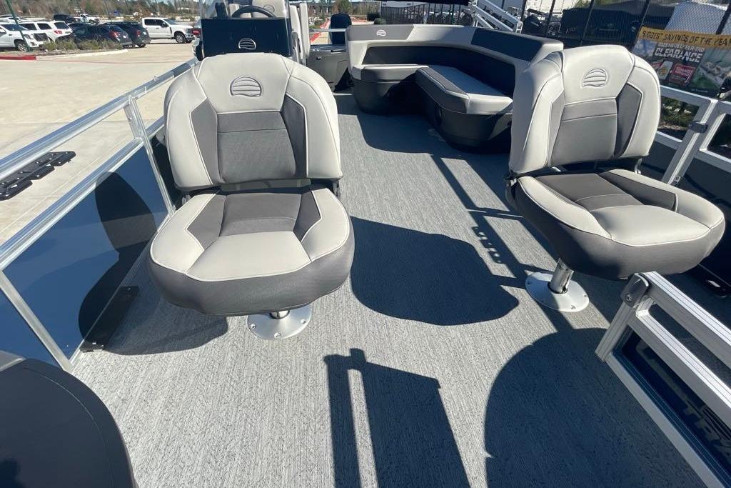Up to eight fishin' buddies can take to the dual fishing decks of this redesigned fishin' pontoon. Three swiveling fishing chairs around a 10-gal. bow livewell and an 8-gal. aft livewell headline the list of features that make this the perfect boat for casting lines to catch fish and memories. When the fishing's done, sprawl out on the L-shaped lounge and crank up the stereo. The new and improved boarding ladder makes follow-up cannonballs a breeze. Other features new to the 2026 model year include three extra cubic feet of storage space, more cupholders, in-lounge storage, and a new seat in front of the helm.