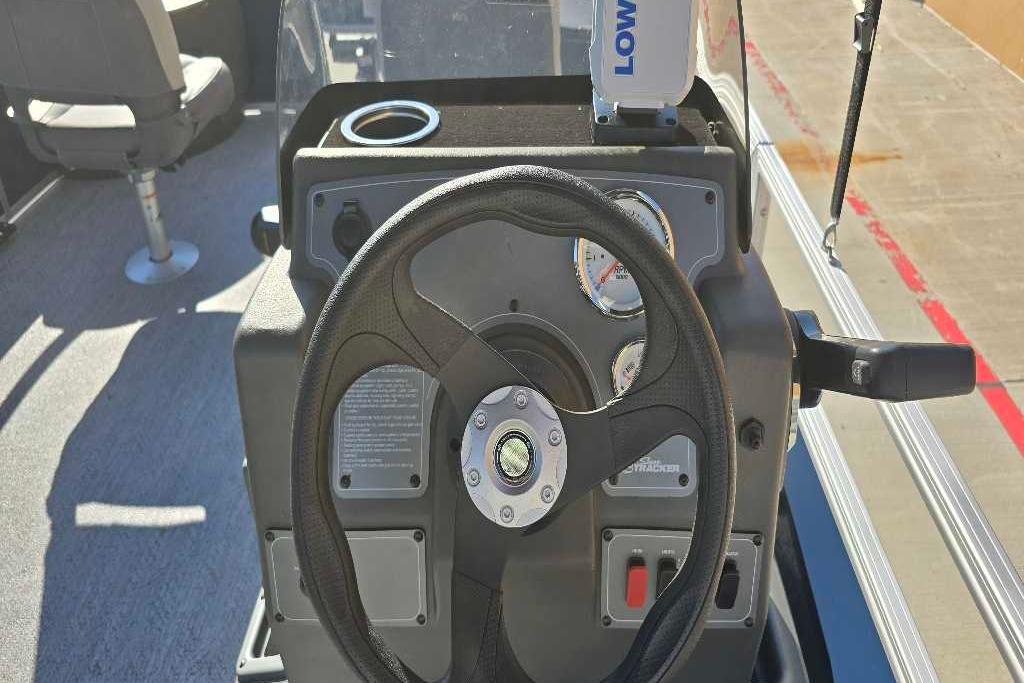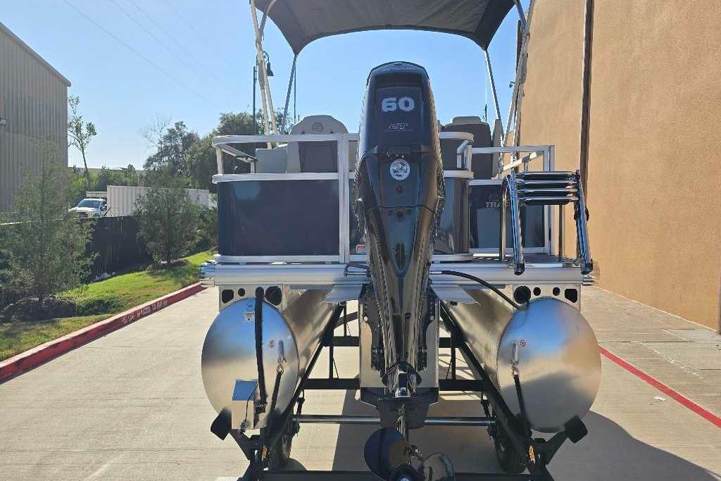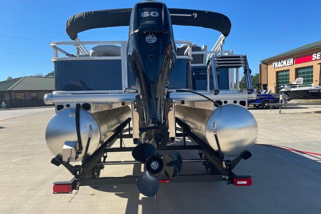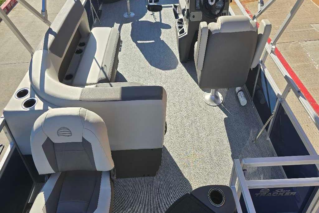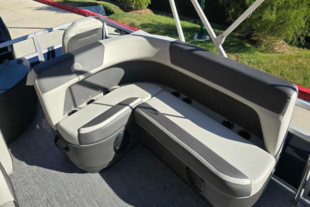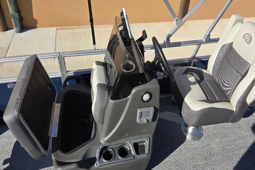 Up to eight fishin' buddies can take to the dual fishing decks of this redesigned fishin' pontoon. Three swiveling fishing chairs around a 10-gal. bow livewell and an 8-gal. aft livewell headline the list of features that make this the perfect boat for casting lines to catch fish and memories. When the fishing's done, sprawl out on the L-shaped lounge and crank up the stereo. The new and improved boarding ladder makes follow-up cannonballs a breeze. Other features new to the 2026 model year include three extra cubic feet of storage space, more cupholders, in-lounge storage, and a new seat in front of the helm.