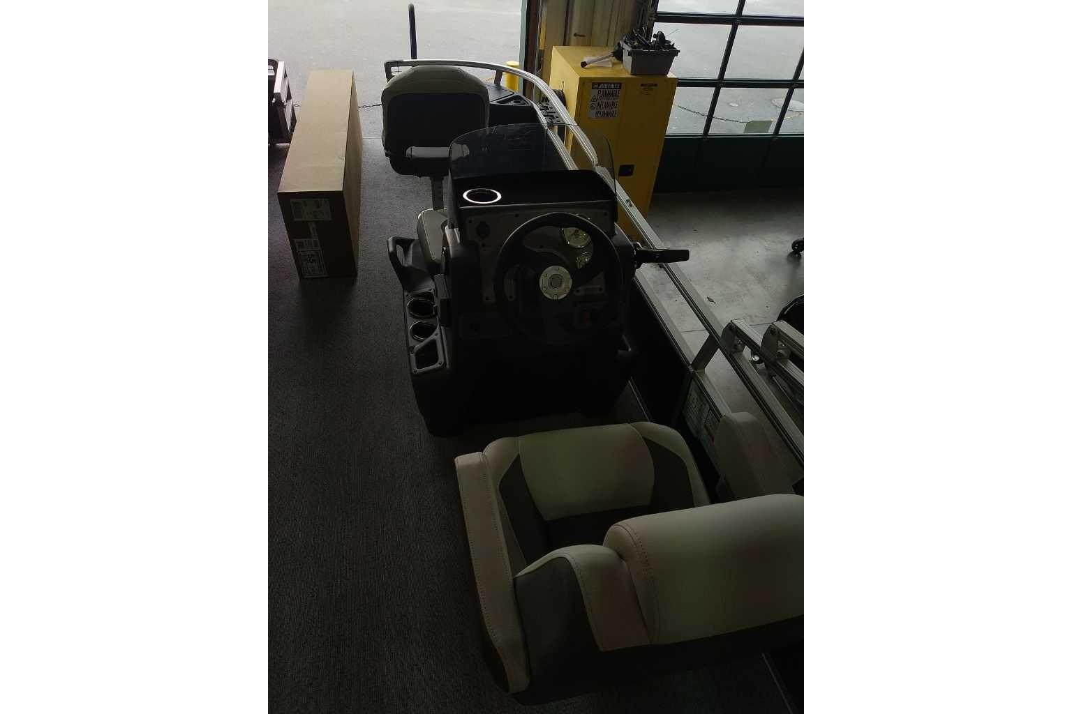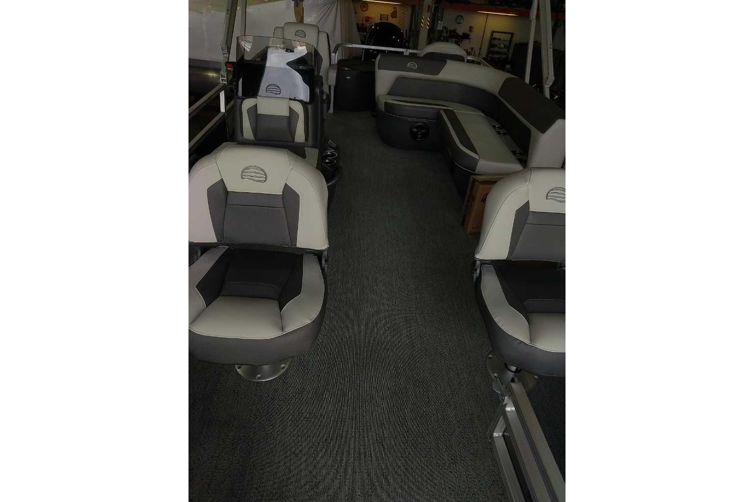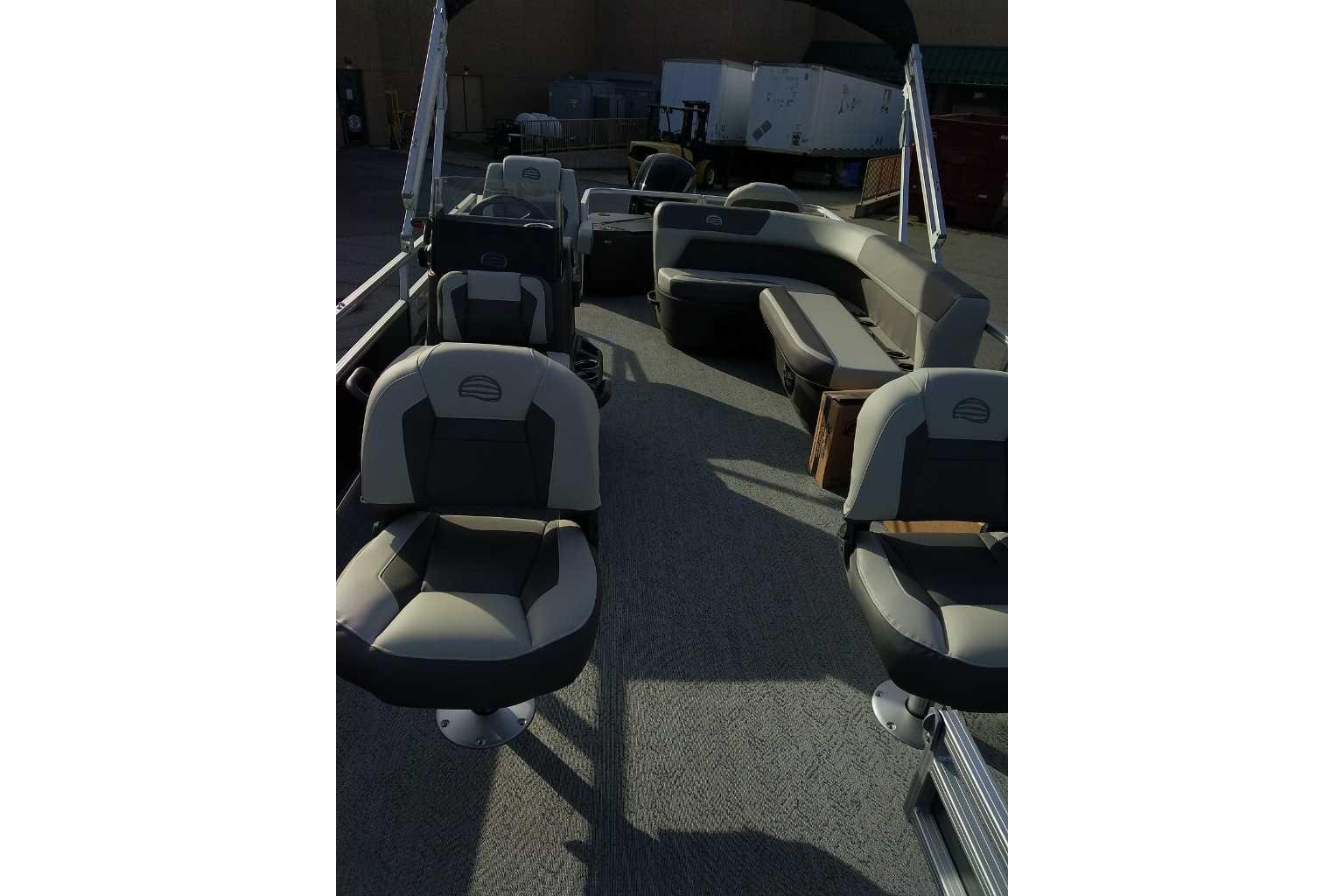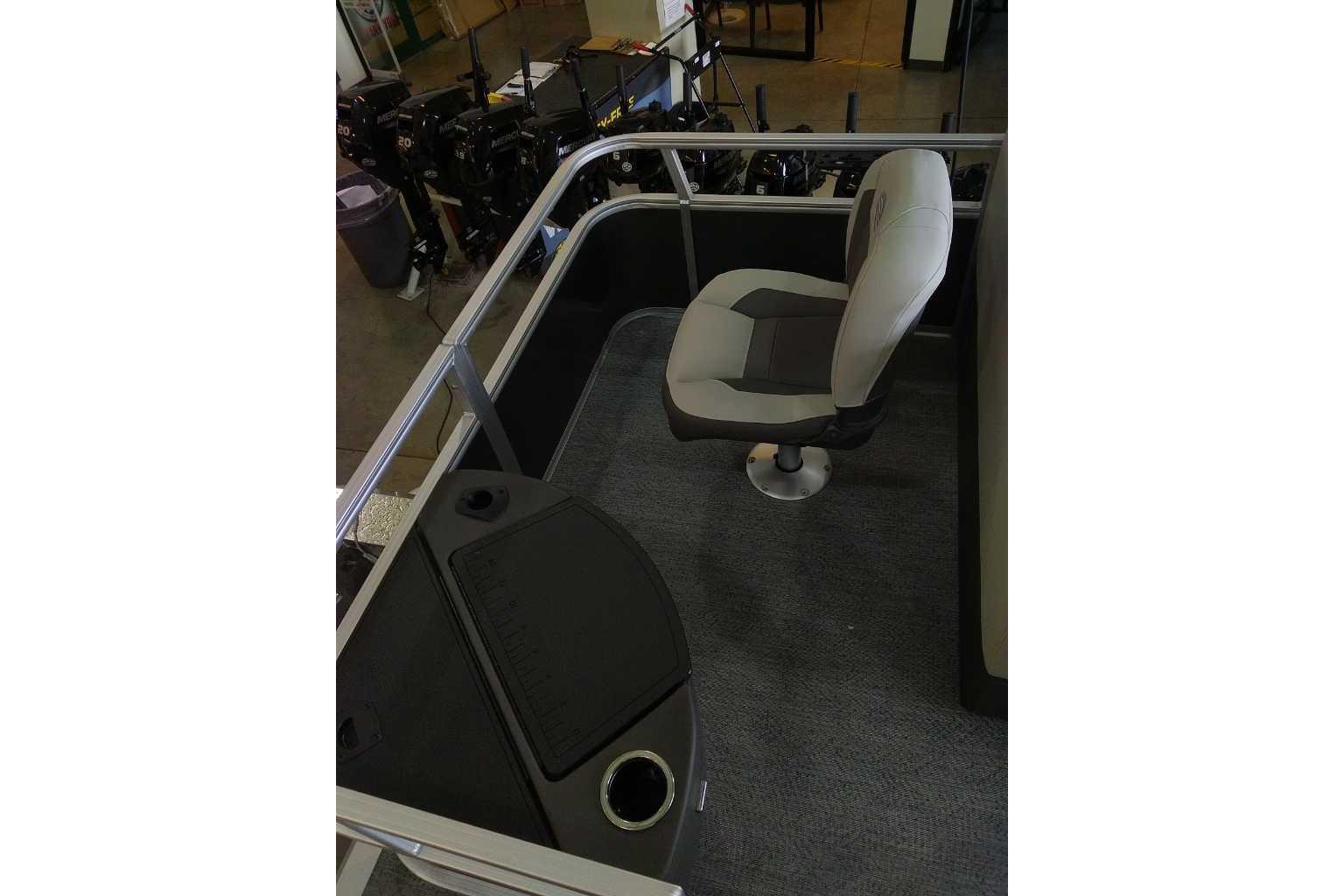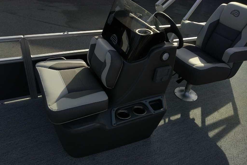 Up to eight fishin' buddies can take to the dual fishing decks of this redesigned fishin' pontoon. Three swiveling fishing chairs around a 10-gal. bow livewell and an 8-gal. aft livewell headline the list of features that make this the perfect boat for casting lines to catch fish and memories. When the fishing's done, sprawl out on the L-shaped lounge and crank up the stereo. The new and improved boarding ladder makes follow-up cannonballs a breeze. Other features new to the 2026 model year include three extra cubic feet of storage space, more cupholders, in-lounge storage, and a new seat in front of the helm.