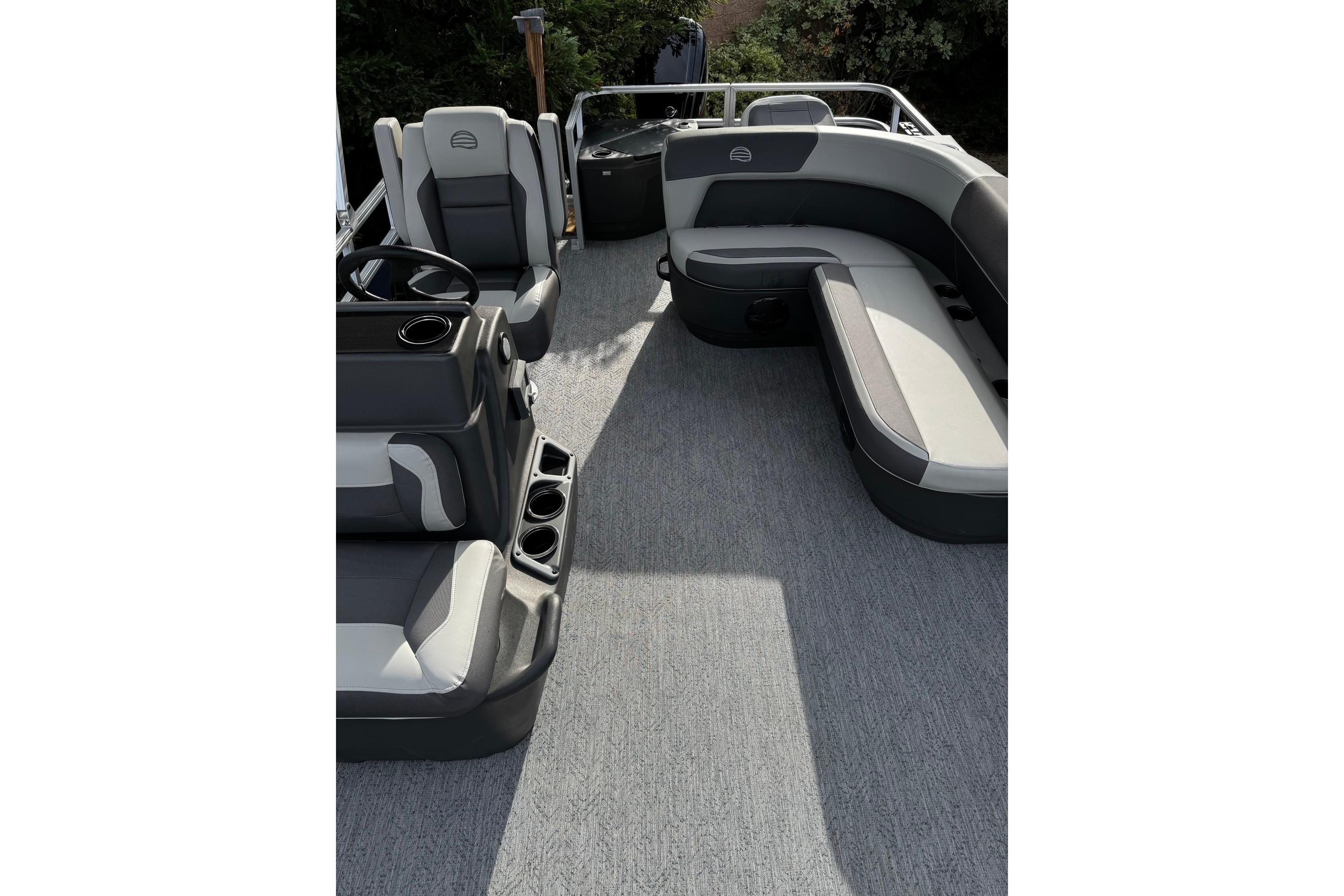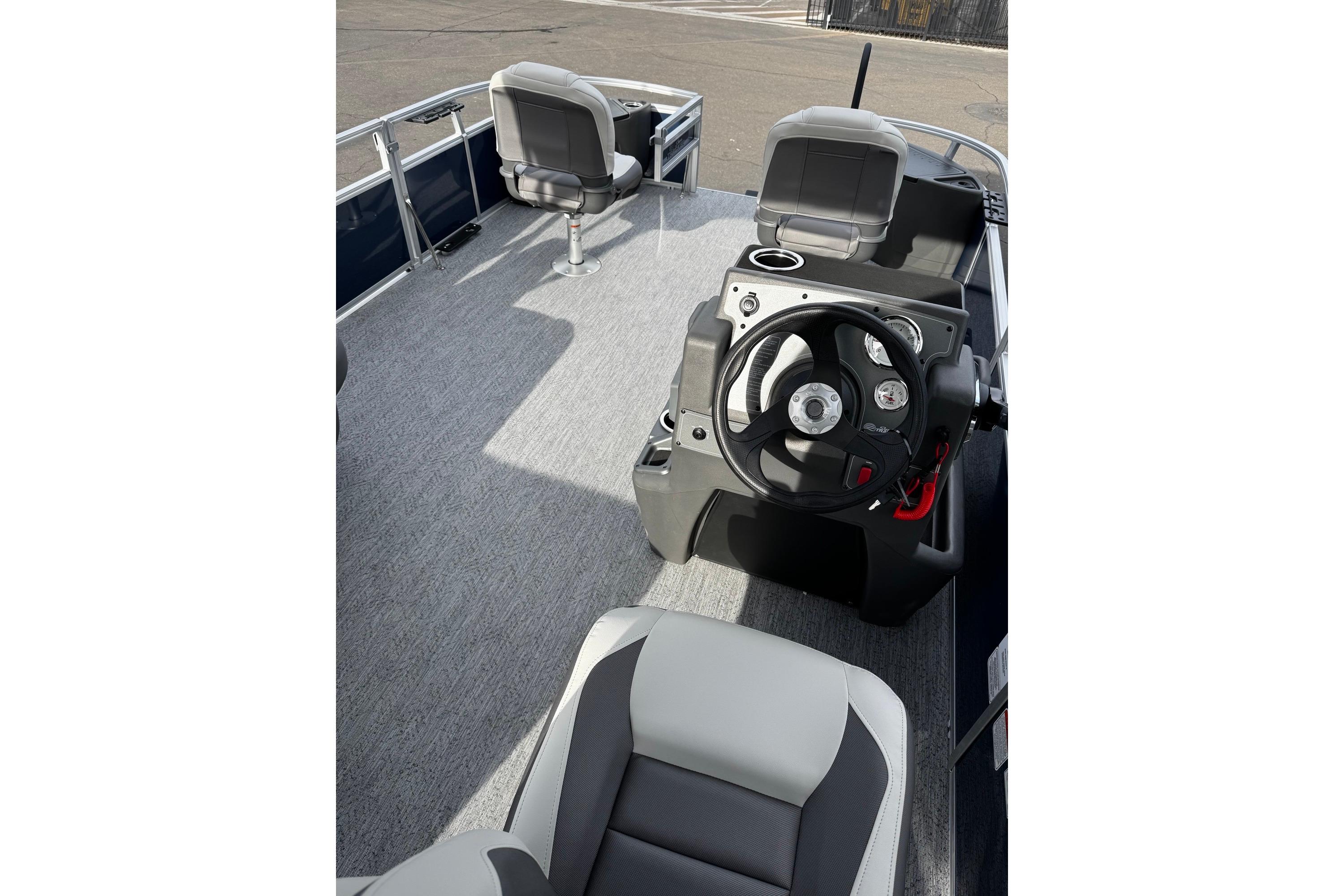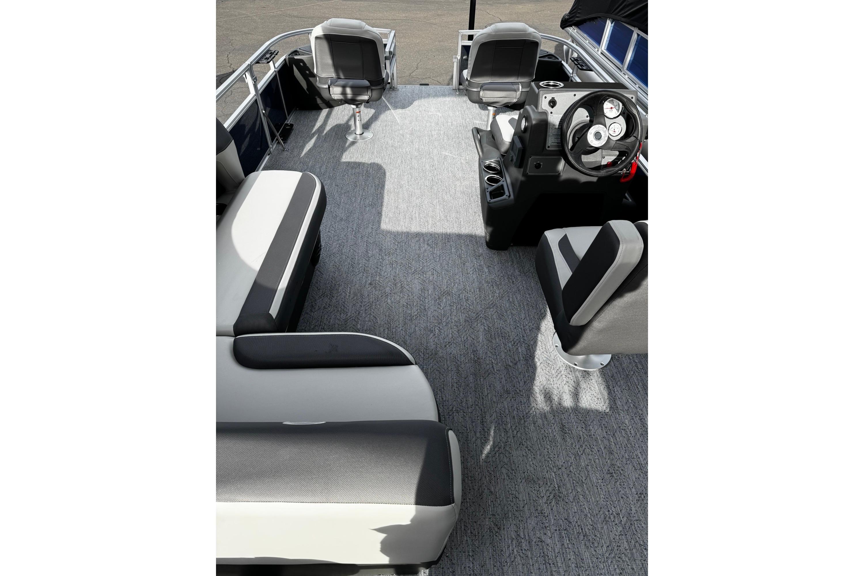 Up to eight fishin' buddies can take to the dual fishing decks of this redesigned fishin' pontoon. Three swiveling fishing chairs around a 10-gal. bow livewell and an 8-gal. aft livewell headline the list of features that make this the perfect boat for casting lines to catch fish and memories. When the fishing's done, sprawl out on the L-shaped lounge and crank up the stereo. The new and improved boarding ladder makes follow-up cannonballs a breeze. Other features new to the 2026 model year include three extra cubic feet of storage space, more cupholders, in-lounge storage, and a new seat in front of the helm.