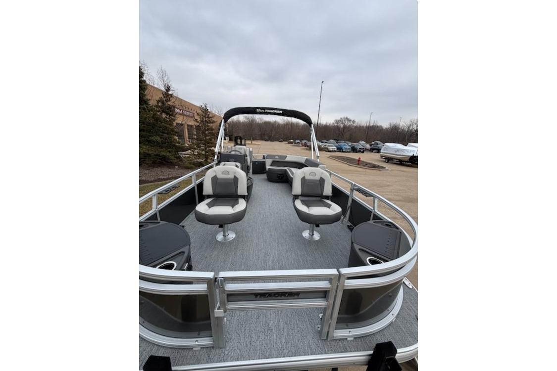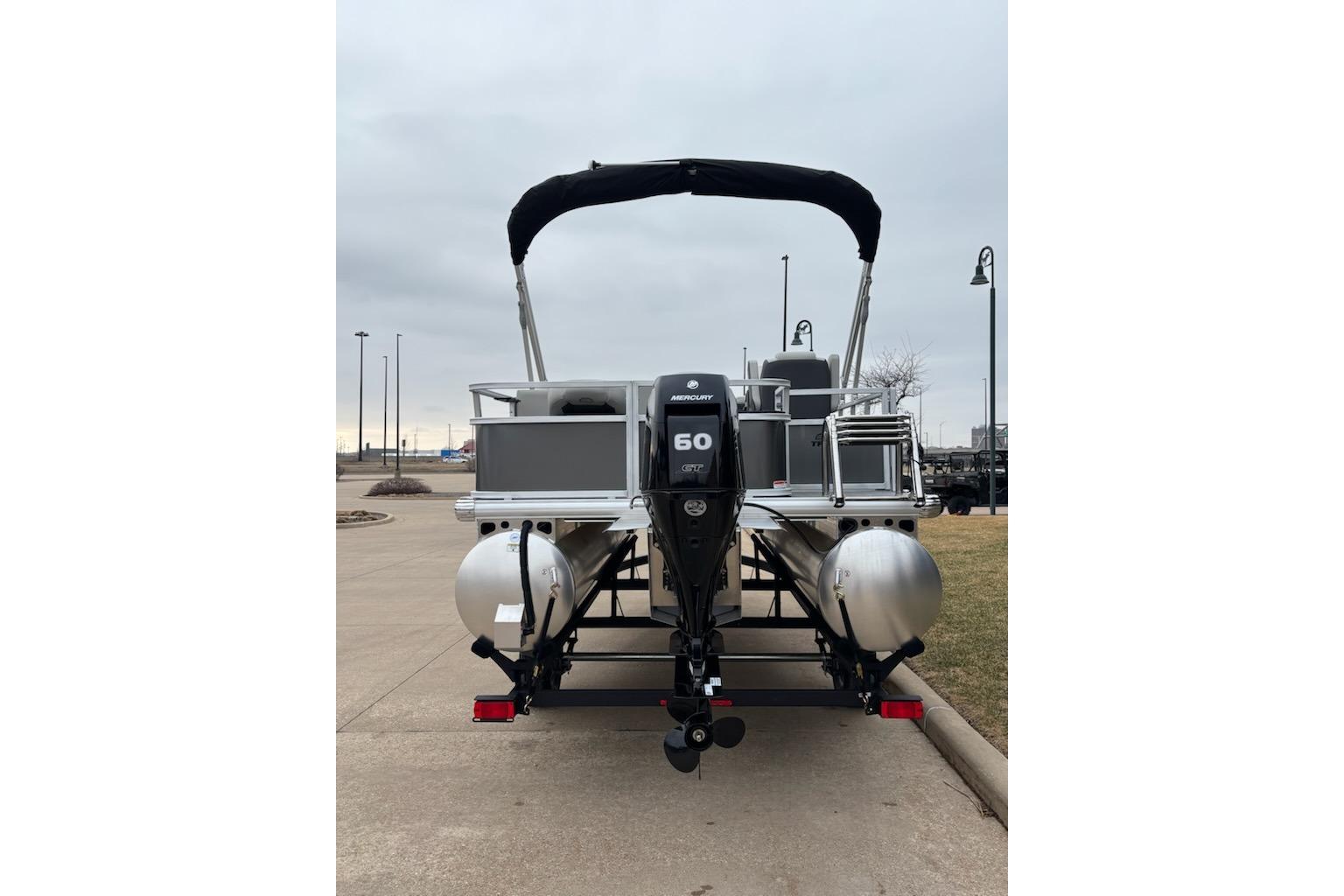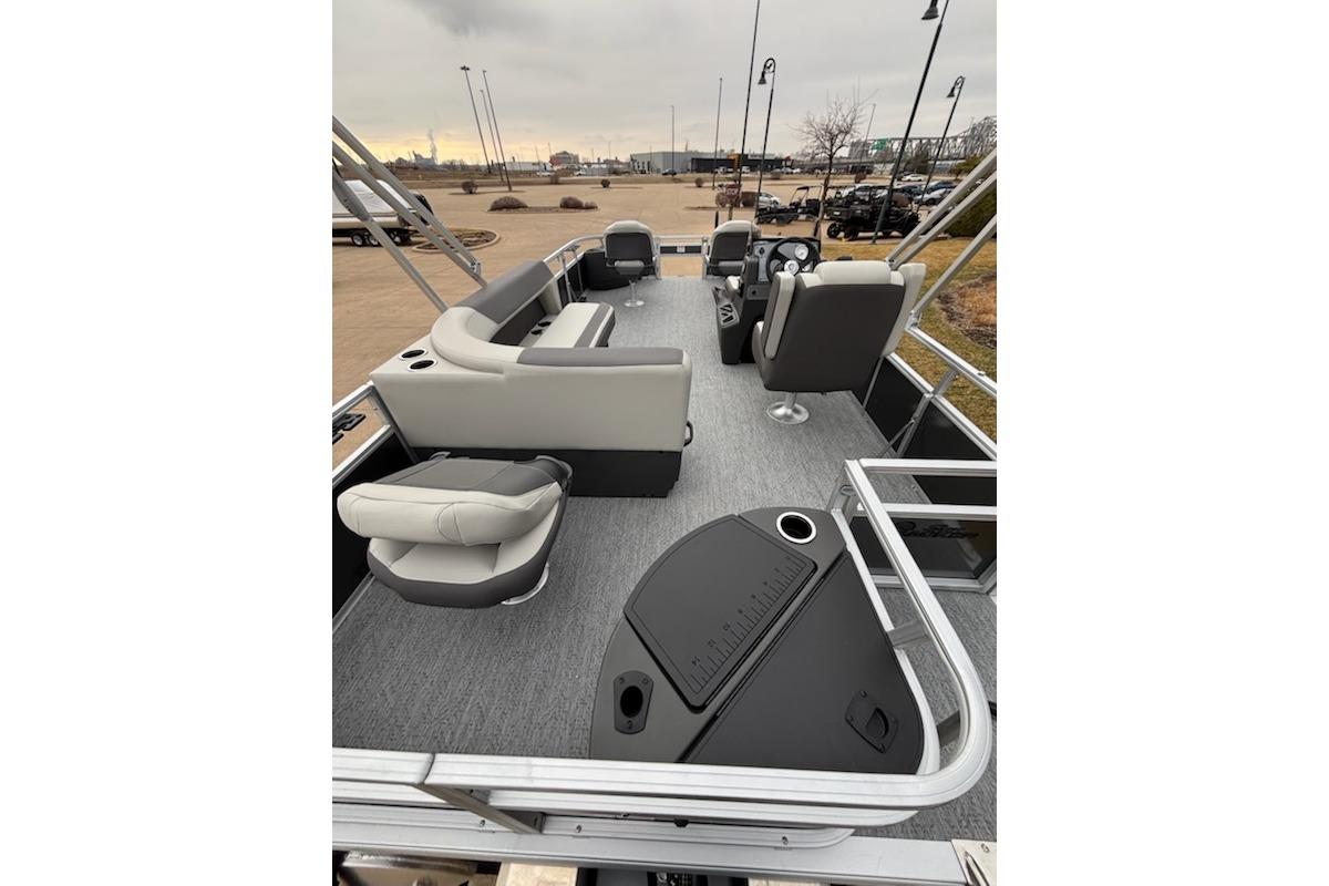 Up to eight fishin' buddies can take to the dual fishing decks of this redesigned fishin' pontoon. Three swiveling fishing chairs around a 10-gal. bow livewell and an 8-gal. aft livewell headline the list of features that make this the perfect boat for casting lines to catch fish and memories. When the fishing's done, sprawl out on the L-shaped lounge and crank up the stereo. The new and improved boarding ladder makes follow-up cannonballs a breeze. Other features new to the 2026 model year include three extra cubic feet of storage space, more cupholders, in-lounge storage, and a new seat in front of the helm.
