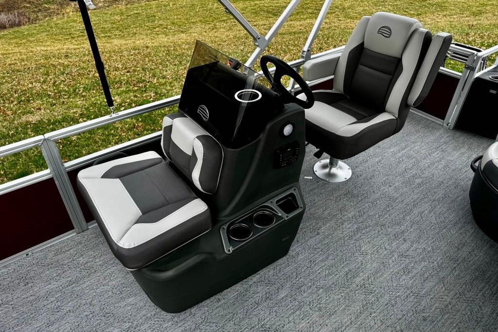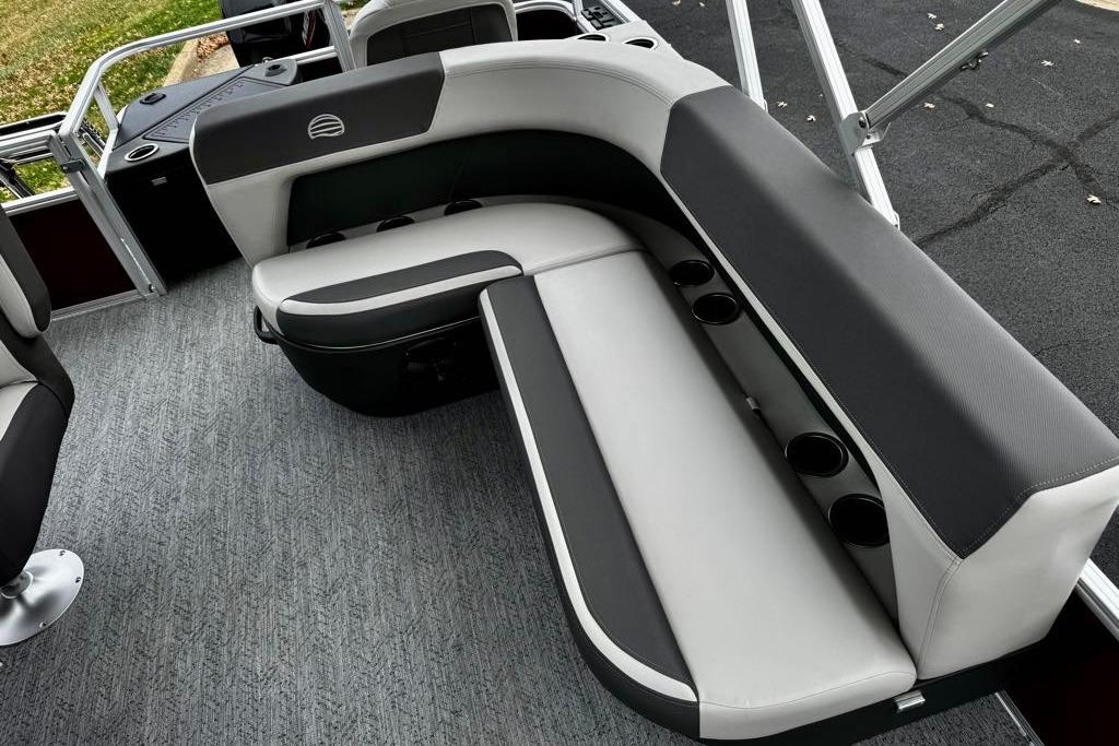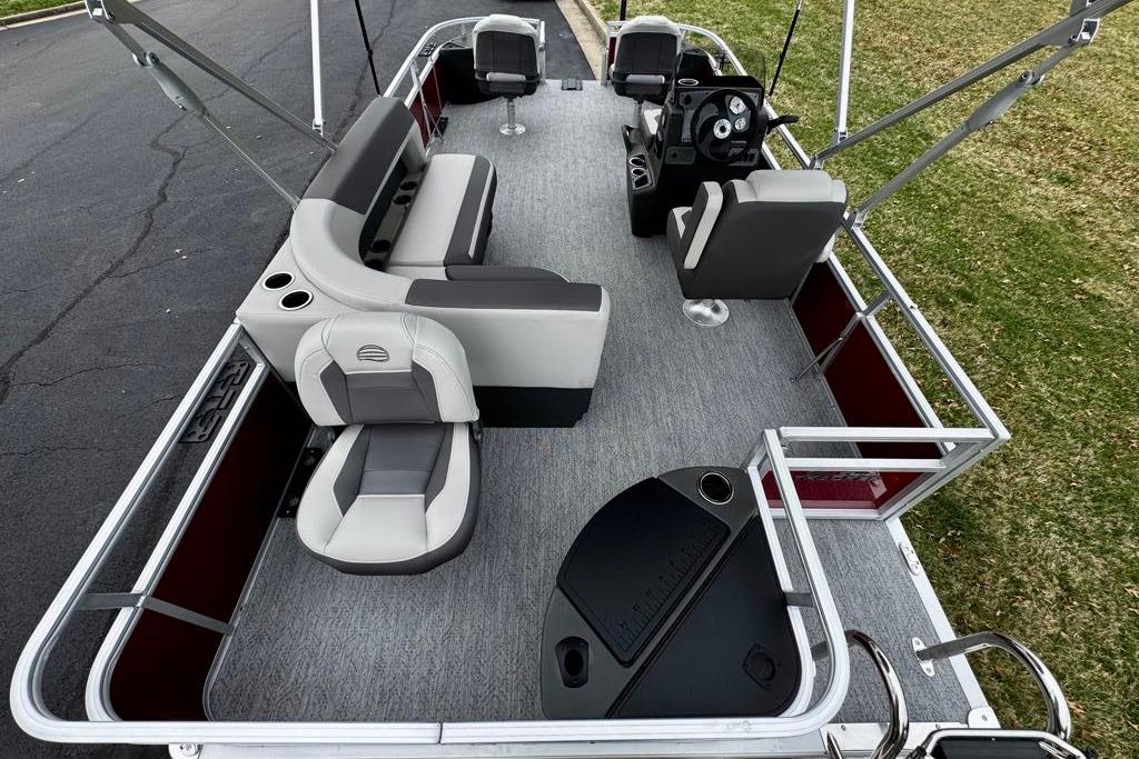 Up to eight fishin' buddies can take to the dual fishing decks of this redesigned fishin' pontoon. Three swiveling fishing chairs around a 10-gal. bow livewell and an 8-gal. aft livewell headline the list of features that make this the perfect boat for casting lines to catch fish and memories. When the fishing's done, sprawl out on the L-shaped lounge and crank up the stereo. The new and improved boarding ladder makes follow-up cannonballs a breeze. Other features new to the 2026 model year include three extra cubic feet of storage space, more cupholders, in-lounge storage, and a new seat in front of the helm.