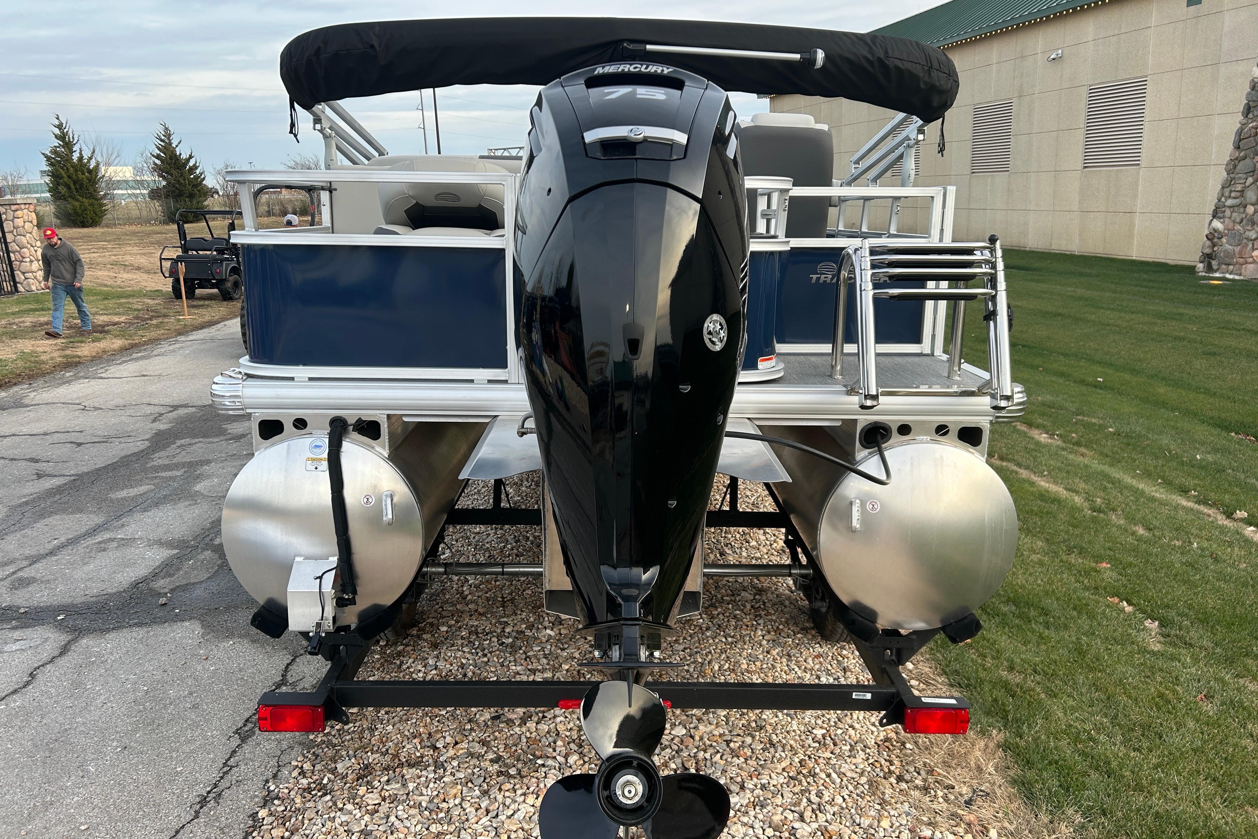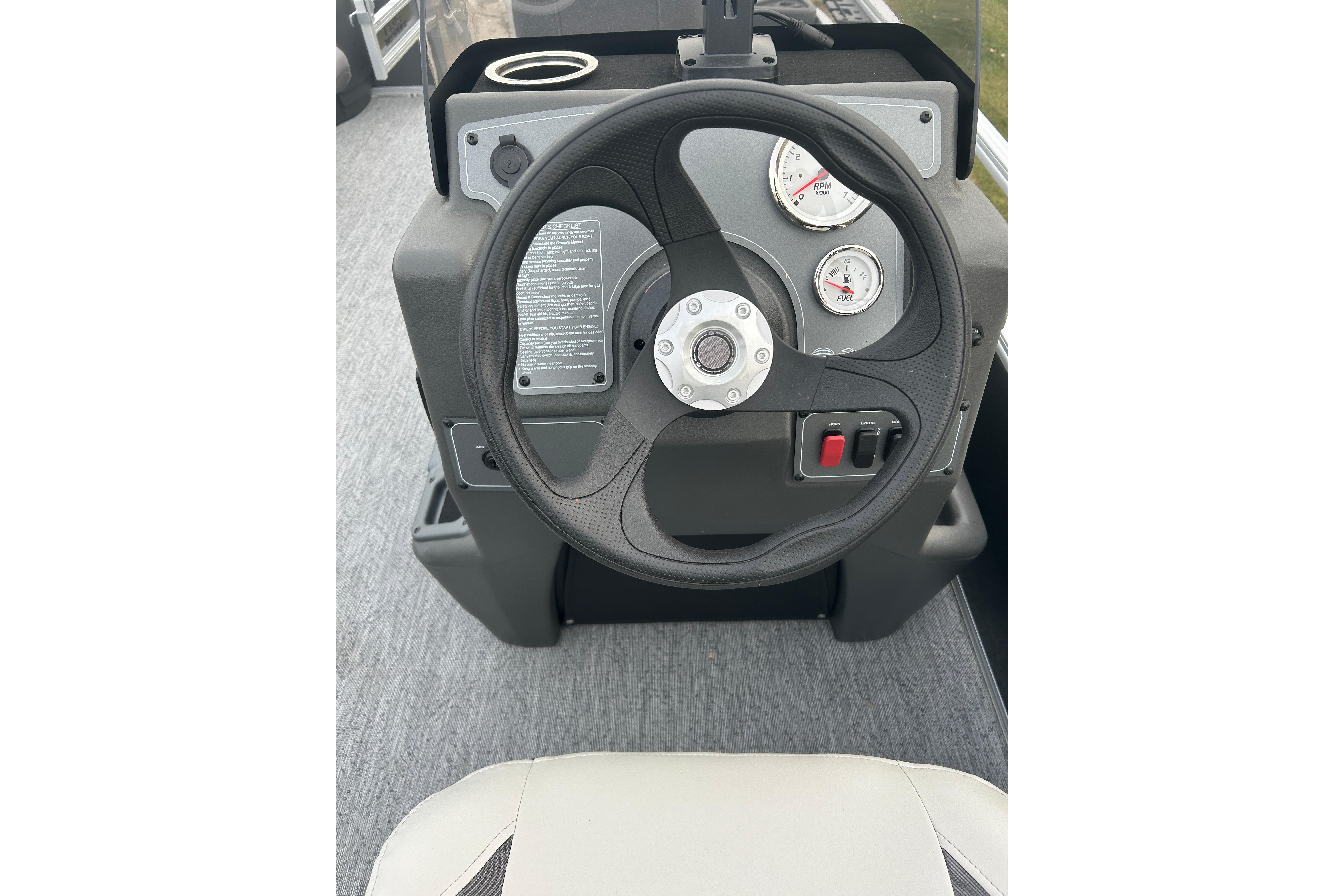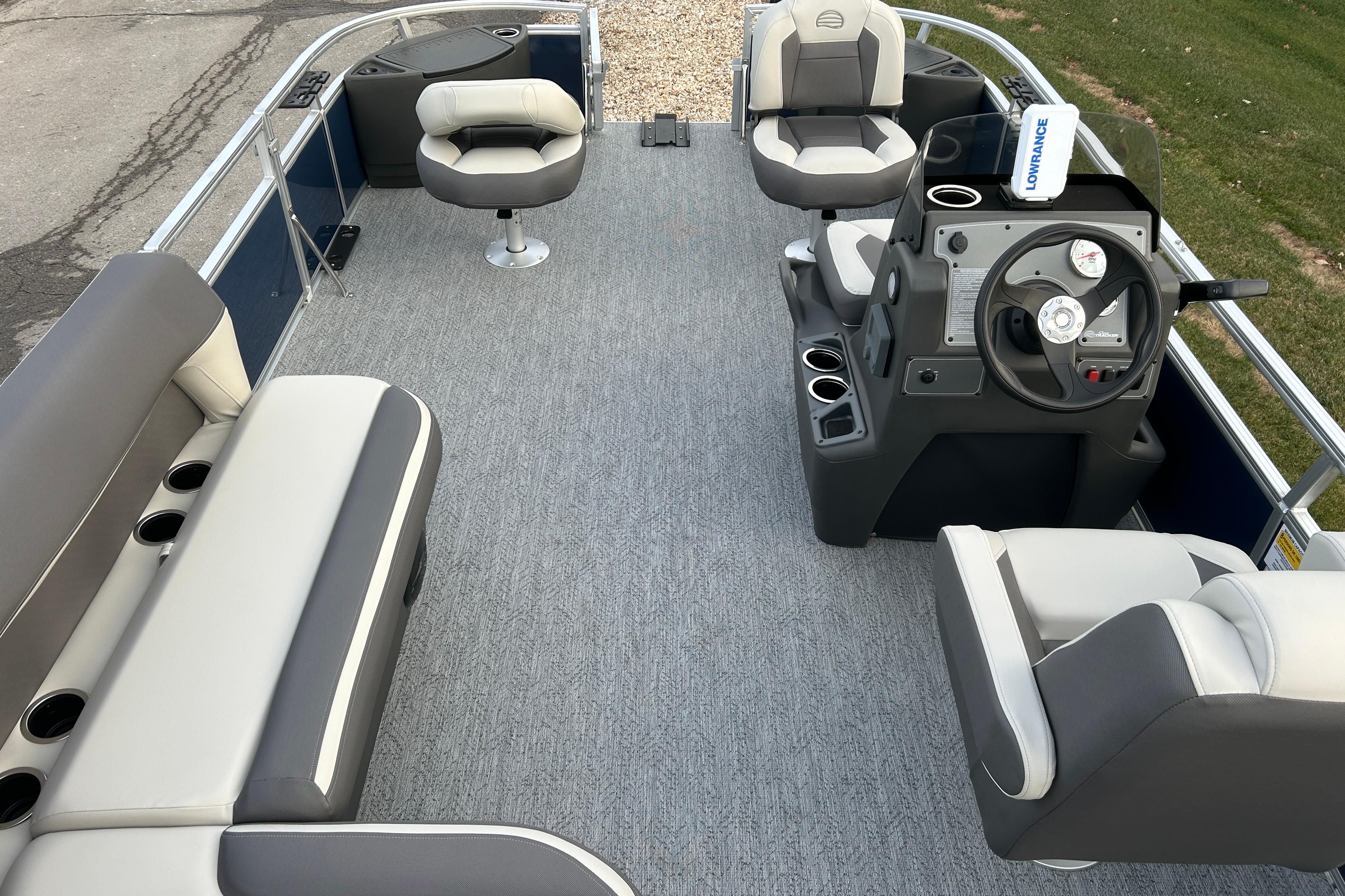 Up to eight fishin' buddies can take to the dual fishing decks of this redesigned fishin' pontoon. Three swiveling fishing chairs around a 10-gal. bow livewell and an 8-gal. aft livewell headline the list of features that make this the perfect boat for casting lines to catch fish and memories. When the fishing's done, sprawl out on the L-shaped lounge and crank up the stereo. The new and improved boarding ladder makes follow-up cannonballs a breeze. Other features new to the 2026 model year include three extra cubic feet of storage space, more cupholders, in-lounge storage, and a new seat in front of the helm.