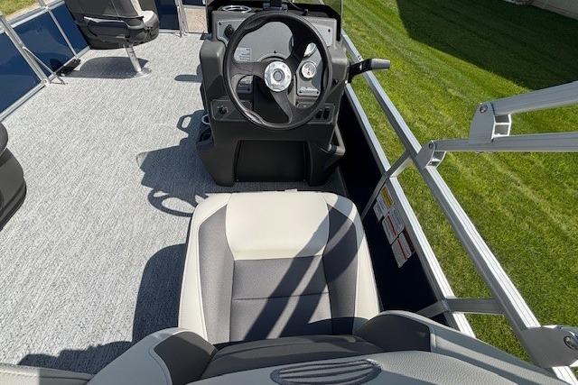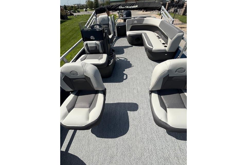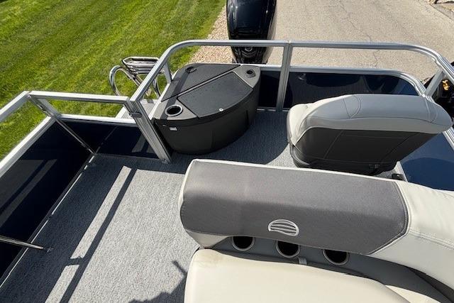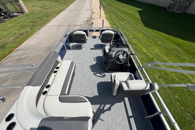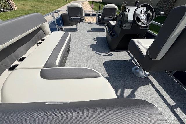 Up to eight fishin' buddies can take to the dual fishing decks of this redesigned fishin' pontoon. Three swiveling fishing chairs around a 10-gal. bow livewell and an 8-gal. aft livewell headline the list of features that make this the perfect boat for casting lines to catch fish and memories. When the fishing's done, sprawl out on the L-shaped lounge and crank up the stereo. The new and improved boarding ladder makes follow-up cannonballs a breeze. Other features new to the 2026 model year include three extra cubic feet of storage space, more cupholders, in-lounge storage, and a new seat in front of the helm.