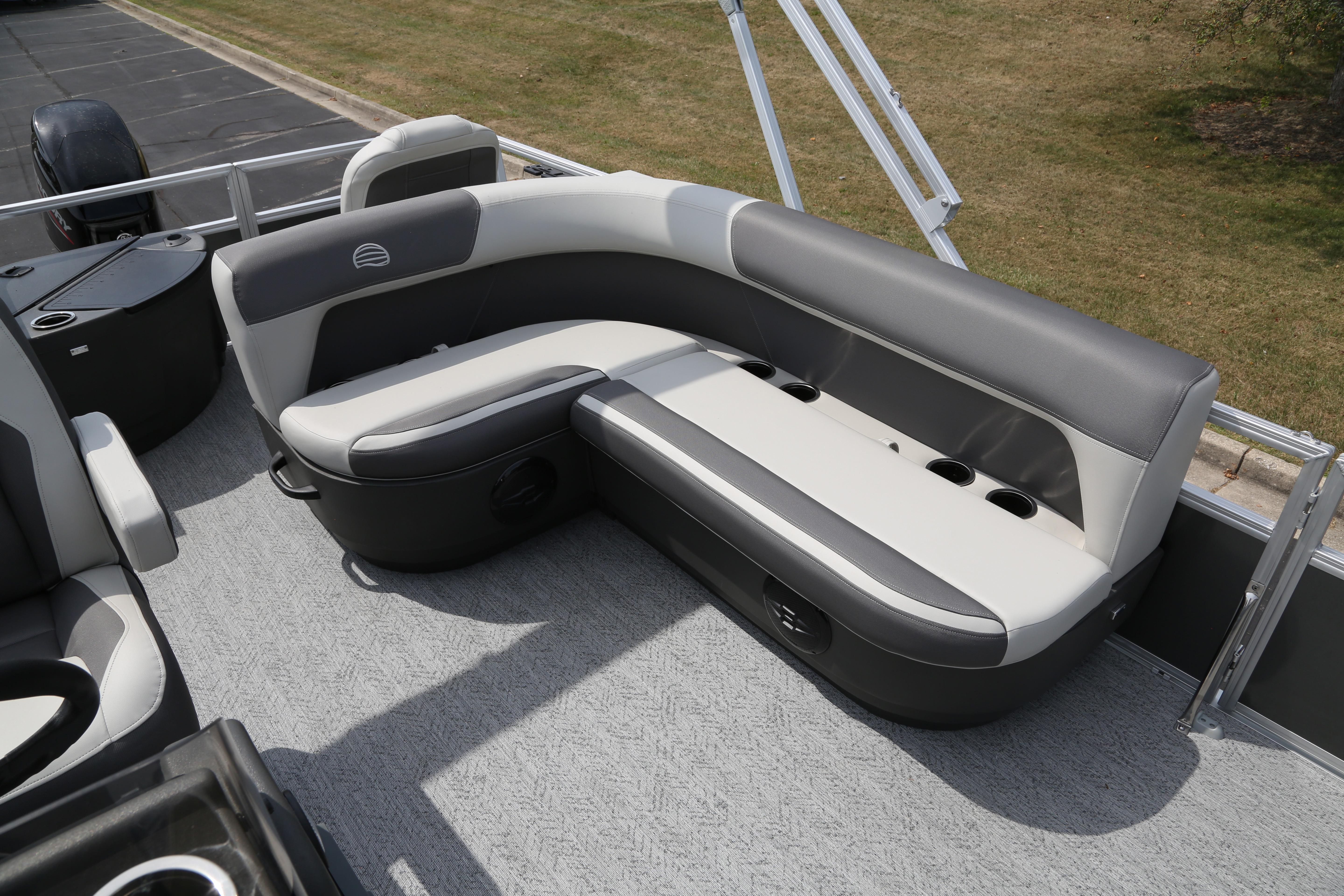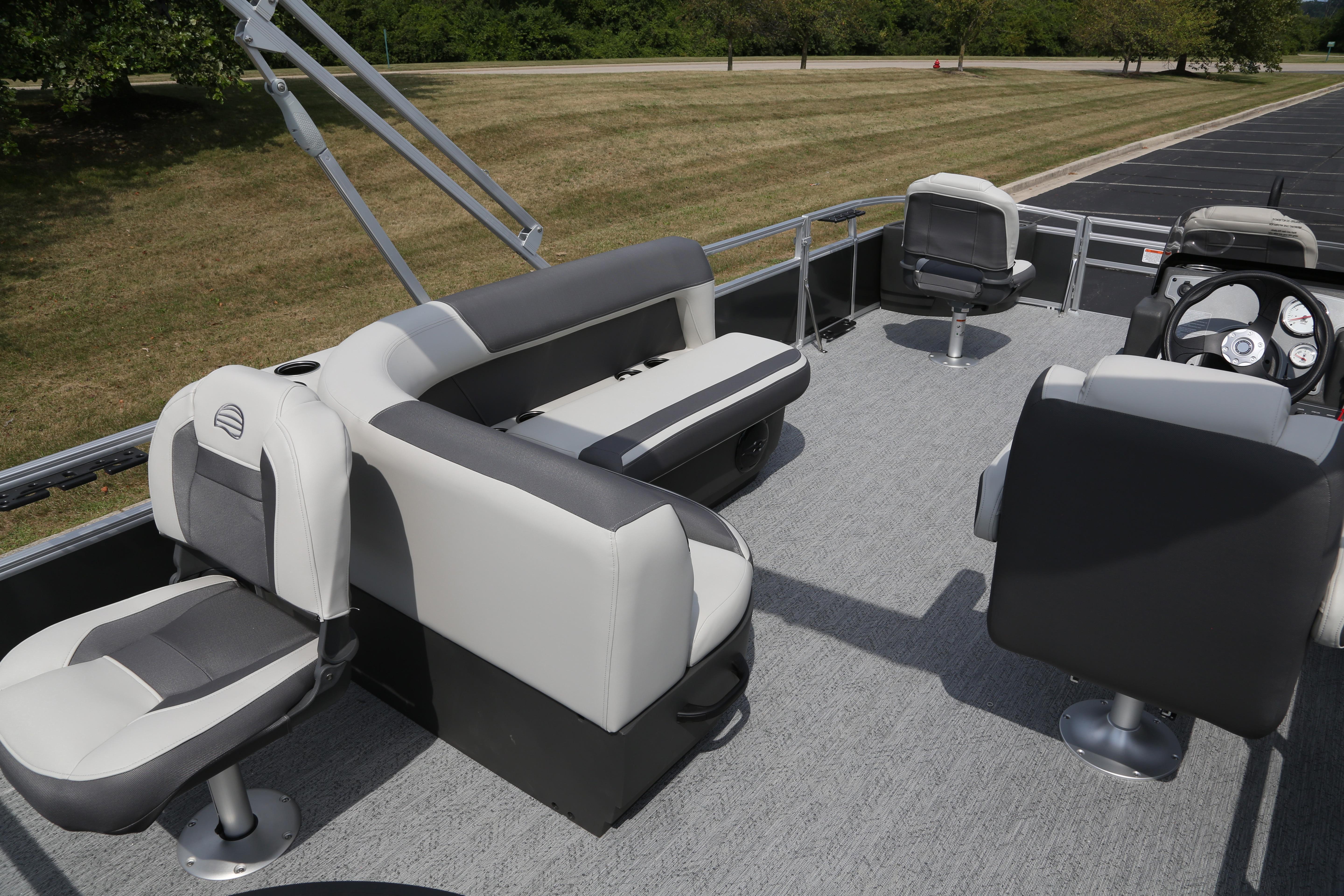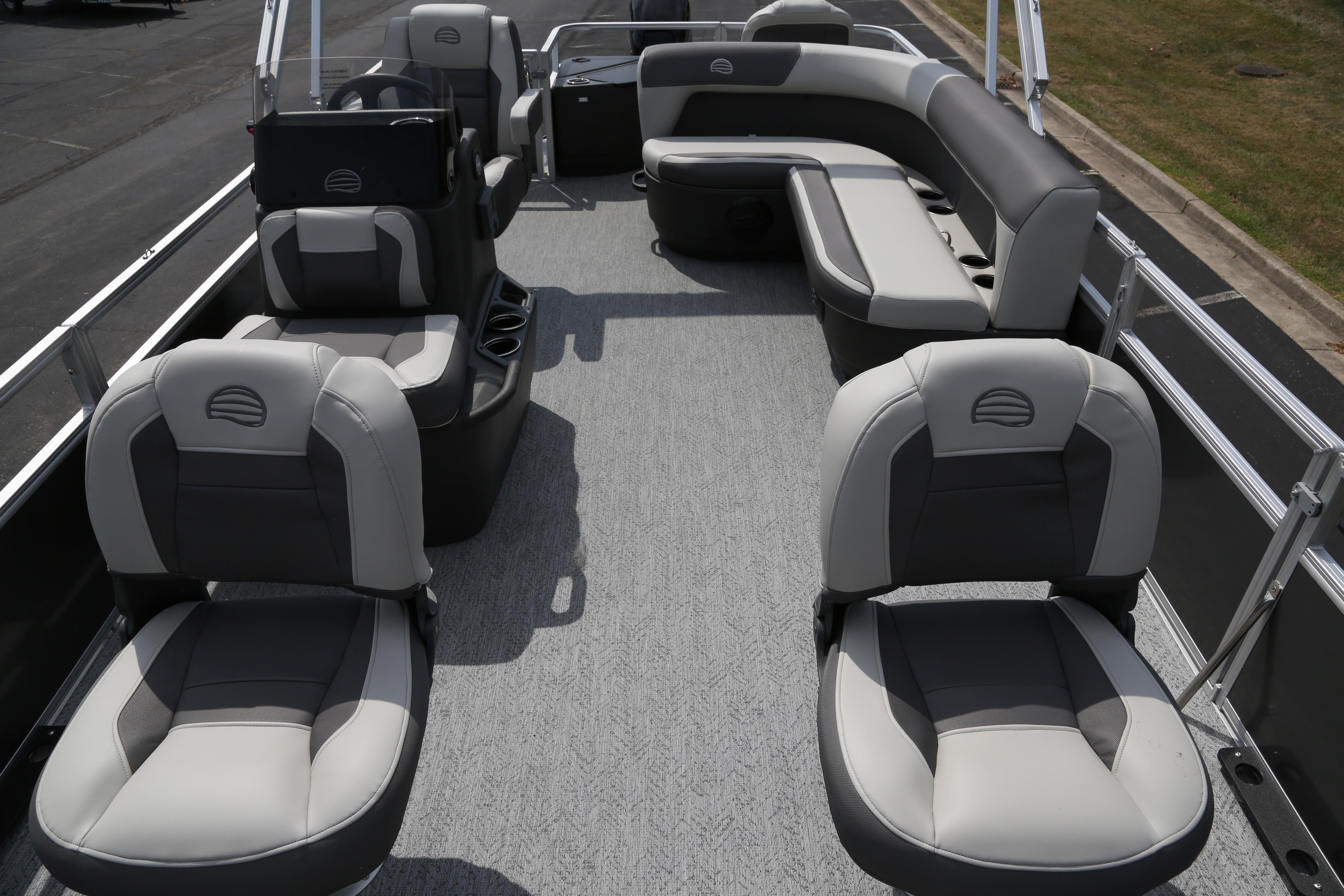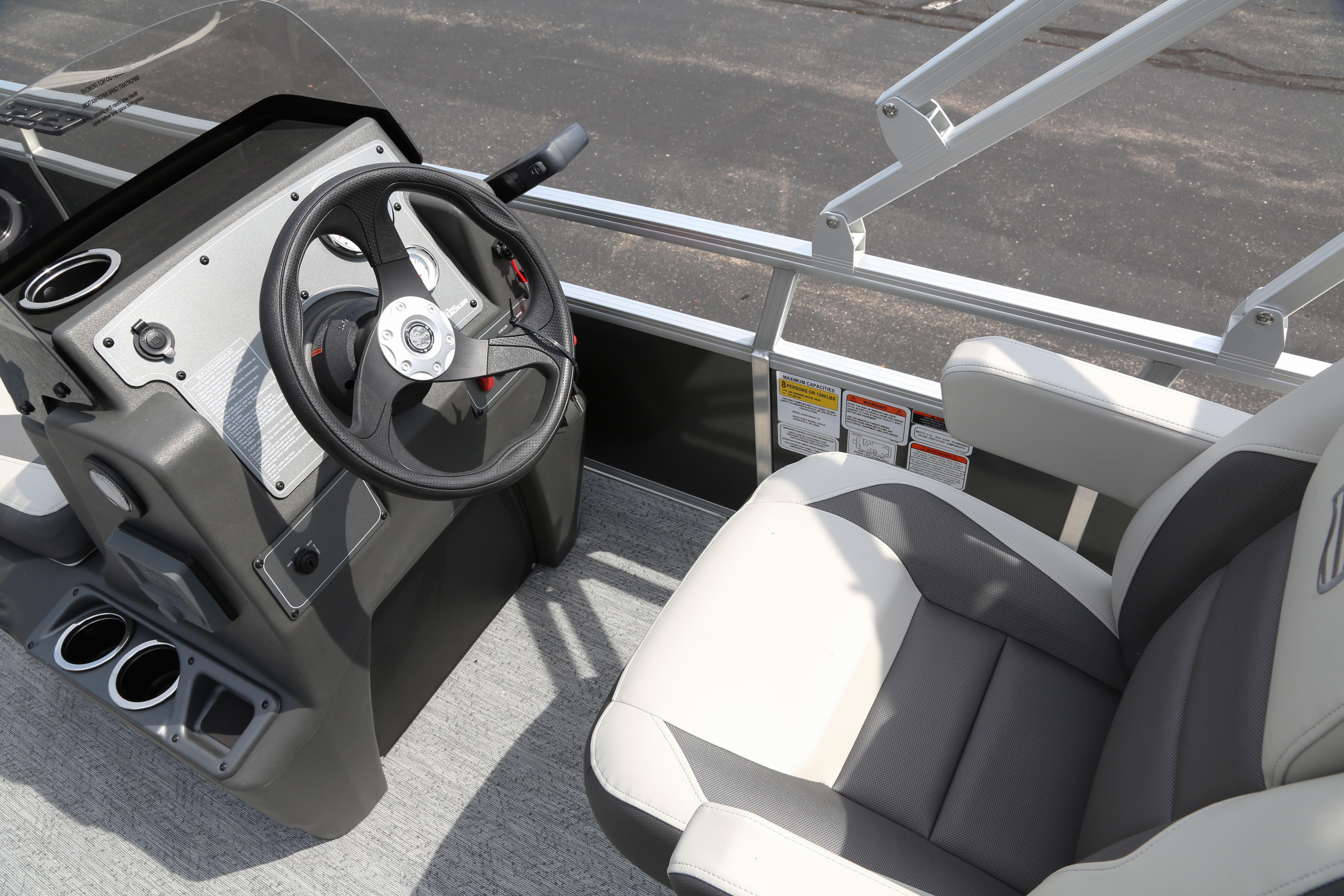 Up to eight fishin' buddies can take to the dual fishing decks of this redesigned fishin' pontoon. Three swiveling fishing chairs around a 10-gal. bow livewell and an 8-gal. aft livewell headline the list of features that make this the perfect boat for casting lines to catch fish and memories. When the fishing's done, sprawl out on the L-shaped lounge and crank up the stereo. The new and improved boarding ladder makes follow-up cannonballs a breeze. Other features new to the 2026 model year include three extra cubic feet of storage space, more cupholders, in-lounge storage, and a new seat in front of the helm.