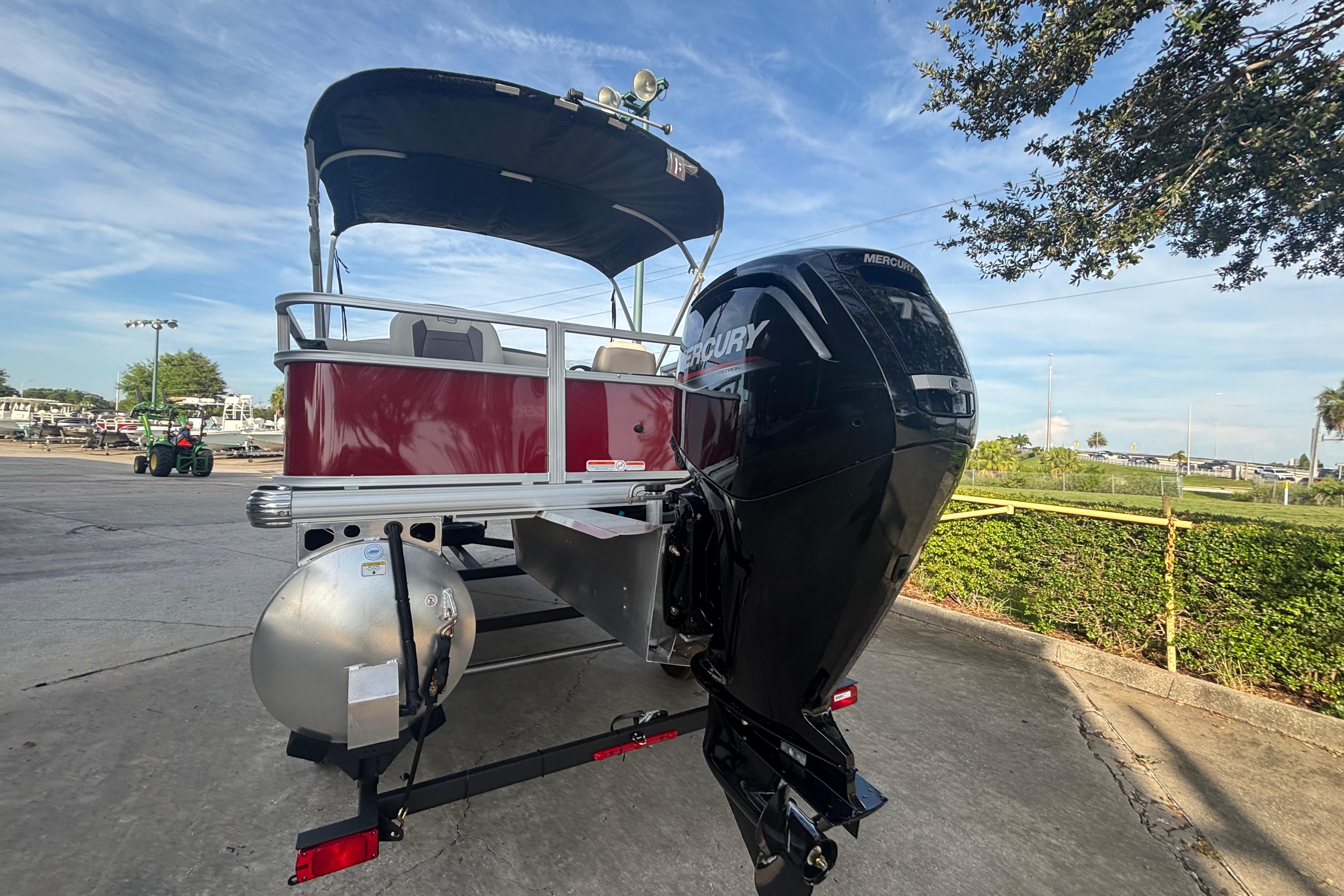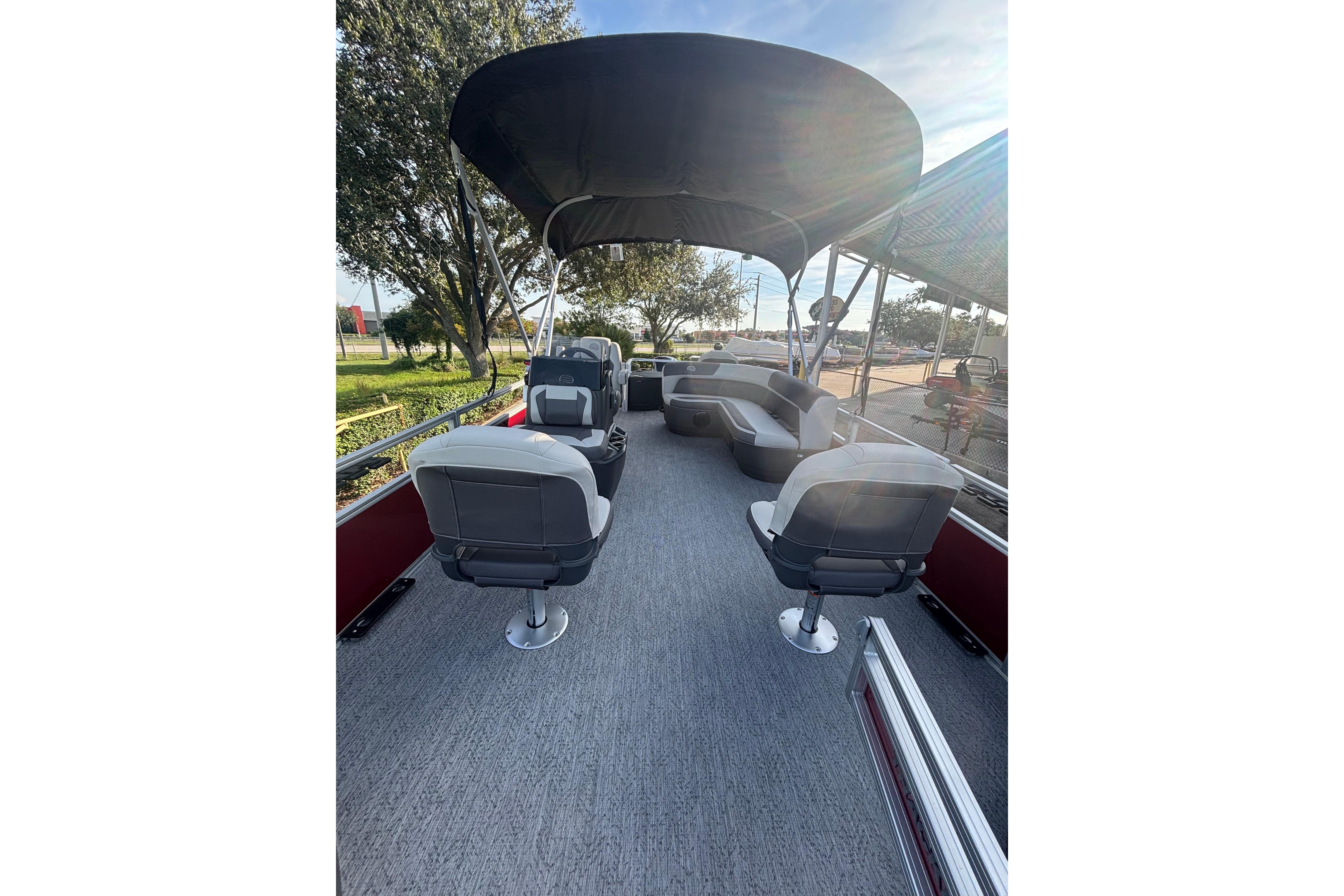 Up to eight fishin' buddies can take to the dual fishing decks of this redesigned fishin' pontoon. Three swiveling fishing chairs around a 10-gal. bow livewell and an 8-gal. aft livewell headline the list of features that make this the perfect boat for casting lines to catch fish and memories. When the fishing's done, sprawl out on the L-shaped lounge and crank up the stereo. The new and improved boarding ladder makes follow-up cannonballs a breeze. Other features new to the 2026 model year include three extra cubic feet of storage space, more cupholders, in-lounge storage, and a new seat in front of the helm.