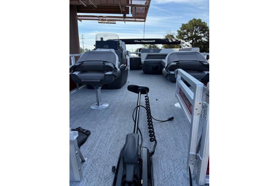 Up to eight fishin' buddies can take to the dual fishing decks of this redesigned fishin' pontoon. Three swiveling fishing chairs around a 10-gal. bow livewell and an 8-gal. aft livewell headline the list of features that make this the perfect boat for casting lines to catch fish and memories. When the fishing's done, sprawl out on the L-shaped lounge and crank up the stereo. The new and improved boarding ladder makes follow-up cannonballs a breeze. Other features new to the 2026 model year include three extra cubic feet of storage space, more cupholders, in-lounge storage, and a new seat in front of the helm.