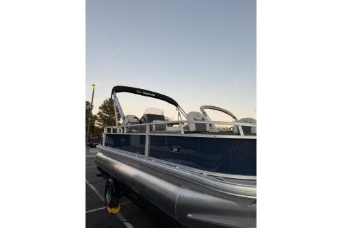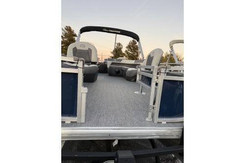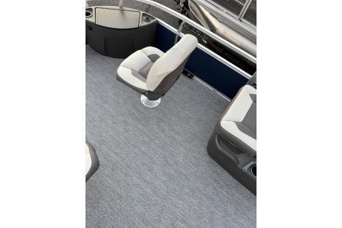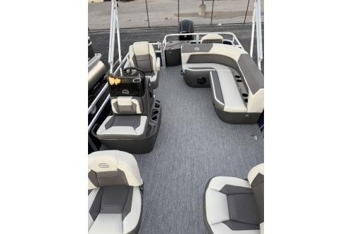 Up to eight fishin' buddies can take to the dual fishing decks of this redesigned fishin' pontoon. Three swiveling fishing chairs around a 10-gal. bow livewell and an 8-gal. aft livewell headline the list of features that make this the perfect boat for casting lines to catch fish and memories. When the fishing's done, sprawl out on the L-shaped lounge and crank up the stereo. The new and improved boarding ladder makes follow-up cannonballs a breeze. Other features new to the 2026 model year include three extra cubic feet of storage space, more cupholders, in-lounge storage, and a new seat in front of the helm.