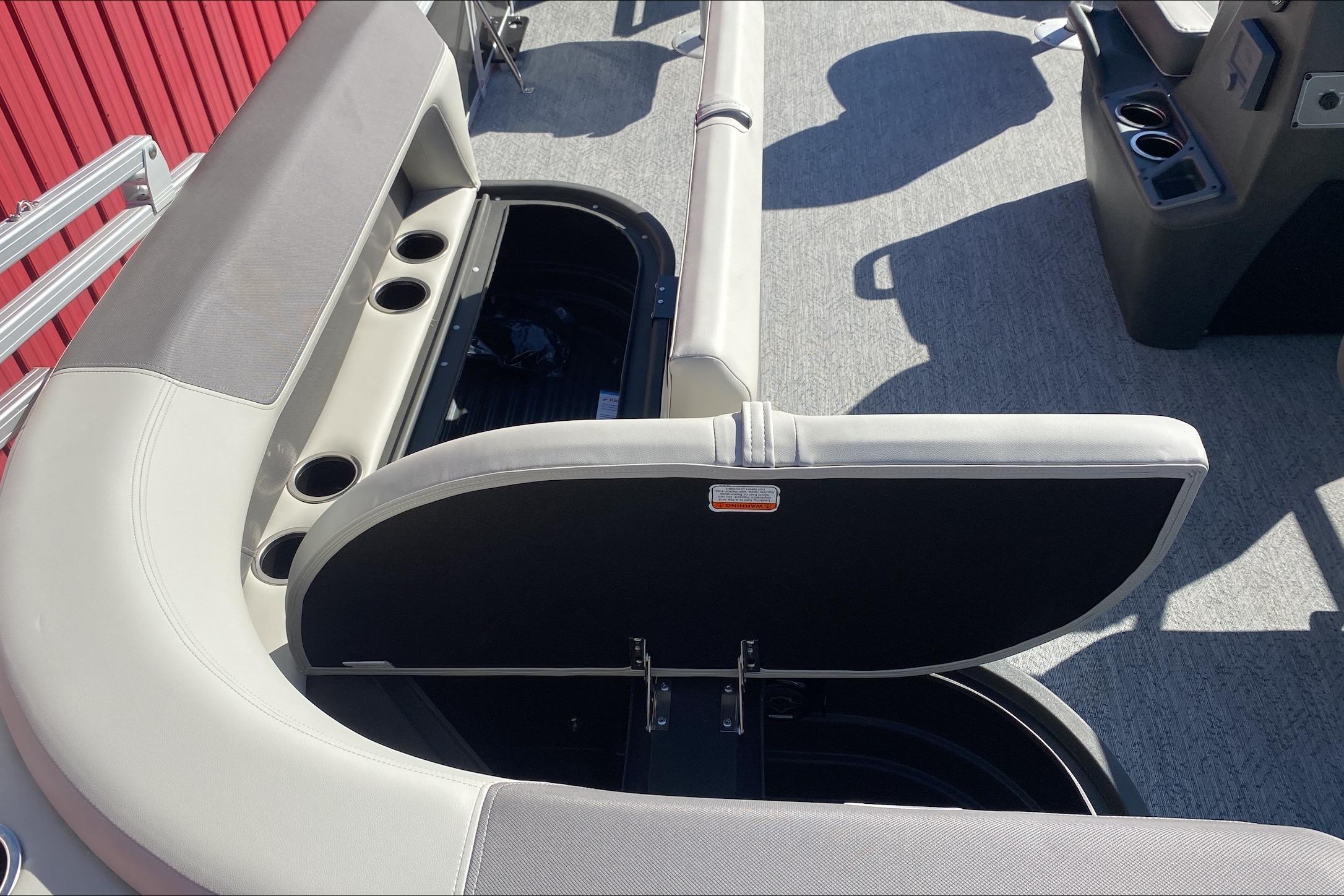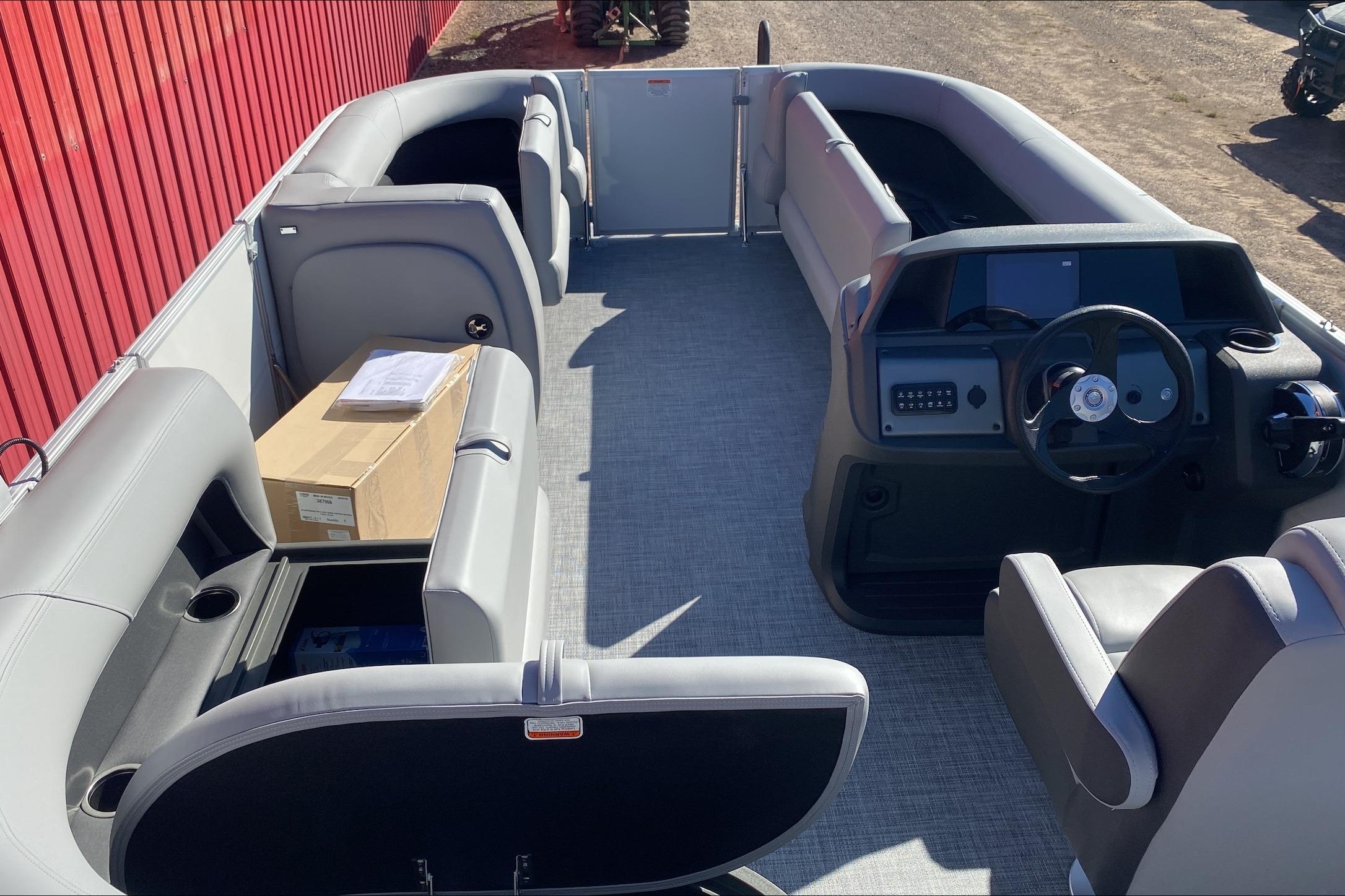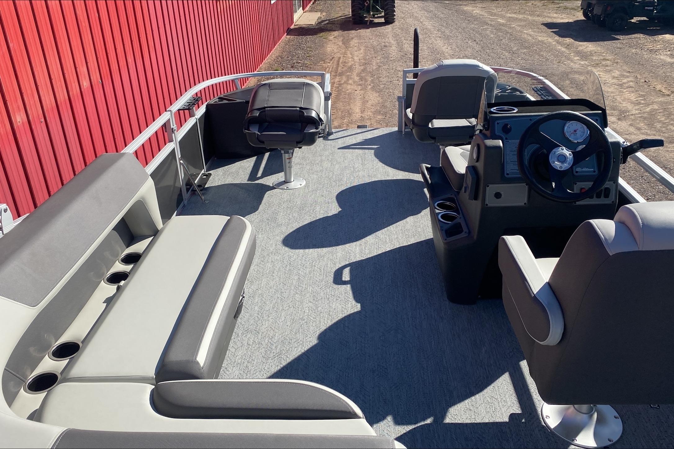 Up to eight fishin' buddies can take to the dual fishing decks of this redesigned fishin' pontoon. Three swiveling fishing chairs around a 10-gal. bow livewell and an 8-gal. aft livewell headline the list of features that make this the perfect boat for casting lines to catch fish and memories. When the fishing's done, sprawl out on the L-shaped lounge and crank up the stereo. The new and improved boarding ladder makes follow-up cannonballs a breeze. Other features new to the 2026 model year include three extra cubic feet of storage space, more cupholders, in-lounge storage, and a new seat in front of the helm.