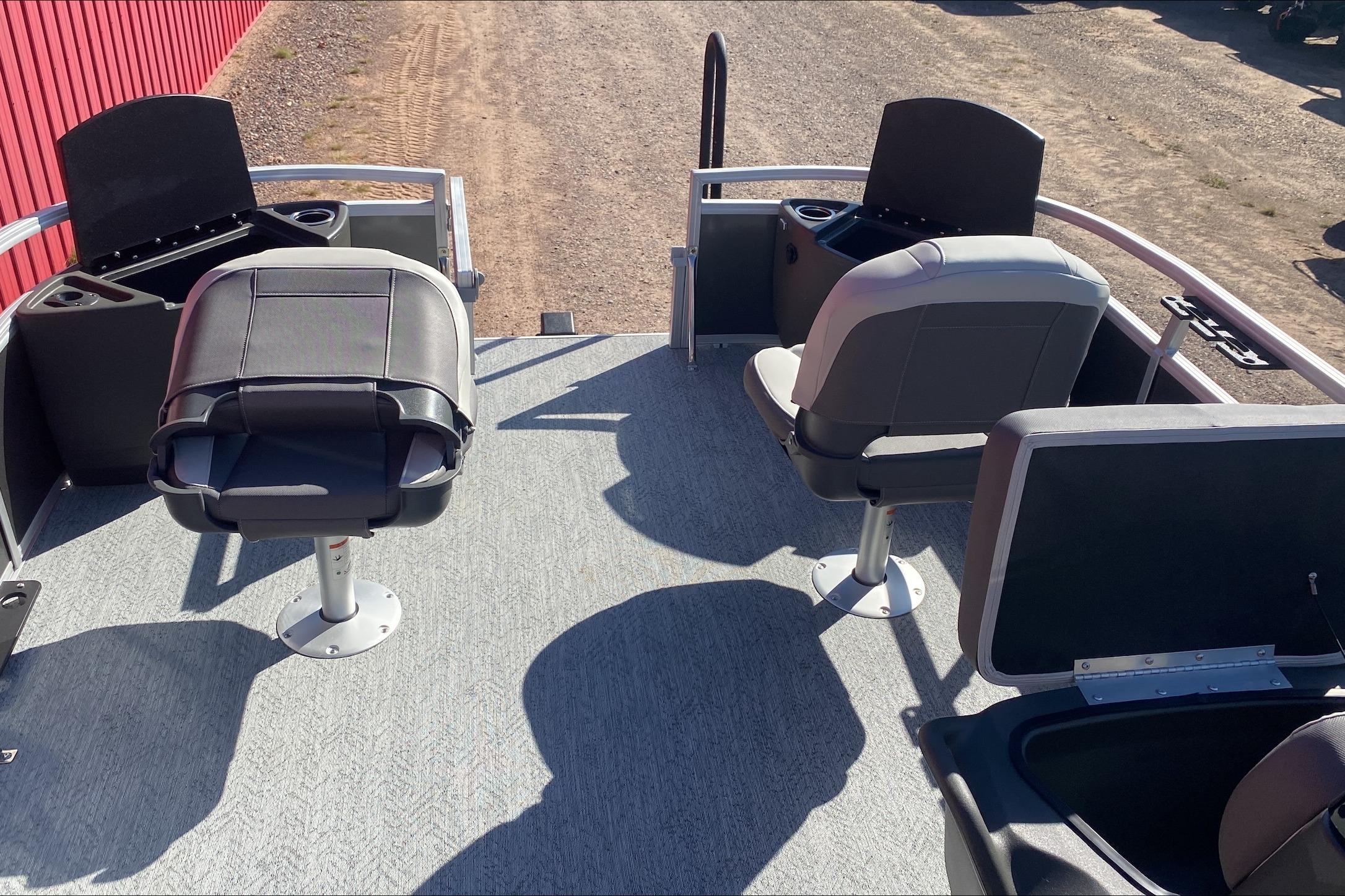 • Front fishing station w/2 pedestal seat base locations; rail-mounted rod & tool holders; & bow starboard storage compartment w/rod & drink holders
