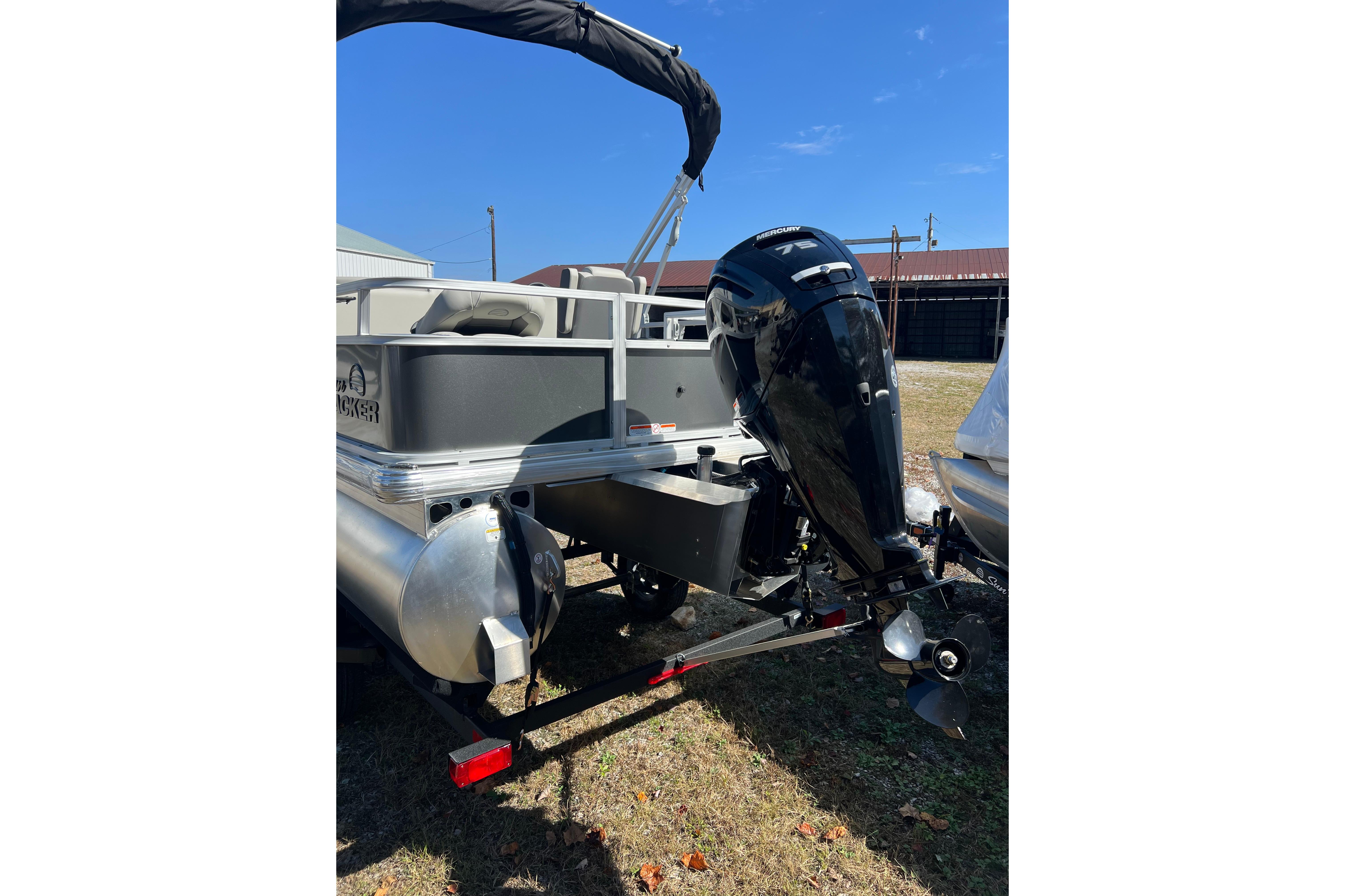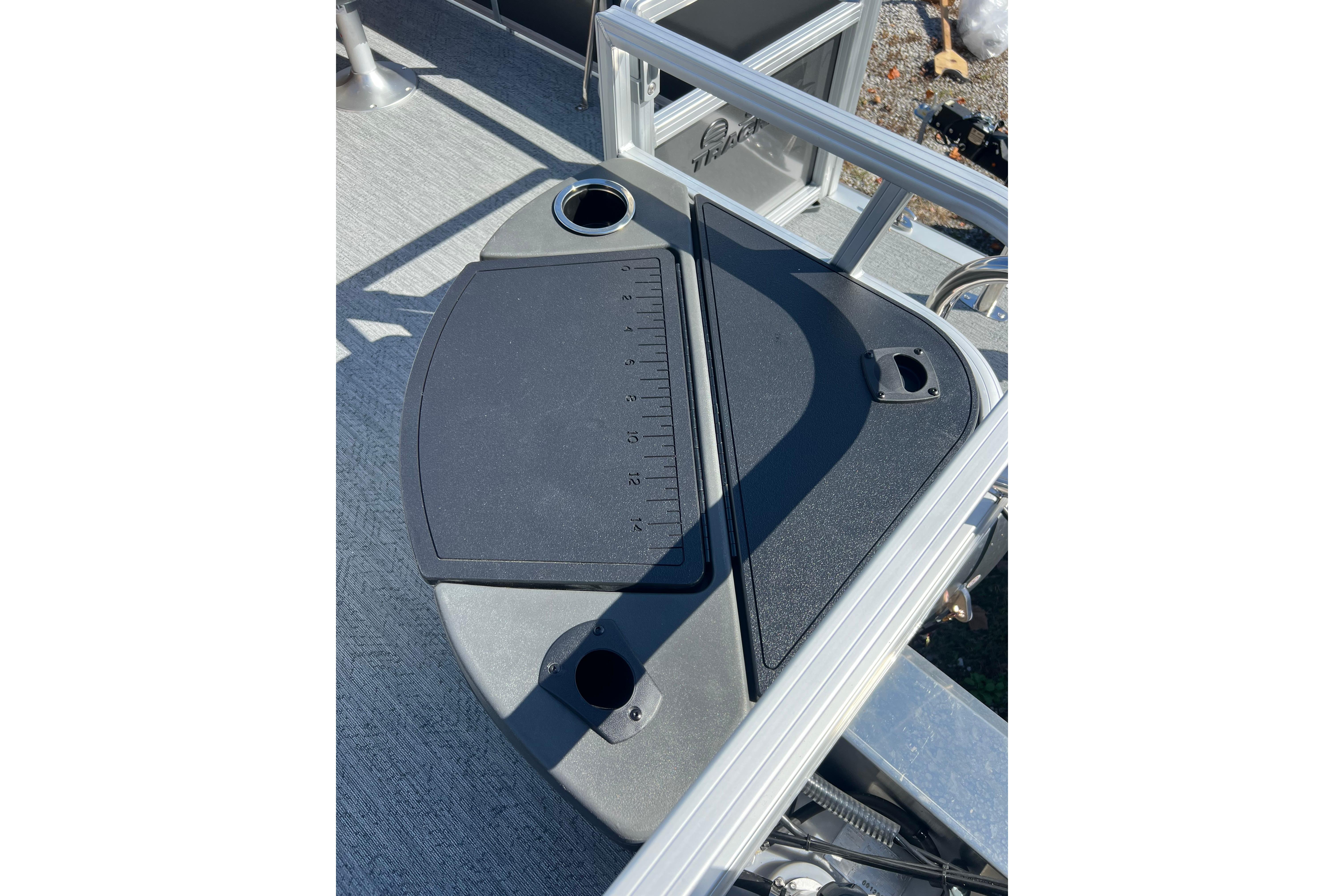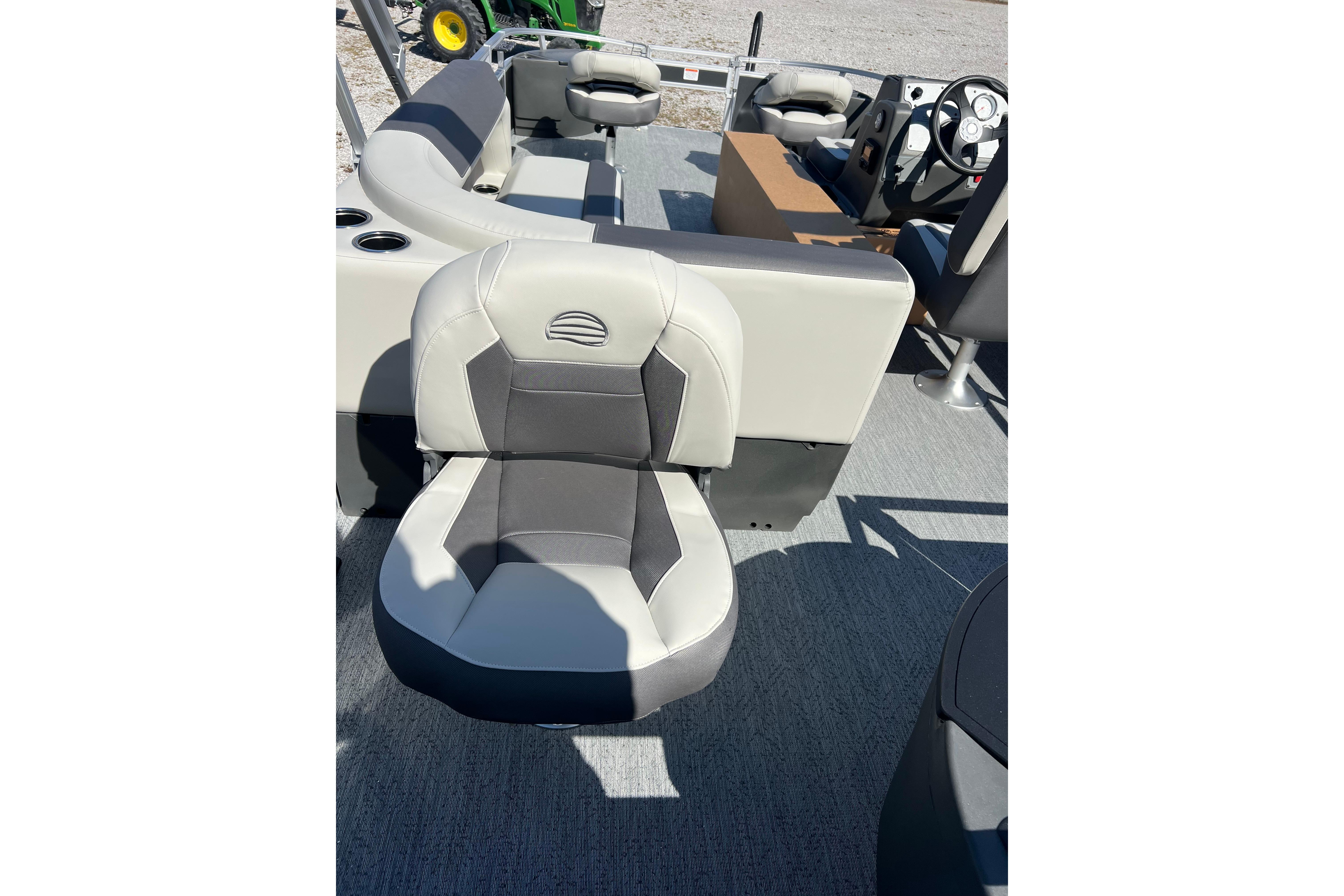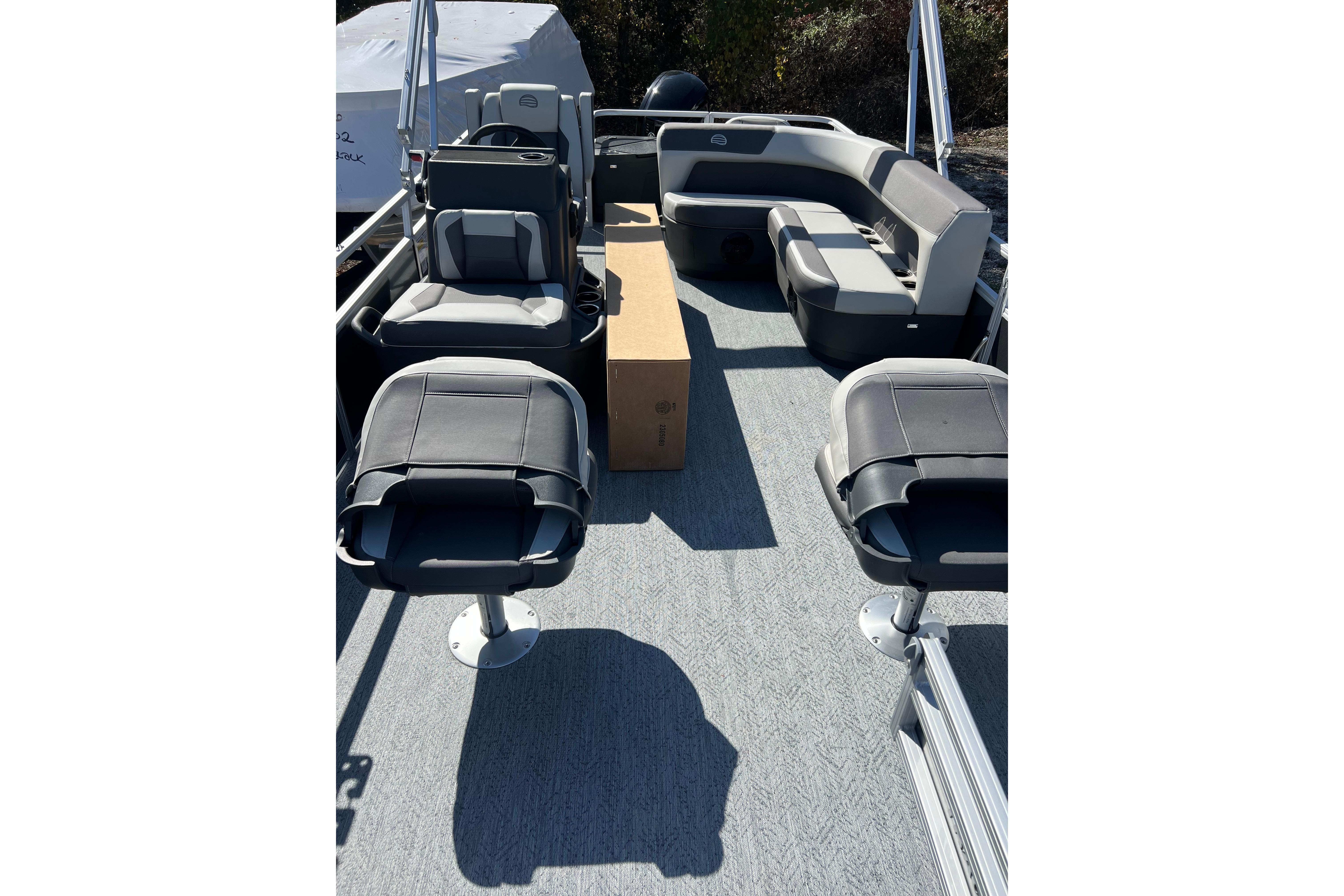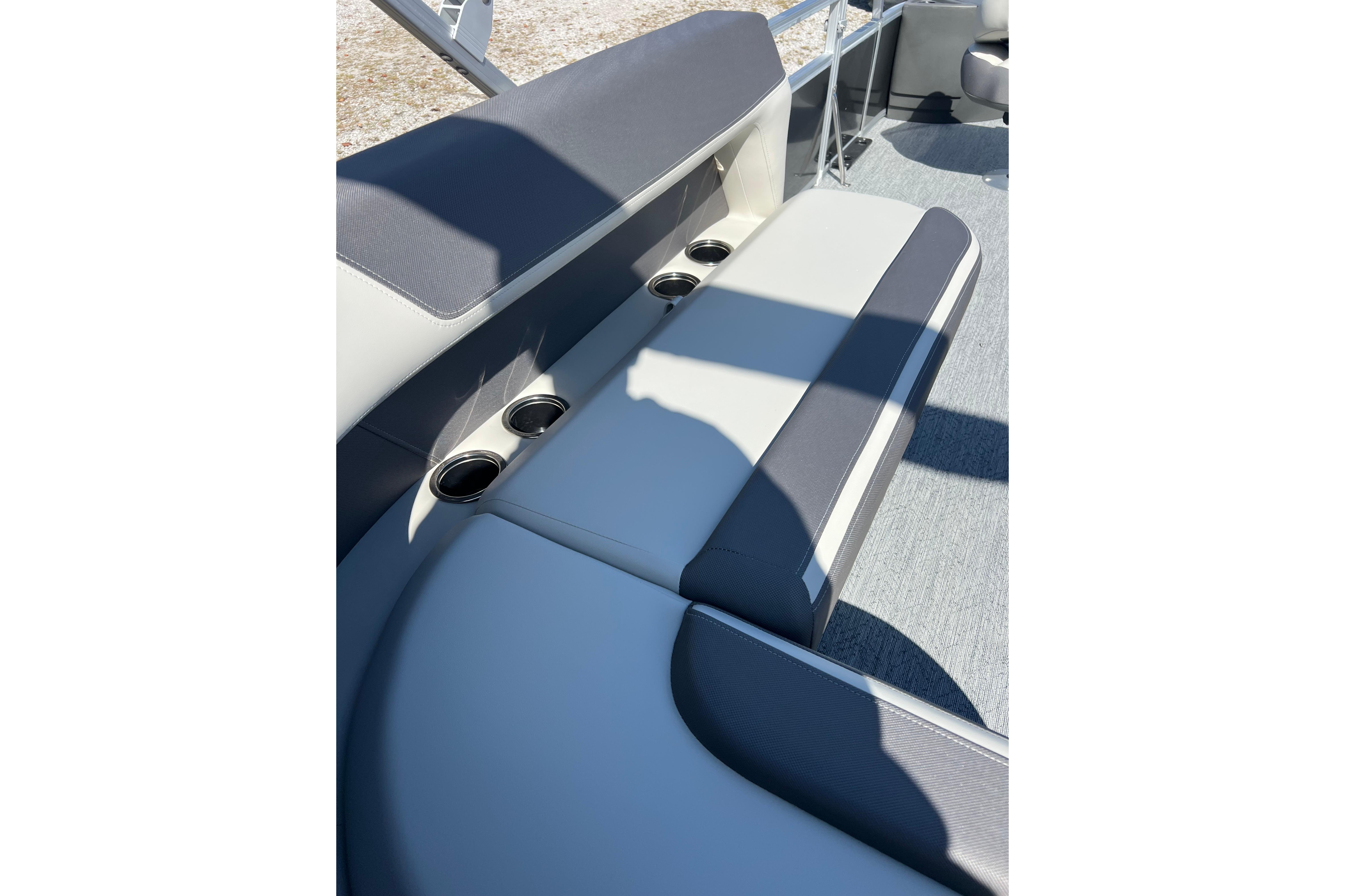 Up to eight fishin' buddies can take to the dual fishing decks of this redesigned fishin' pontoon. Three swiveling fishing chairs around a 10-gal. bow livewell and an 8-gal. aft livewell headline the list of features that make this the perfect boat for casting lines to catch fish and memories. When the fishing's done, sprawl out on the L-shaped lounge and crank up the stereo. The new and improved boarding ladder makes follow-up cannonballs a breeze. Other features new to the 2026 model year include three extra cubic feet of storage space, more cupholders, in-lounge storage, and a new seat in front of the helm.