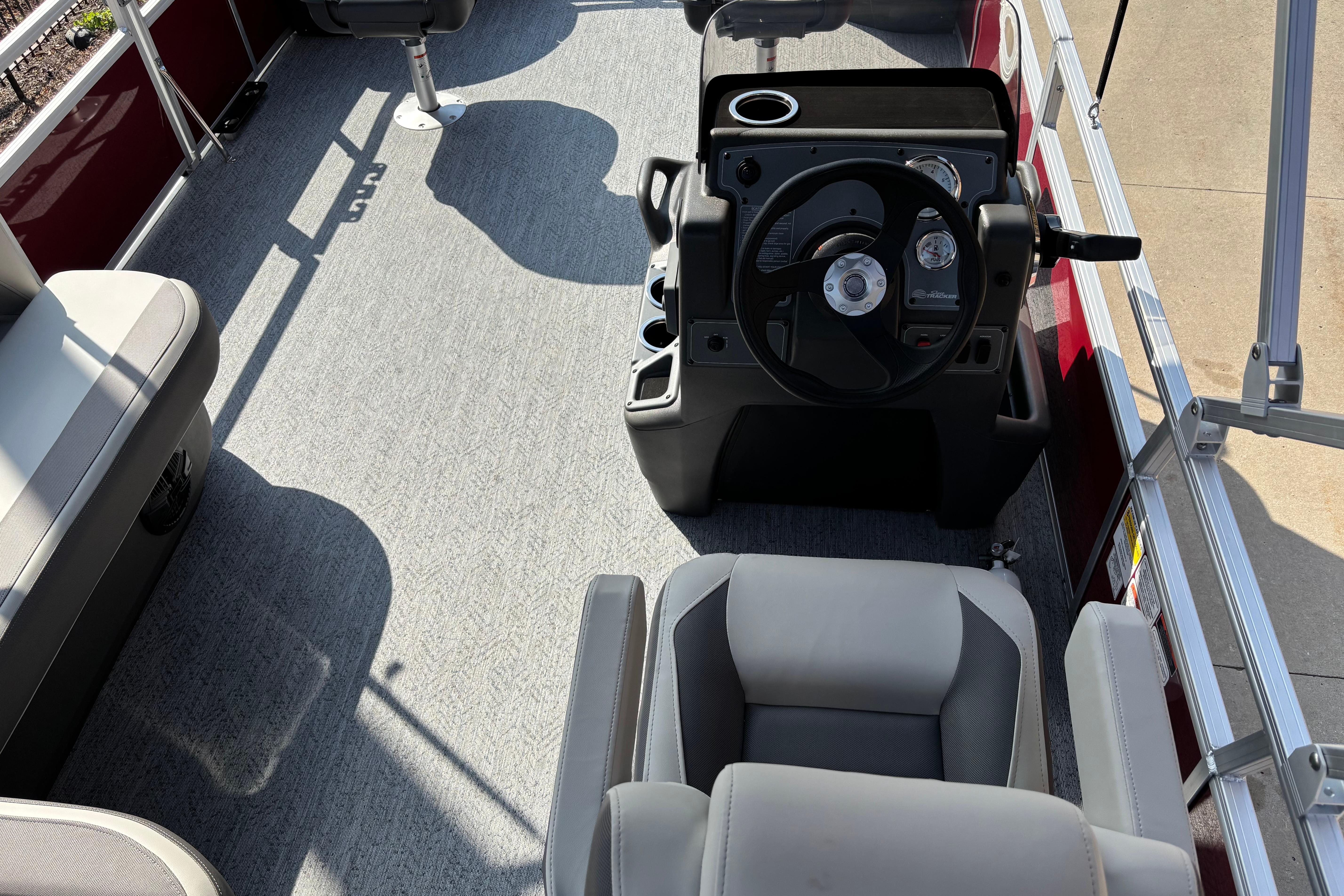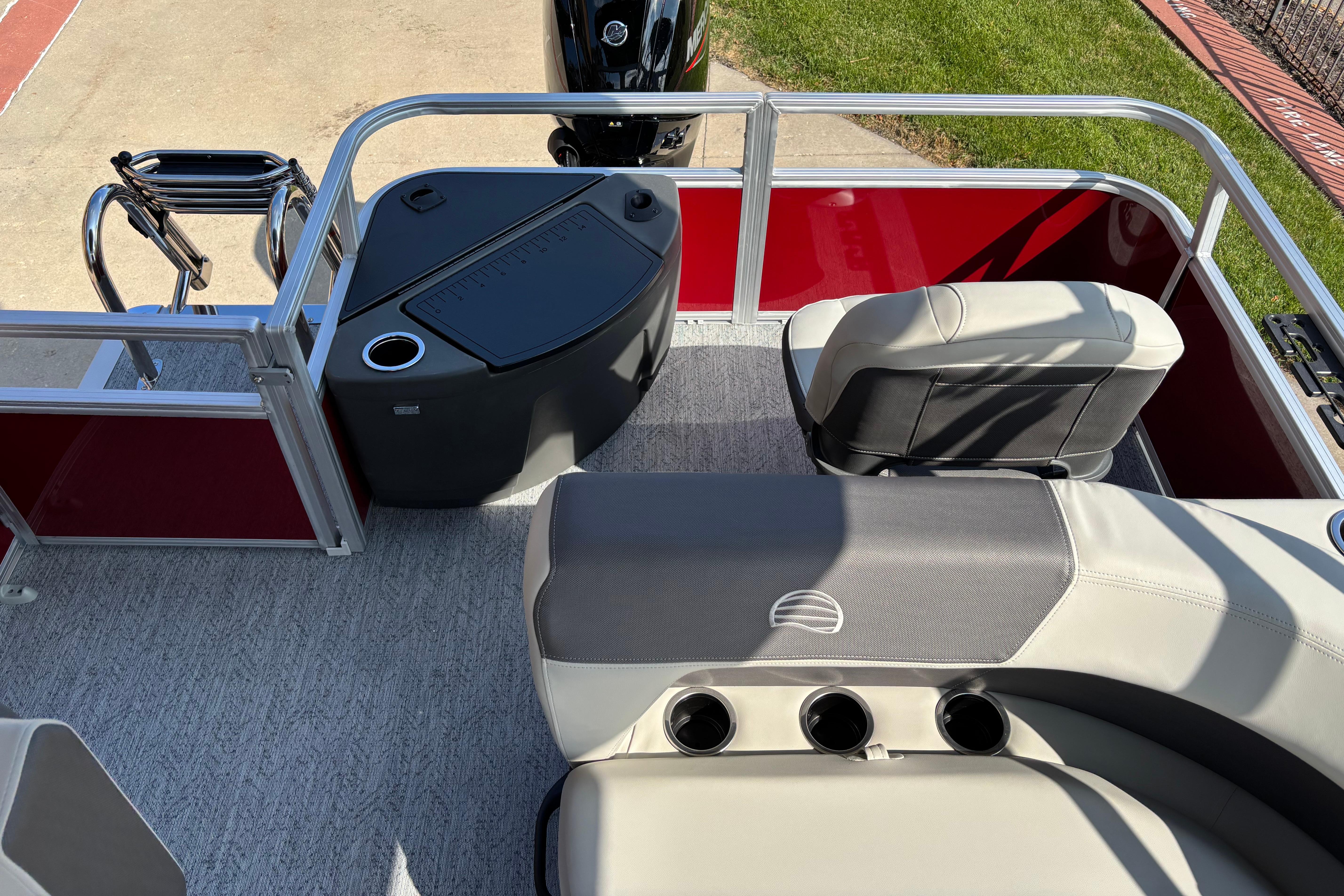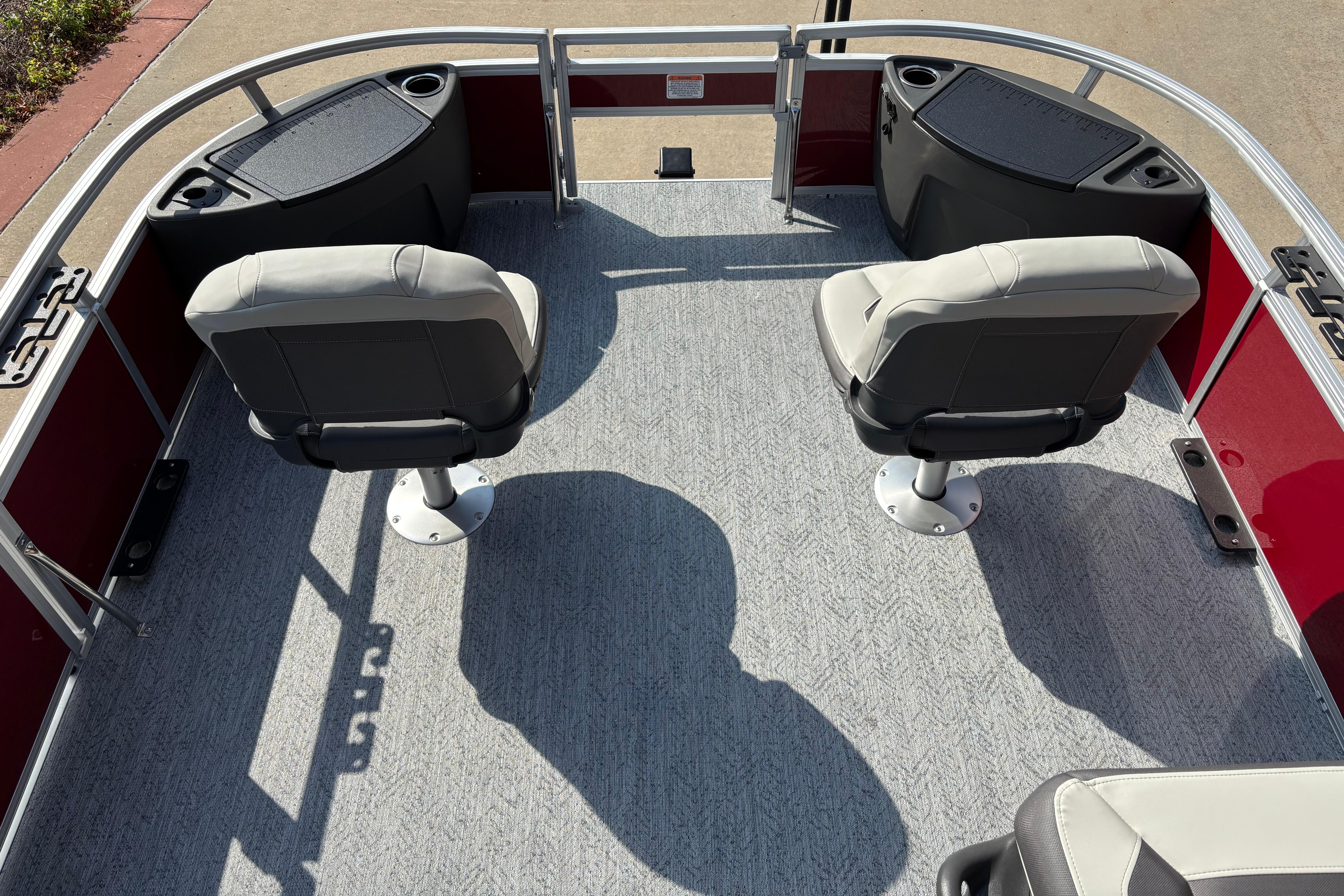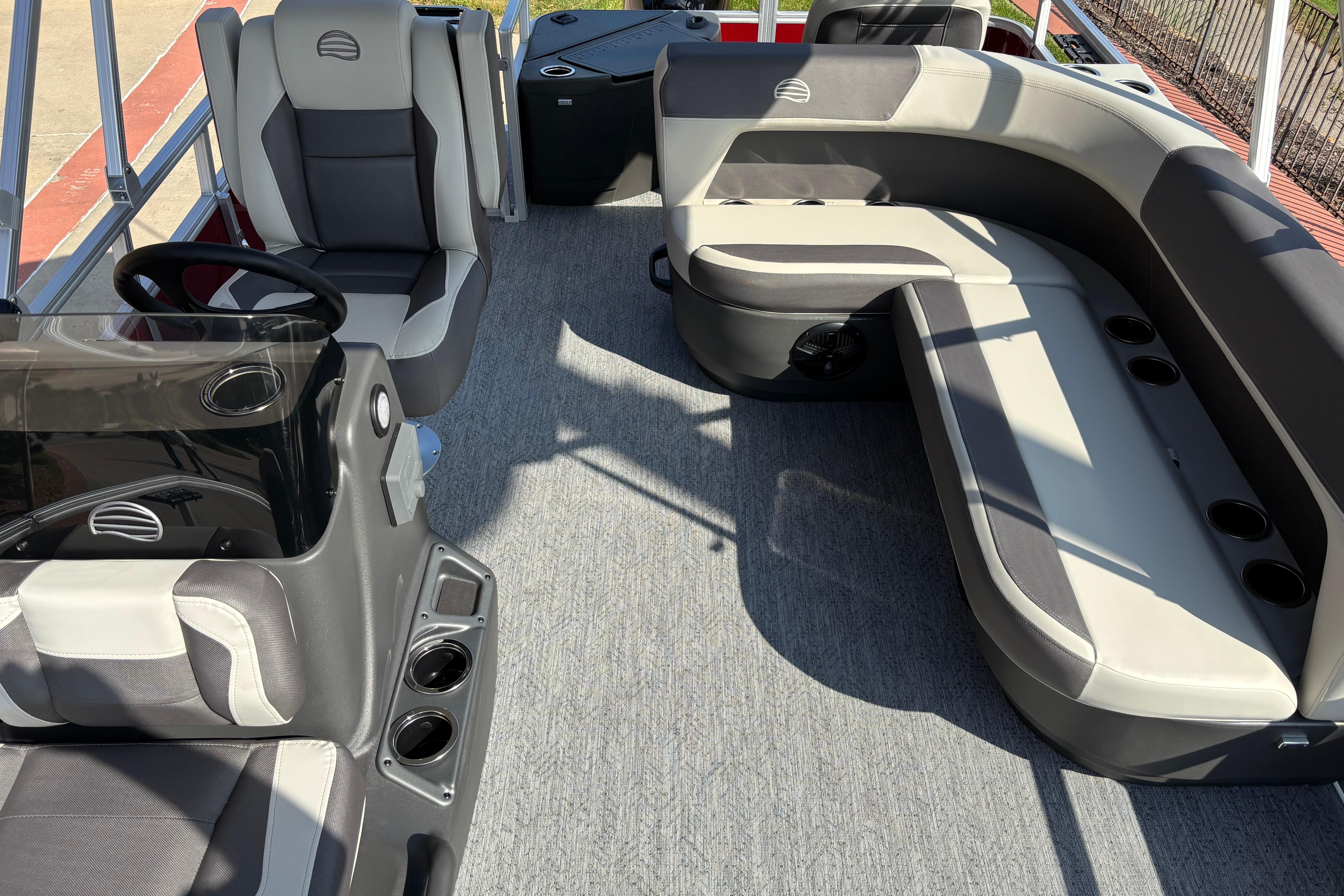 Up to eight fishin' buddies can take to the dual fishing decks of this redesigned fishin' pontoon. Three swiveling fishing chairs around a 10-gal. bow livewell and an 8-gal. aft livewell headline the list of features that make this the perfect boat for casting lines to catch fish and memories. When the fishing's done, sprawl out on the L-shaped lounge and crank up the stereo. The new and improved boarding ladder makes follow-up cannonballs a breeze. Other features new to the 2026 model year include three extra cubic feet of storage space, more cupholders, in-lounge storage, and a new seat in front of the helm.