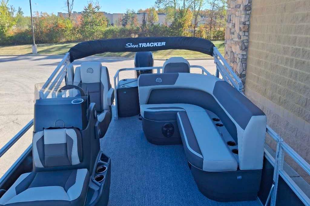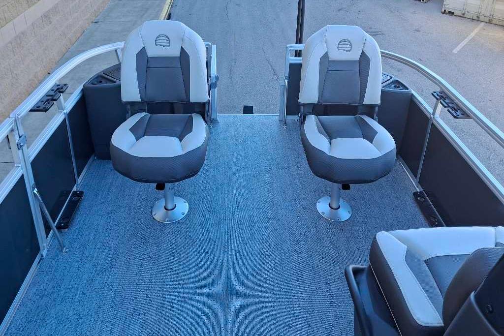 Up to eight fishin' buddies can take to the dual fishing decks of this redesigned fishin' pontoon. Three swiveling fishing chairs around a 10-gal. bow livewell and an 8-gal. aft livewell headline the list of features that make this the perfect boat for casting lines to catch fish and memories. When the fishing's done, sprawl out on the L-shaped lounge and crank up the stereo. The new and improved boarding ladder makes follow-up cannonballs a breeze. Other features new to the 2026 model year include three extra cubic feet of storage space, more cupholders, in-lounge storage, and a new seat in front of the helm.