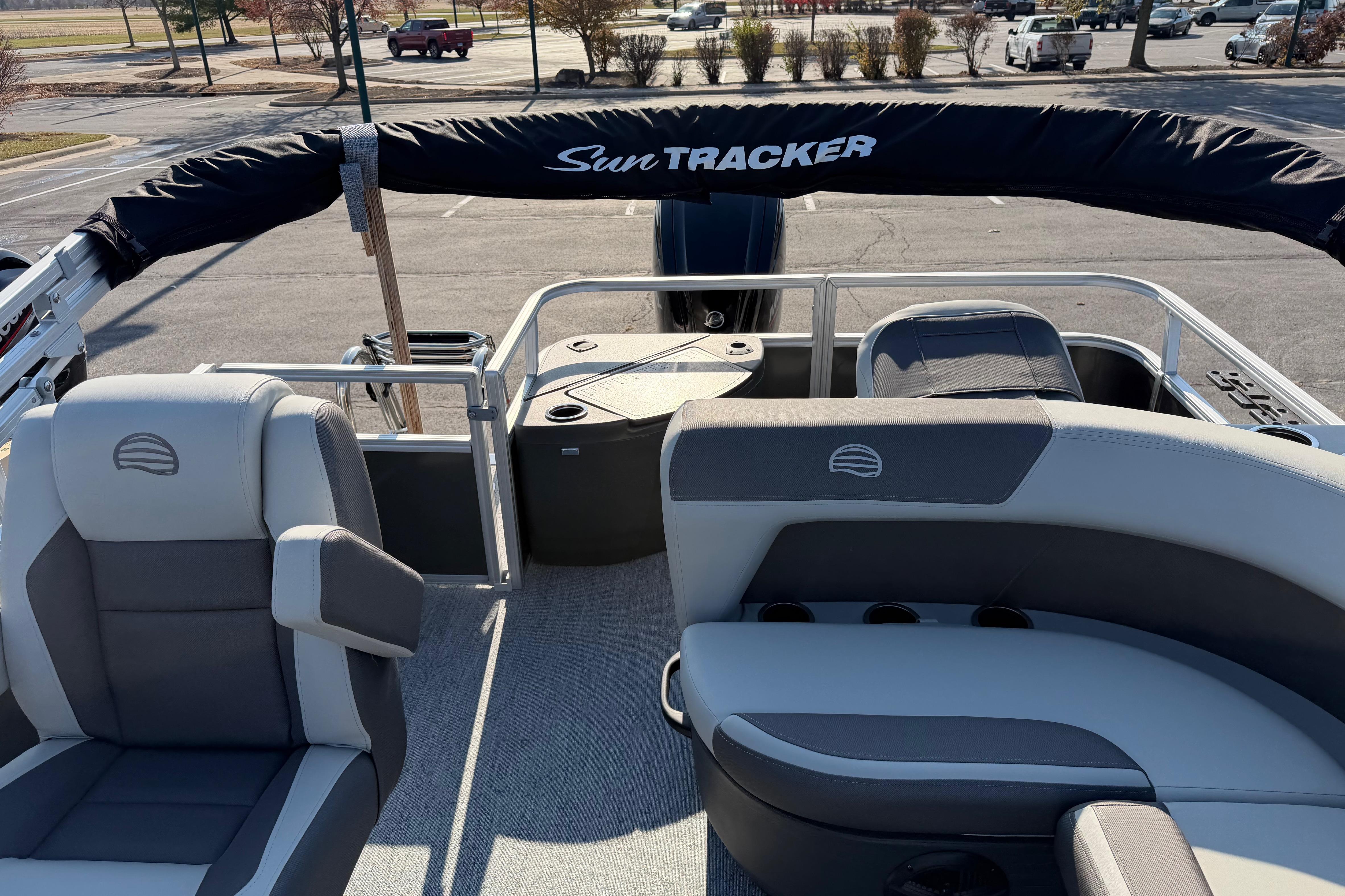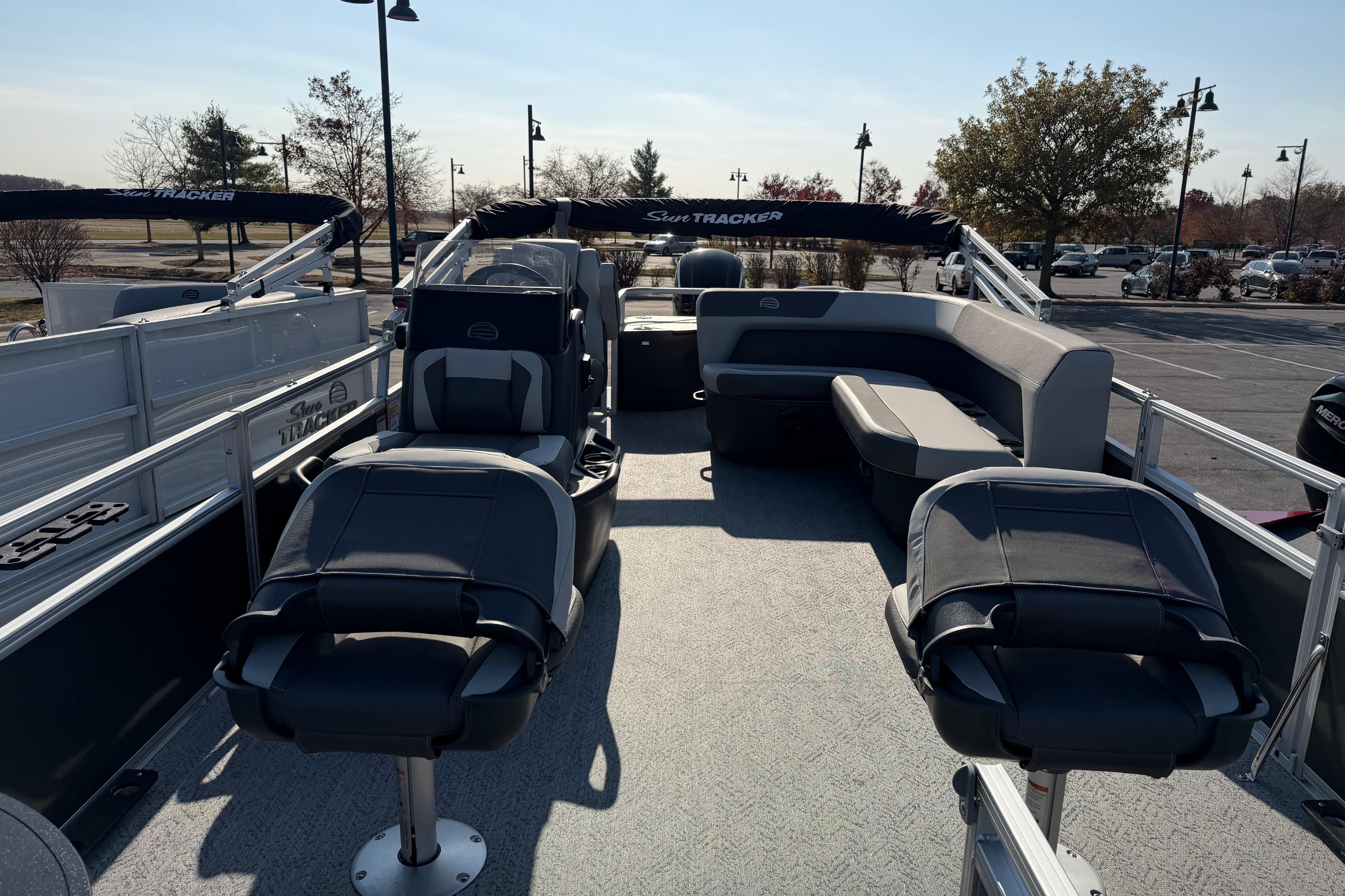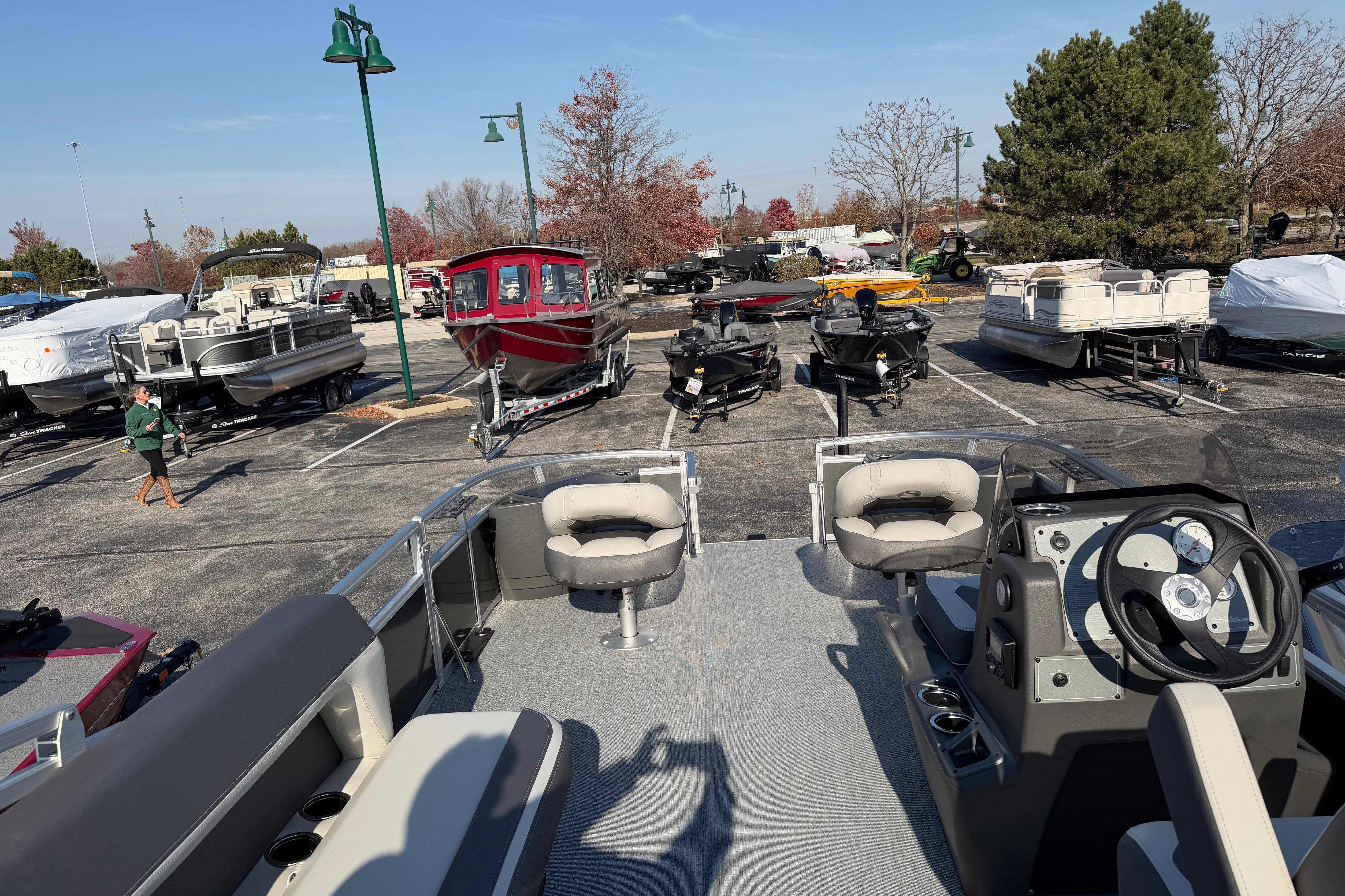 Up to eight fishin' buddies can take to the dual fishing decks of this redesigned fishin' pontoon. Three swiveling fishing chairs around a 10-gal. bow livewell and an 8-gal. aft livewell headline the list of features that make this the perfect boat for casting lines to catch fish and memories. When the fishing's done, sprawl out on the L-shaped lounge and crank up the stereo. The new and improved boarding ladder makes follow-up cannonballs a breeze. Other features new to the 2026 model year include three extra cubic feet of storage space, more cupholders, in-lounge storage, and a new seat in front of the helm.