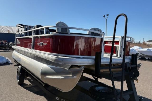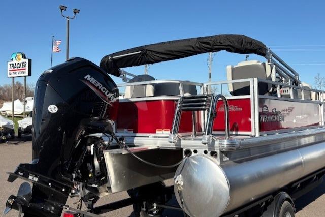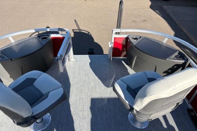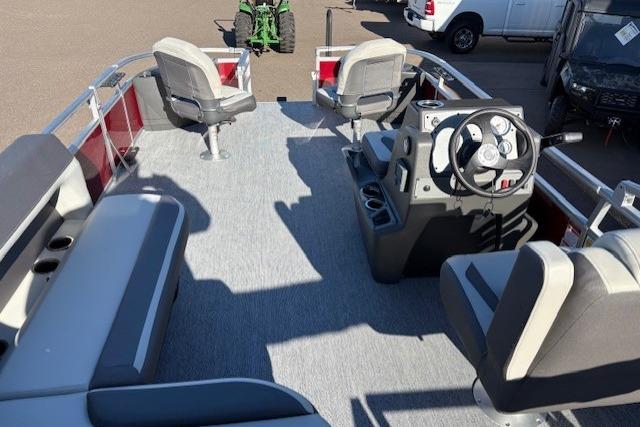 Up to eight fishin' buddies can take to the dual fishing decks of this redesigned fishin' pontoon. Three swiveling fishing chairs around a 10-gal. bow livewell and an 8-gal. aft livewell headline the list of features that make this the perfect boat for casting lines to catch fish and memories. When the fishing's done, sprawl out on the L-shaped lounge and crank up the stereo. The new and improved boarding ladder makes follow-up cannonballs a breeze. Other features new to the 2026 model year include three extra cubic feet of storage space, more cupholders, in-lounge storage, and a new seat in front of the helm.