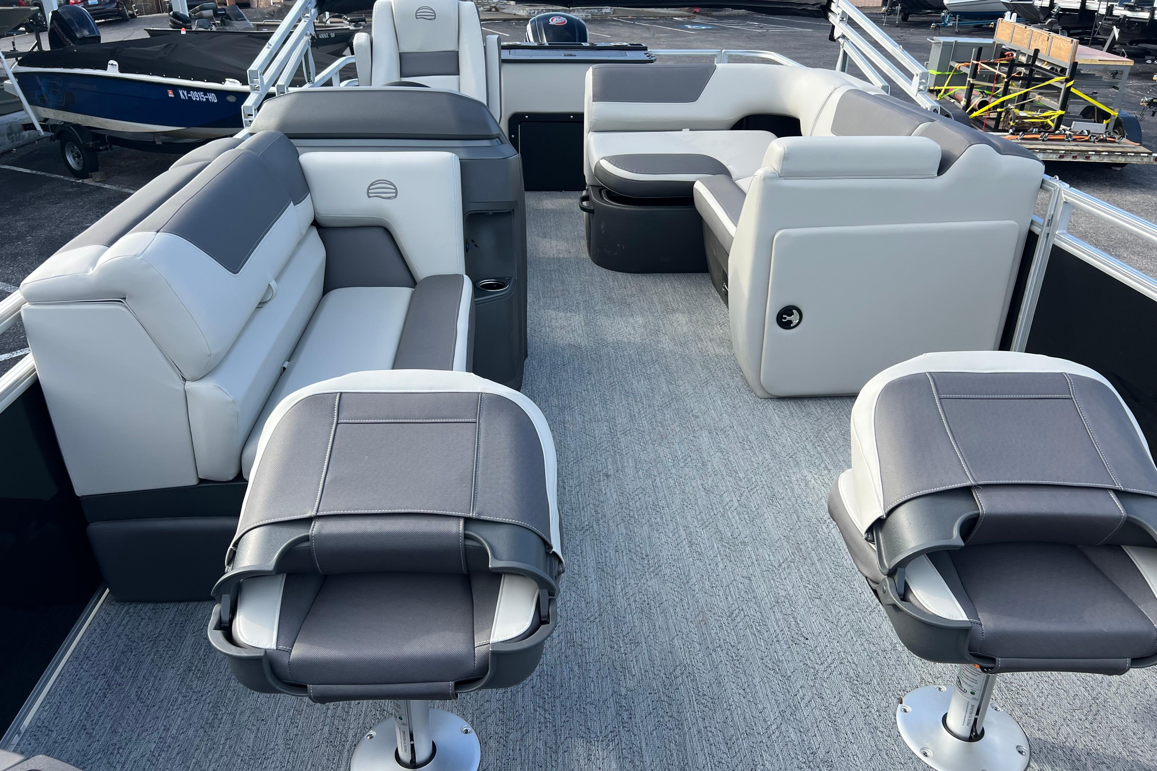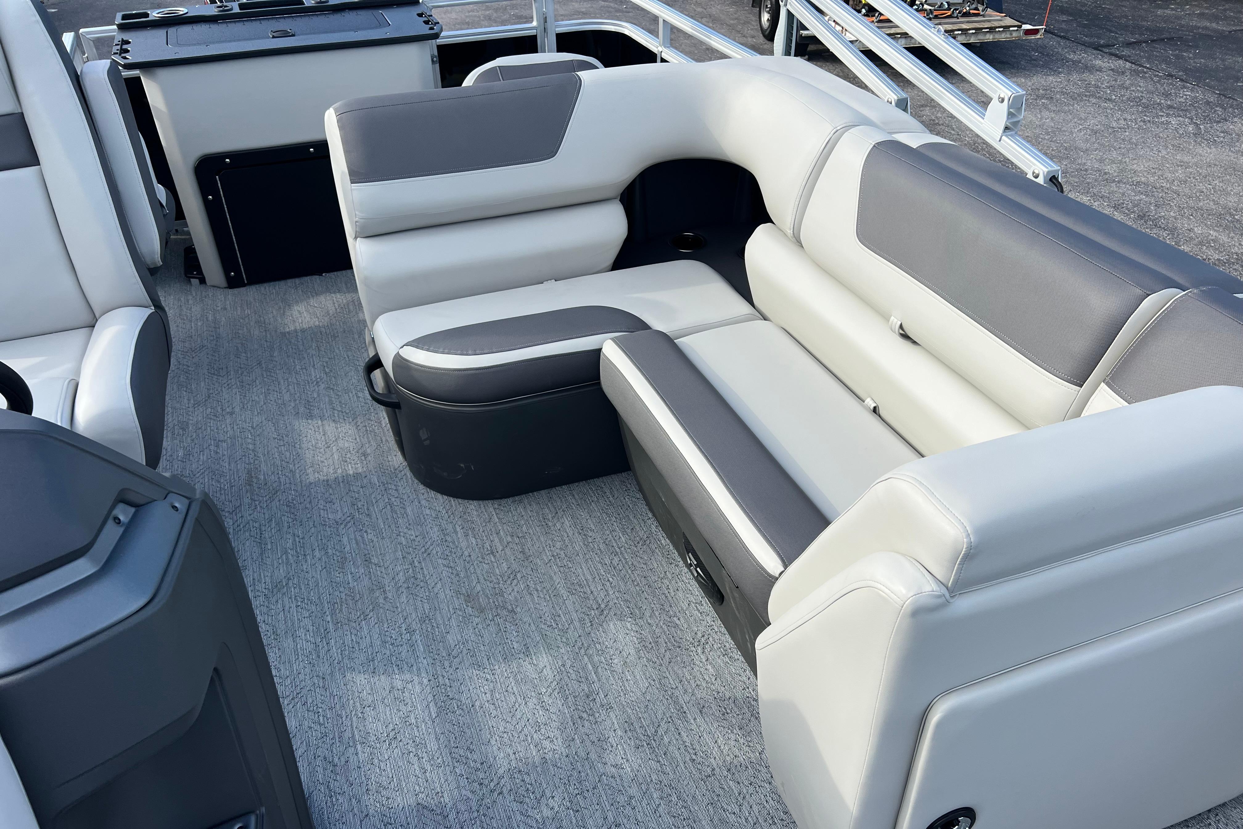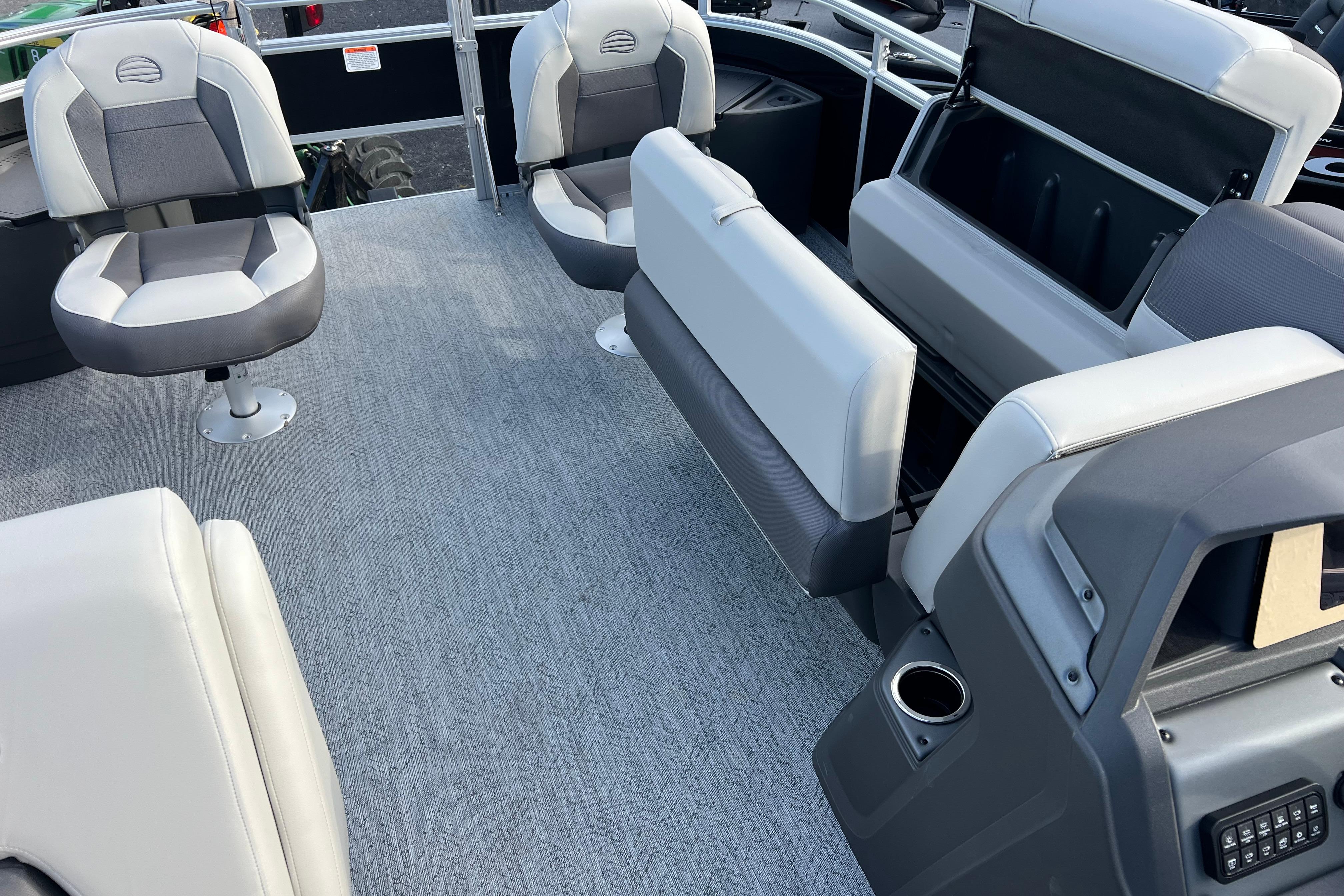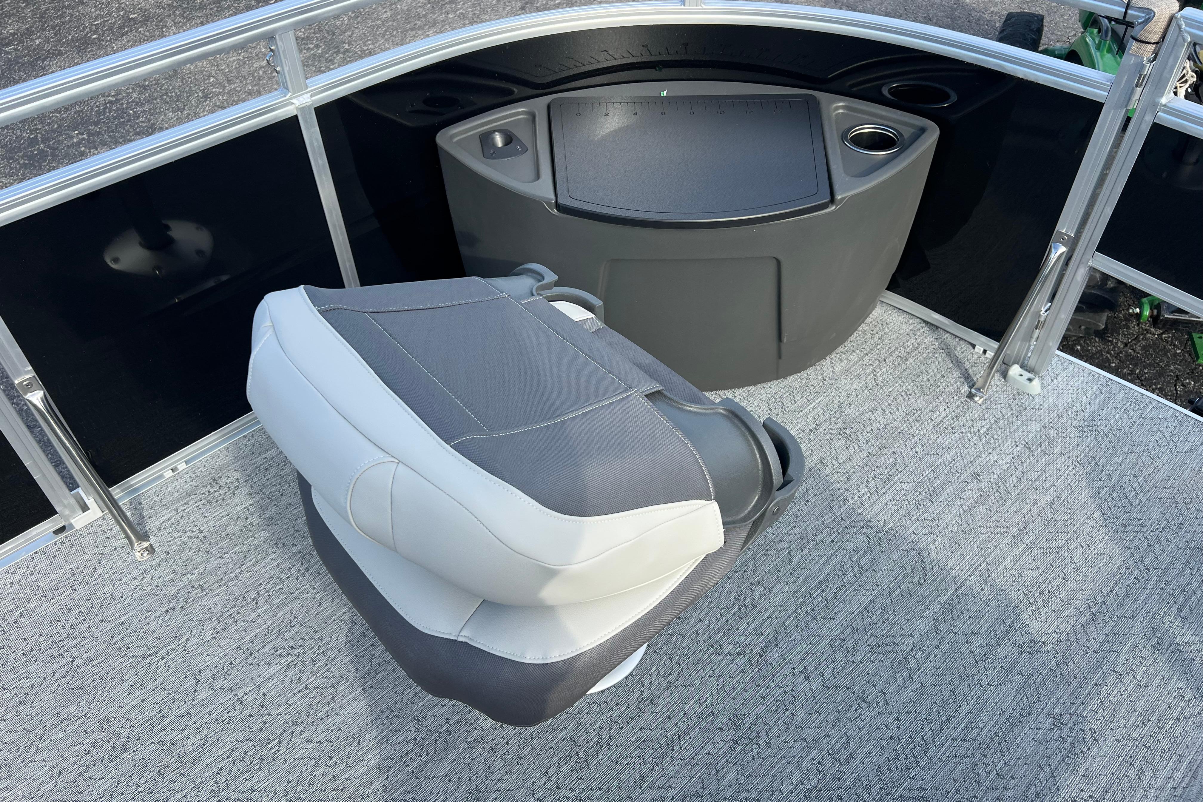 This fishing pontoon’s 19' 10" deck fits up to 10 people looking for a great day of casting lines. When it’s time for lunch, set up the removable table with drink holders near the comfortable L-shaped aft lounge. Your guests can also relax in the lounge seat in front of the driver’s console.