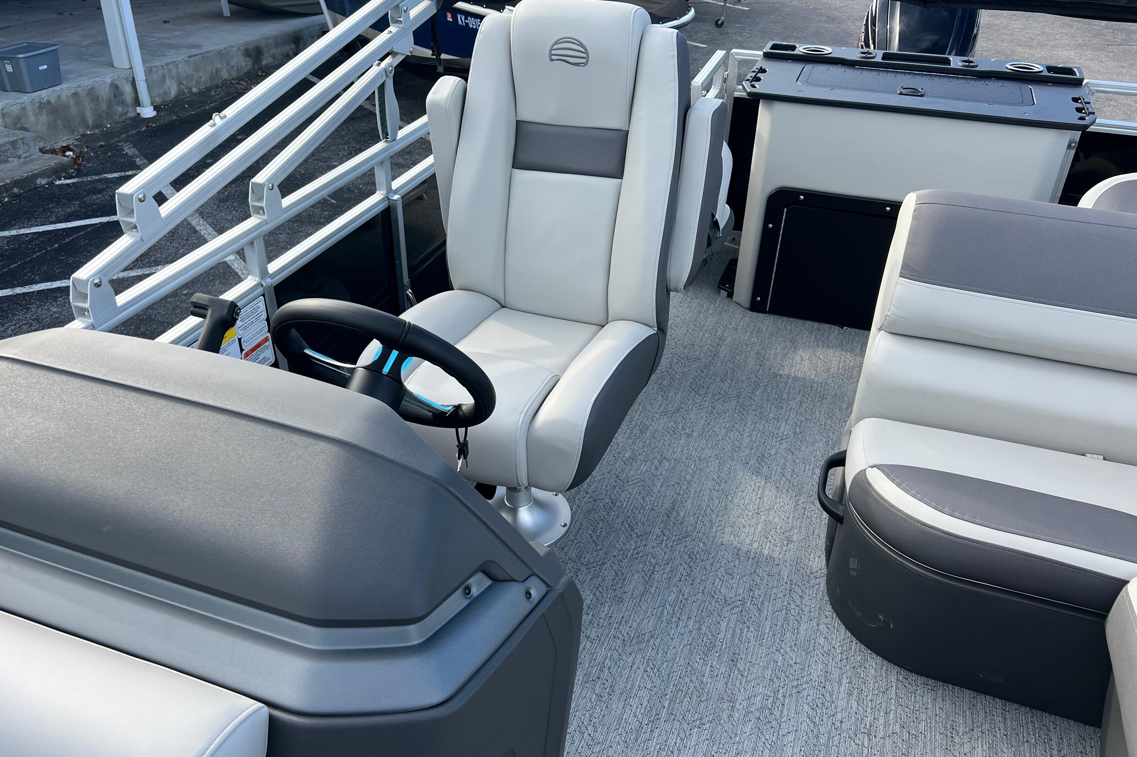 • Reclining, high-back swiveling helm bucket seat w/self-leveling armrests