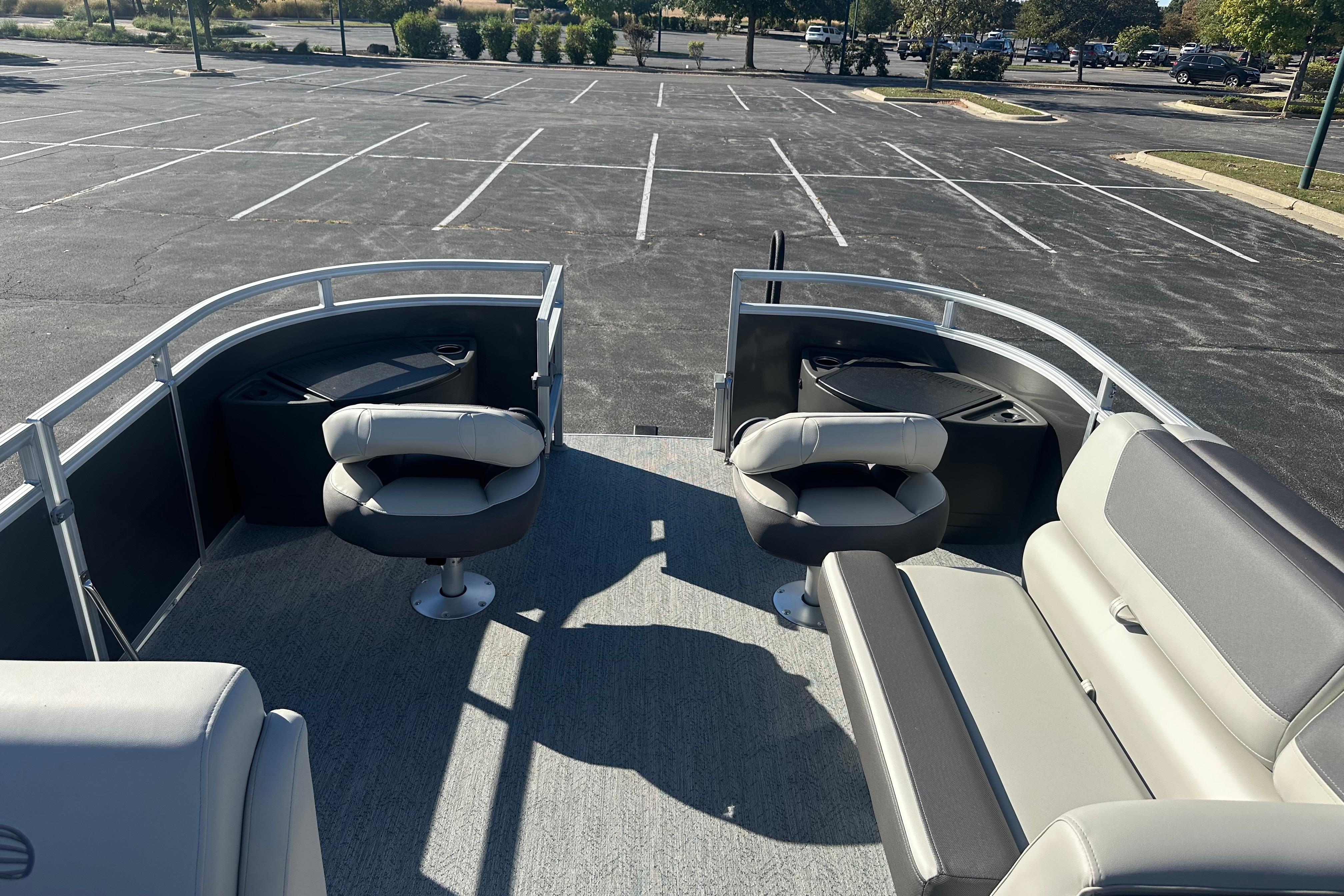 • Front fishing station w/2 pedestal seat base locations; rail-mounted rod & tool holders; & bow starboard storage compartment w/rod & drink holders