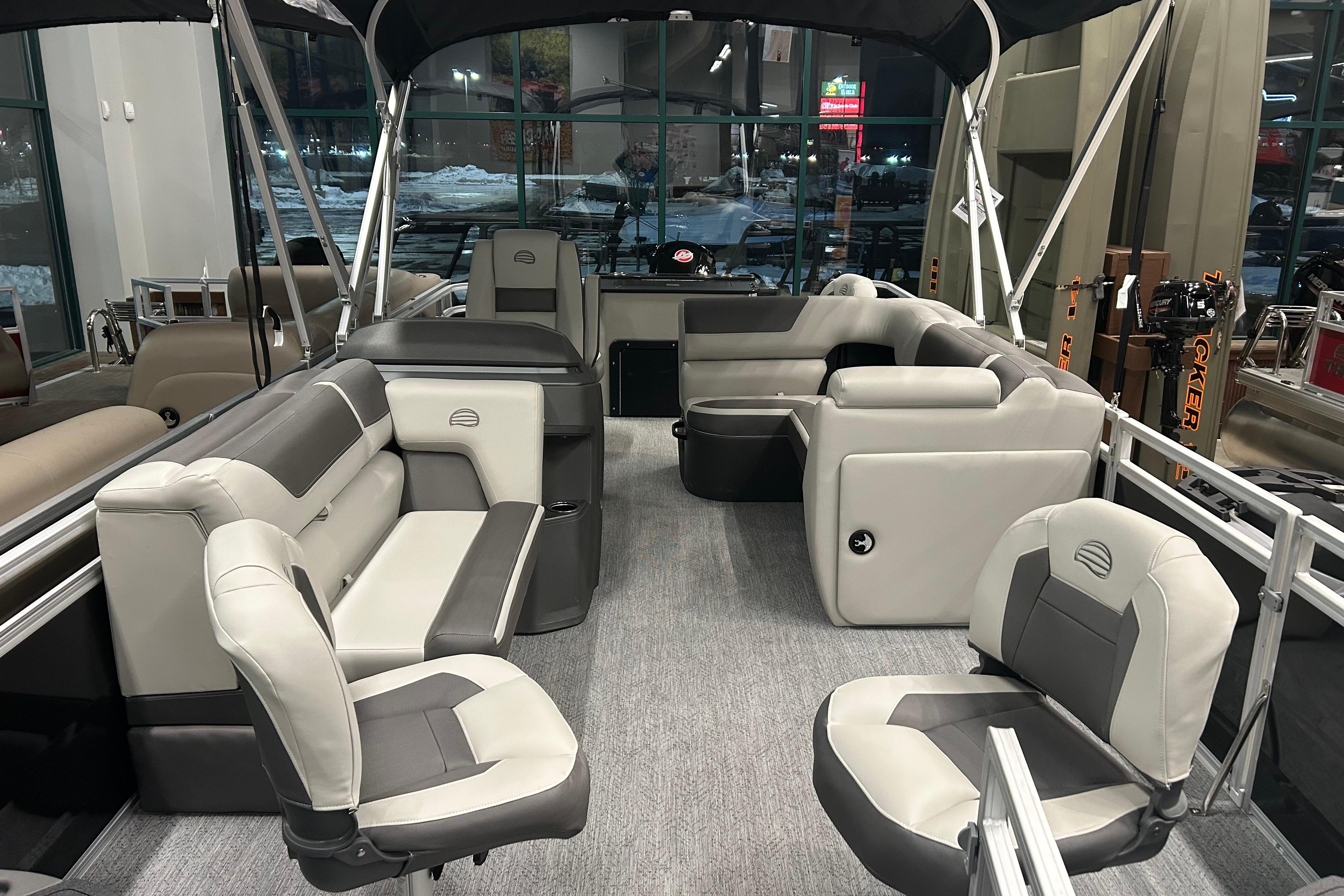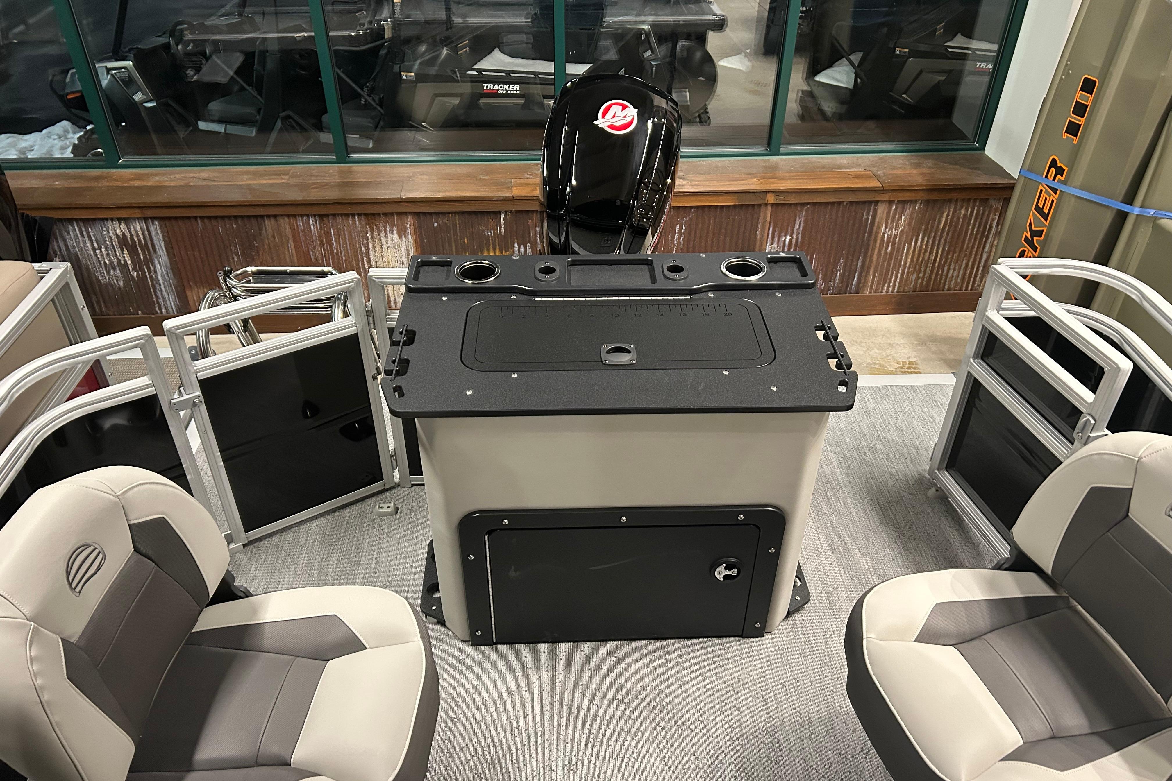 This fishing pontoon’s 19' 10" deck fits up to 10 people looking for a great day of casting lines. When it’s time for lunch, set up the removable table with drink holders near the comfortable L-shaped aft lounge. Your guests can also relax in the lounge seat in front of the driver’s console.