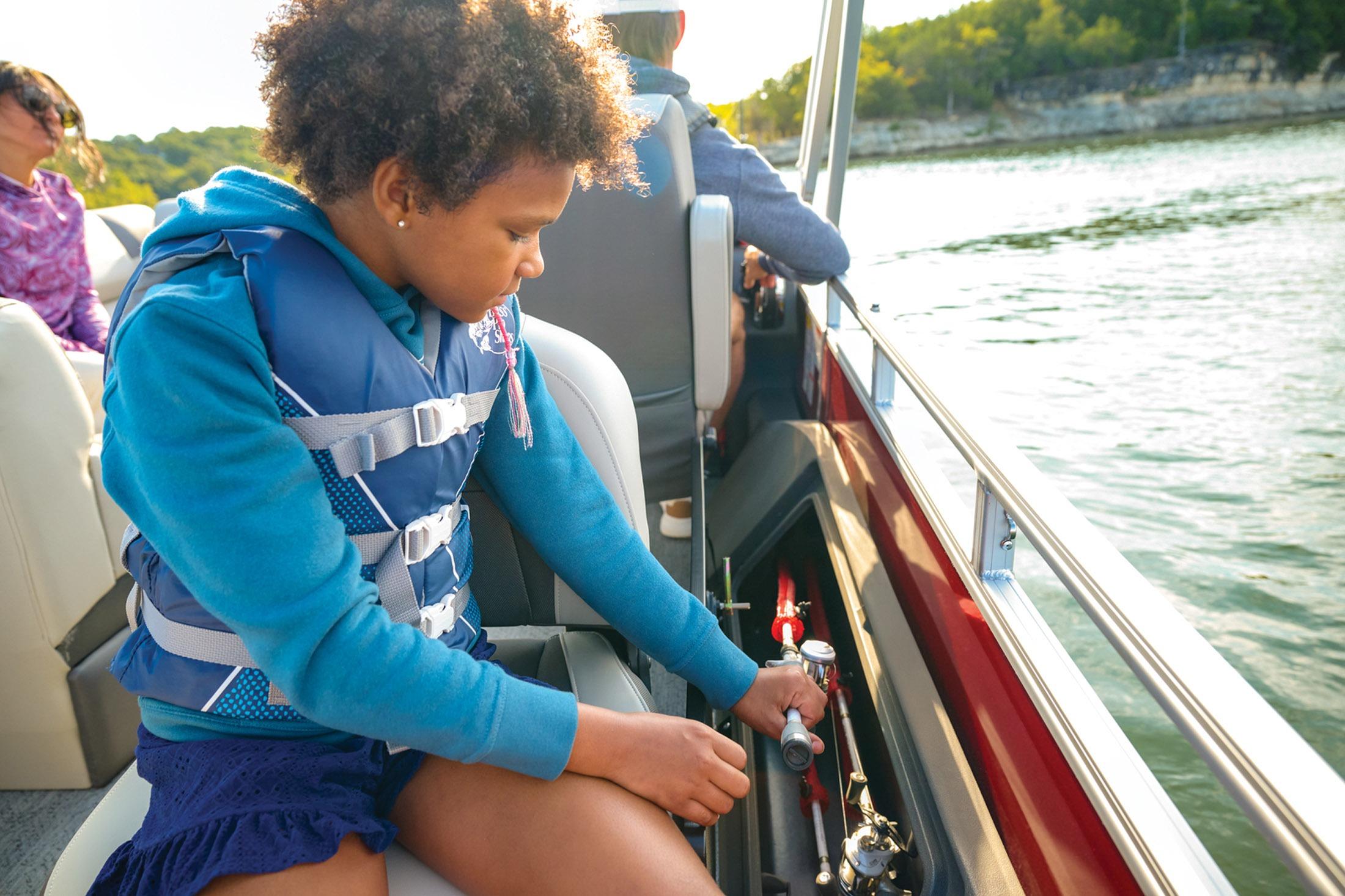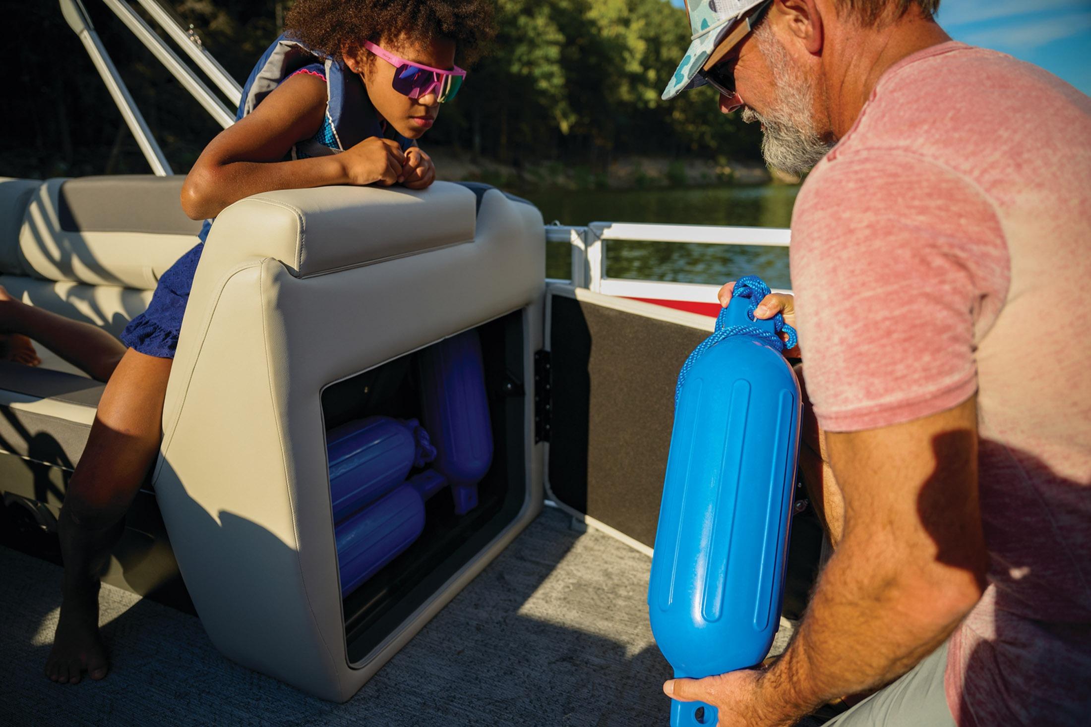 You can keep your other supplies in the hidden under-seat and seat-back STOW MORE™ compartments. The 2026 model adds improved storage built right into the lounge's backrest that includes extra cupholders and space for more gear. Between the removable table, the 10' bimini top, the brand-new boarding ladder with wider steps, and the Bluetooth®-capable stereo, your lake days are covered.