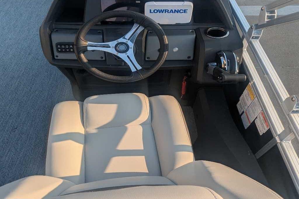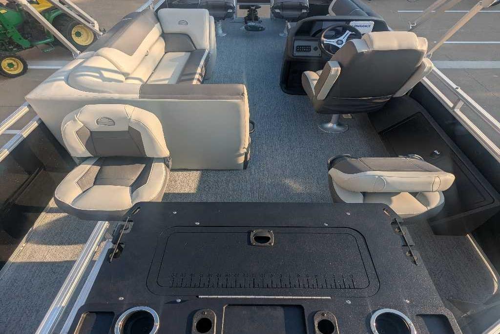 You can keep your other supplies in the hidden under-seat and seat-back STOW MORE™ compartments. The 2026 model adds improved storage built right into the lounge's backrest that includes extra cupholders and space for more gear. Between the removable table, the 10' bimini top, the brand-new boarding ladder with wider steps, and the Bluetooth®-capable stereo, your lake days are covered.