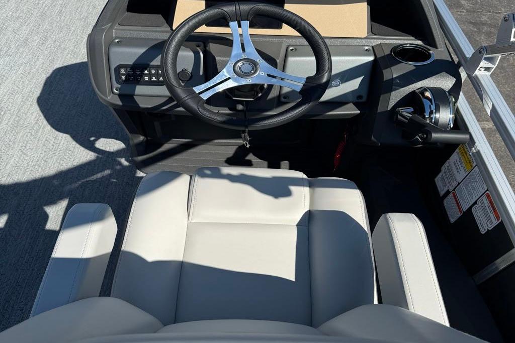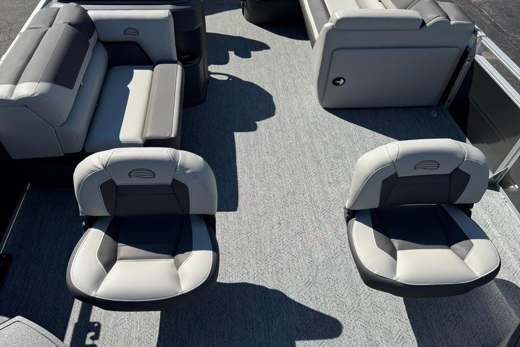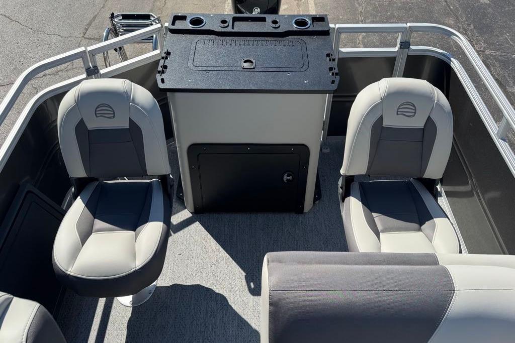 You can keep your other supplies in the hidden under-seat and seat-back STOW MORE™ compartments. The 2026 model adds improved storage built right into the lounge's backrest that includes extra cupholders and space for more gear. Between the removable table, the 10' bimini top, the brand-new boarding ladder with wider steps, and the Bluetooth®-capable stereo, your lake days are covered.