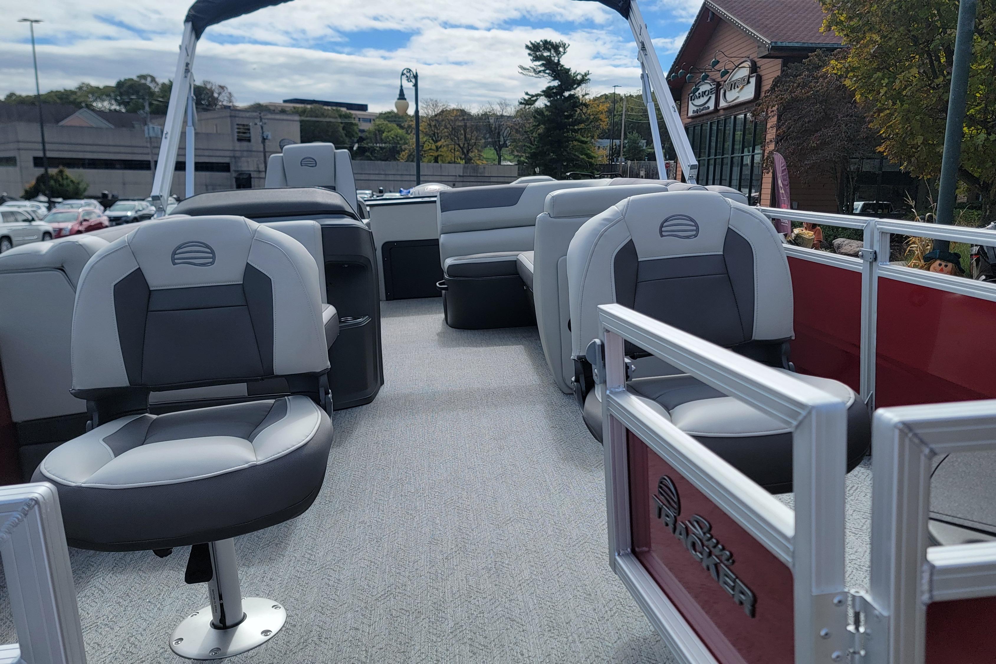You can keep your other supplies in the hidden under-seat and seat-back STOW MORE™ compartments. The 2026 model adds improved storage built right into the lounge's backrest that includes extra cupholders and space for more gear. Between the removable table, the 10' bimini top, the brand-new boarding ladder with wider steps, and the Bluetooth®-capable stereo, your lake days are covered.