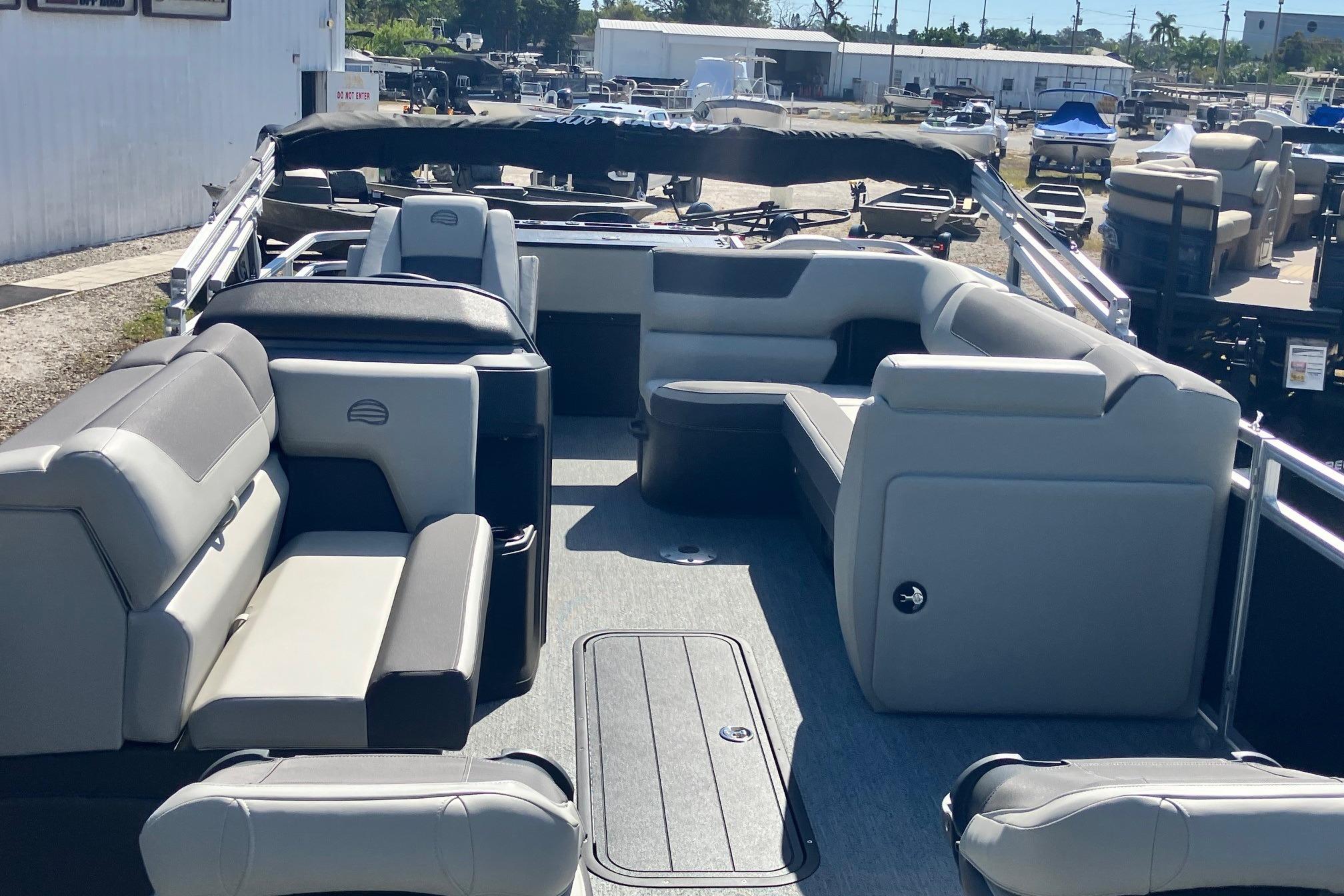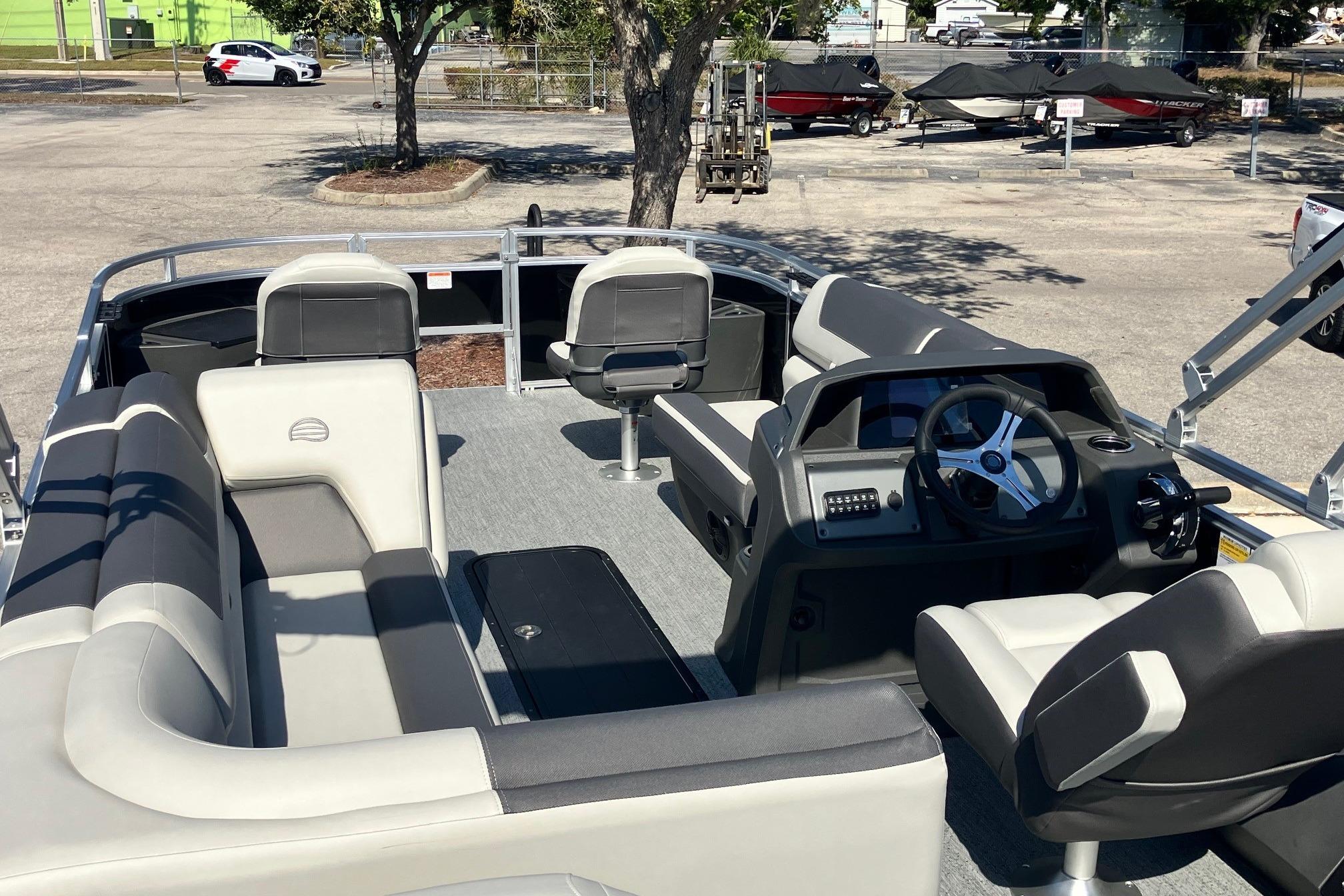 Captains can control it all with the SUN TRACKER FLARE™ touch-screen gauge display. Set up the 10' bimini top, grab your rod out of the lockable rod box, and post up in one of the two fishing decks—each of which sports a 16-gal. aerated livewell—and two swiveling fishing chairs next to rod and tool holders. The dual lounges or aft bench with hidden storage are ready for relaxation. The lounges’ all-new open section in the backrest increases accessible storage and even has extra cupholders. 2026 also brings a wider, ergonomic boarding ladder.