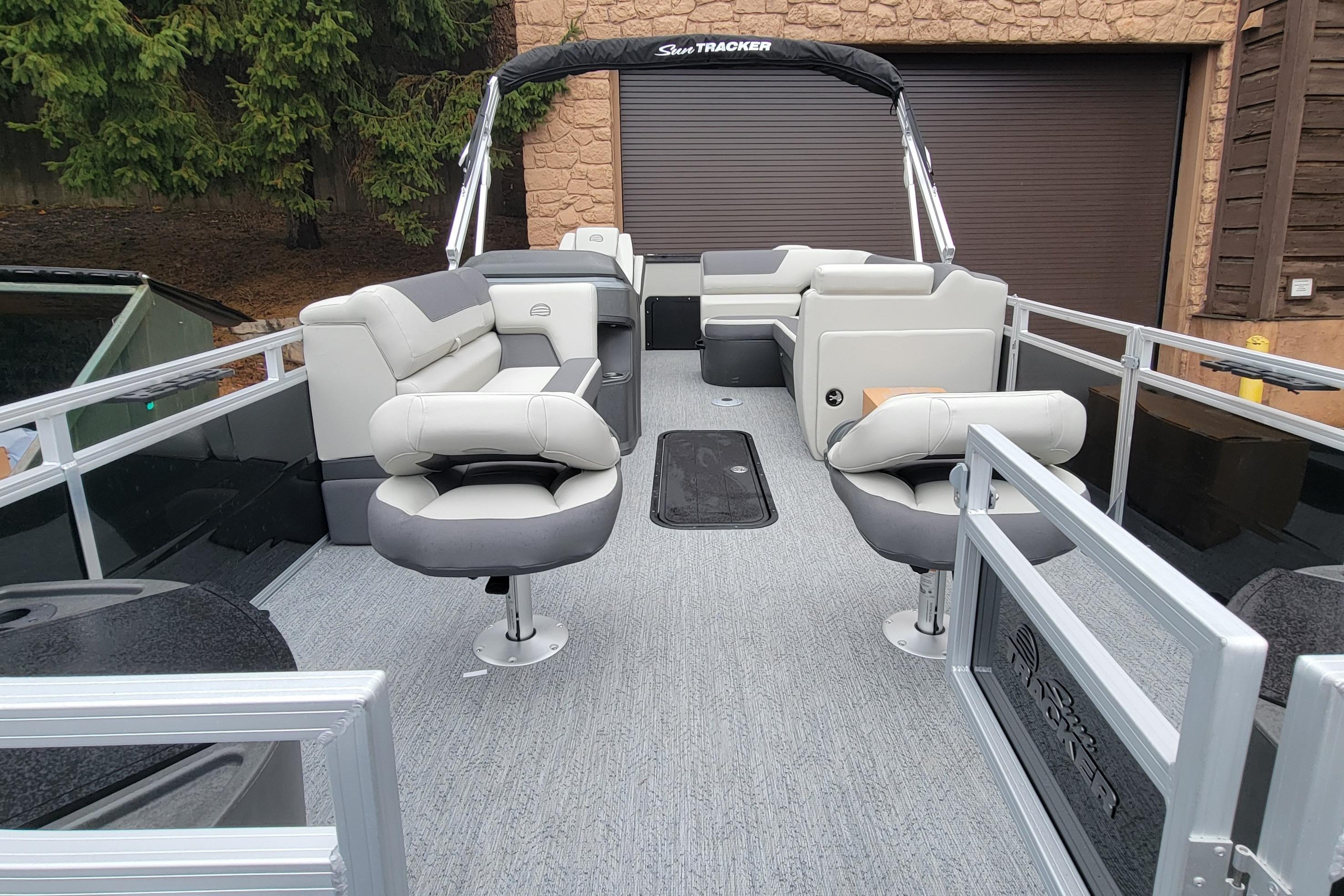 Captains can control it all with the SUN TRACKER FLARE™ touch-screen gauge display. Set up the 10' bimini top, grab your rod out of the lockable rod box, and post up in one of the two fishing decks—each of which sports a 16-gal. aerated livewell—and two swiveling fishing chairs next to rod and tool holders. The dual lounges or aft bench with hidden storage are ready for relaxation. The lounges’ all-new open section in the backrest increases accessible storage and even has extra cupholders. 2026 also brings a wider, ergonomic boarding ladder.
