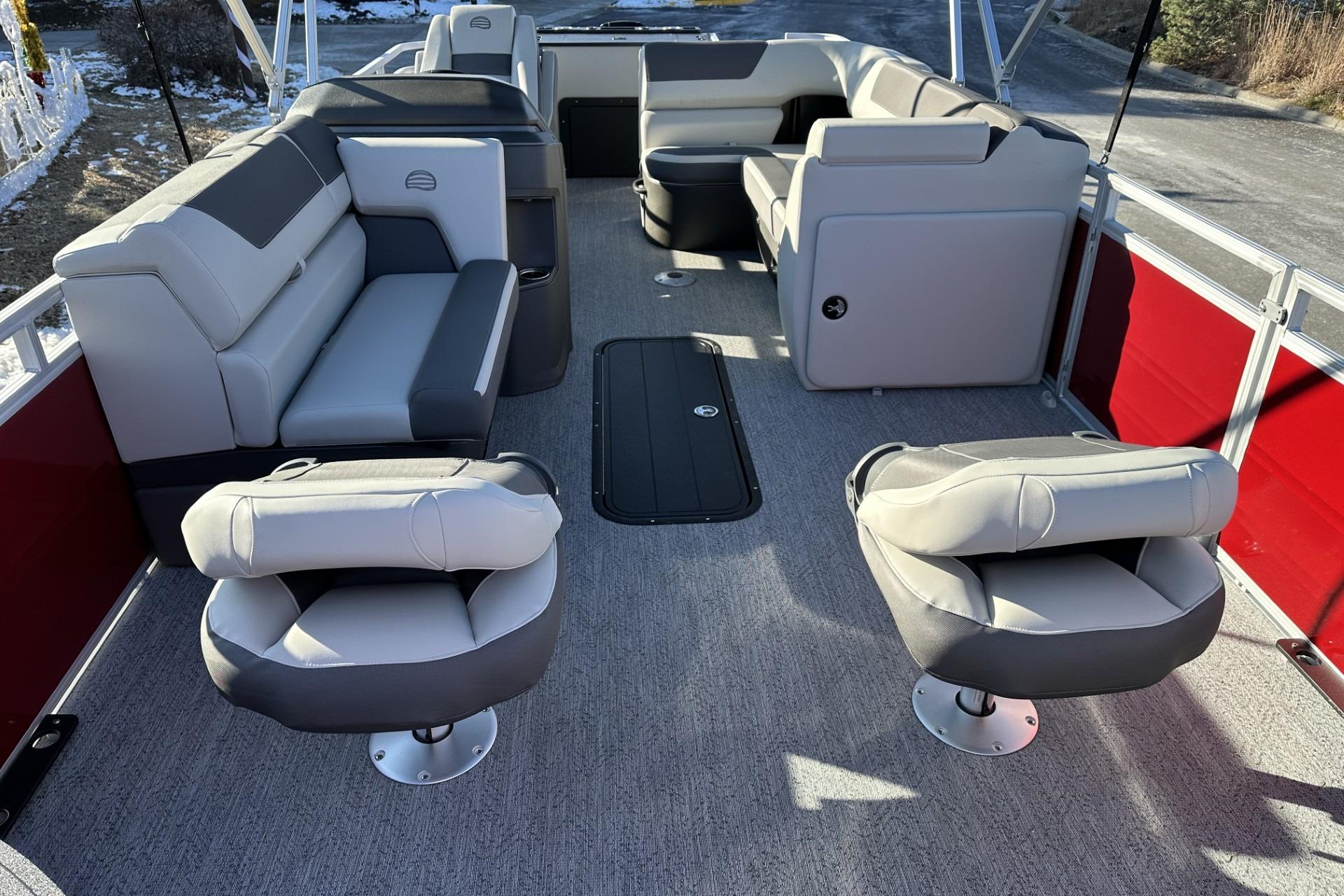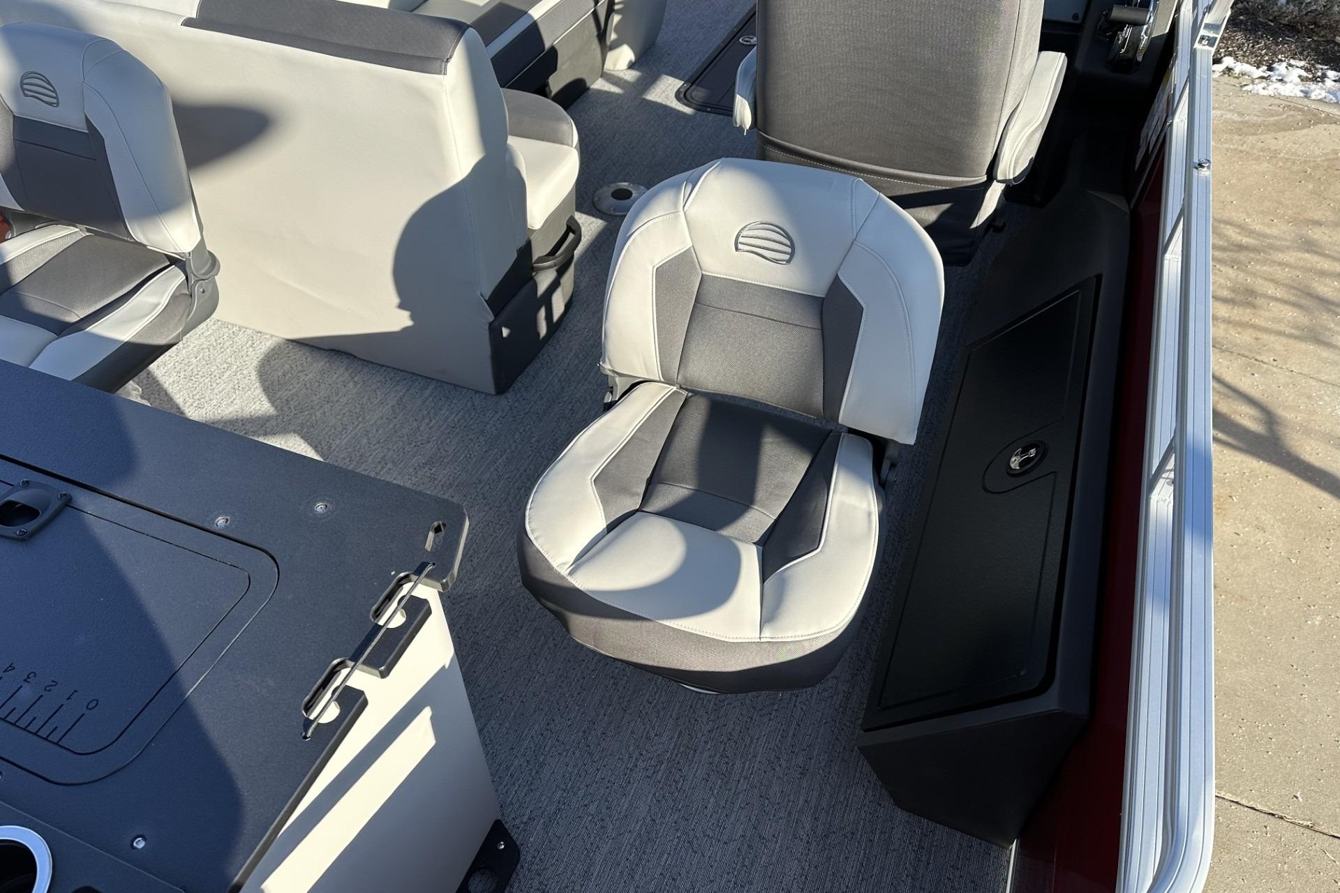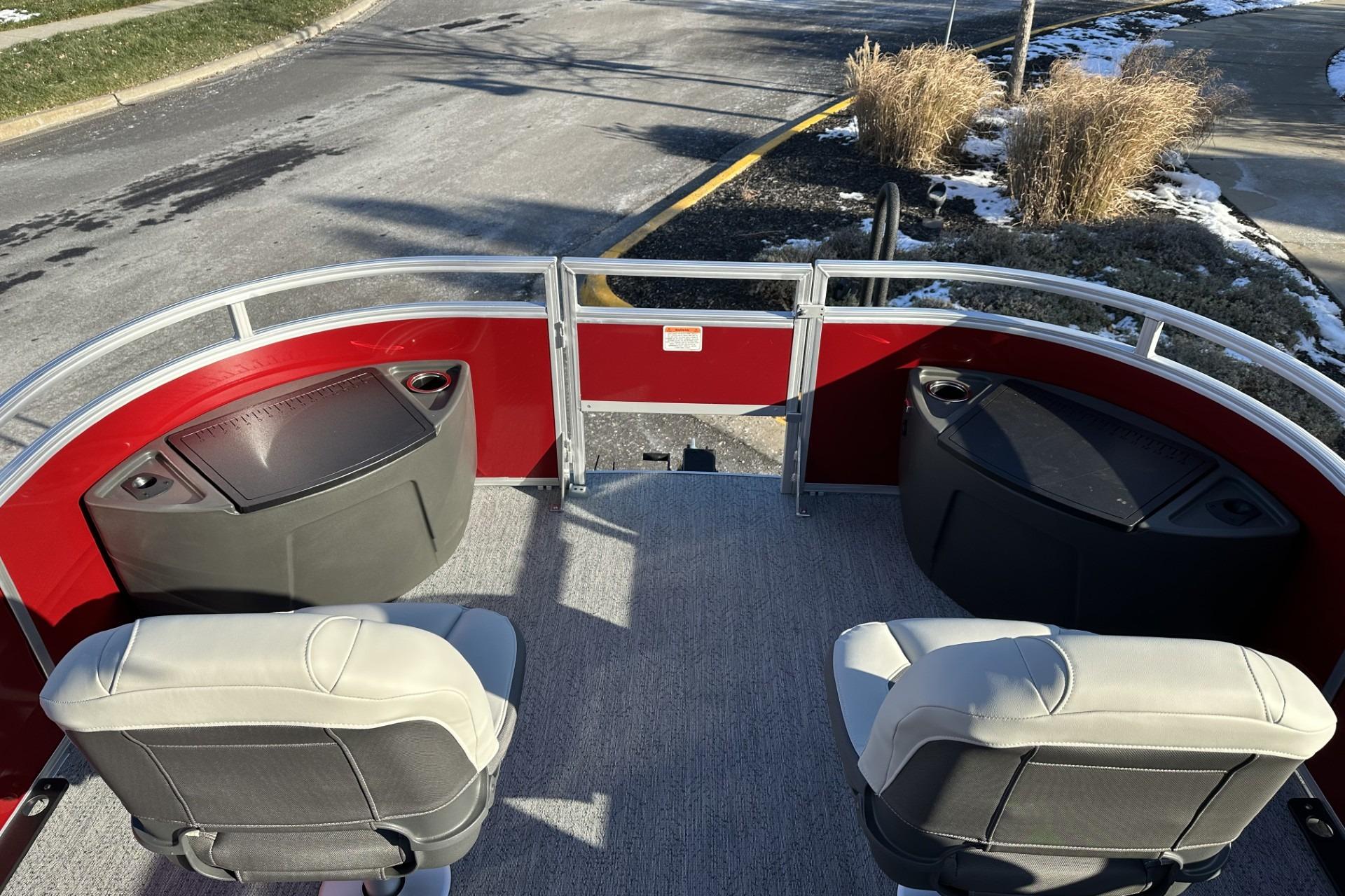Captains can control it all with the SUN TRACKER FLARE™ touch-screen gauge display. Set up the 10' bimini top, grab your rod out of the lockable rod box, and post up in one of the two fishing decks—each of which sports a 16-gal. aerated livewell—and two swiveling fishing chairs next to rod and tool holders. The dual lounges or aft bench with hidden storage are ready for relaxation. The lounges’ all-new open section in the backrest increases accessible storage and even has extra cupholders. 2026 also brings a wider, ergonomic boarding ladder.