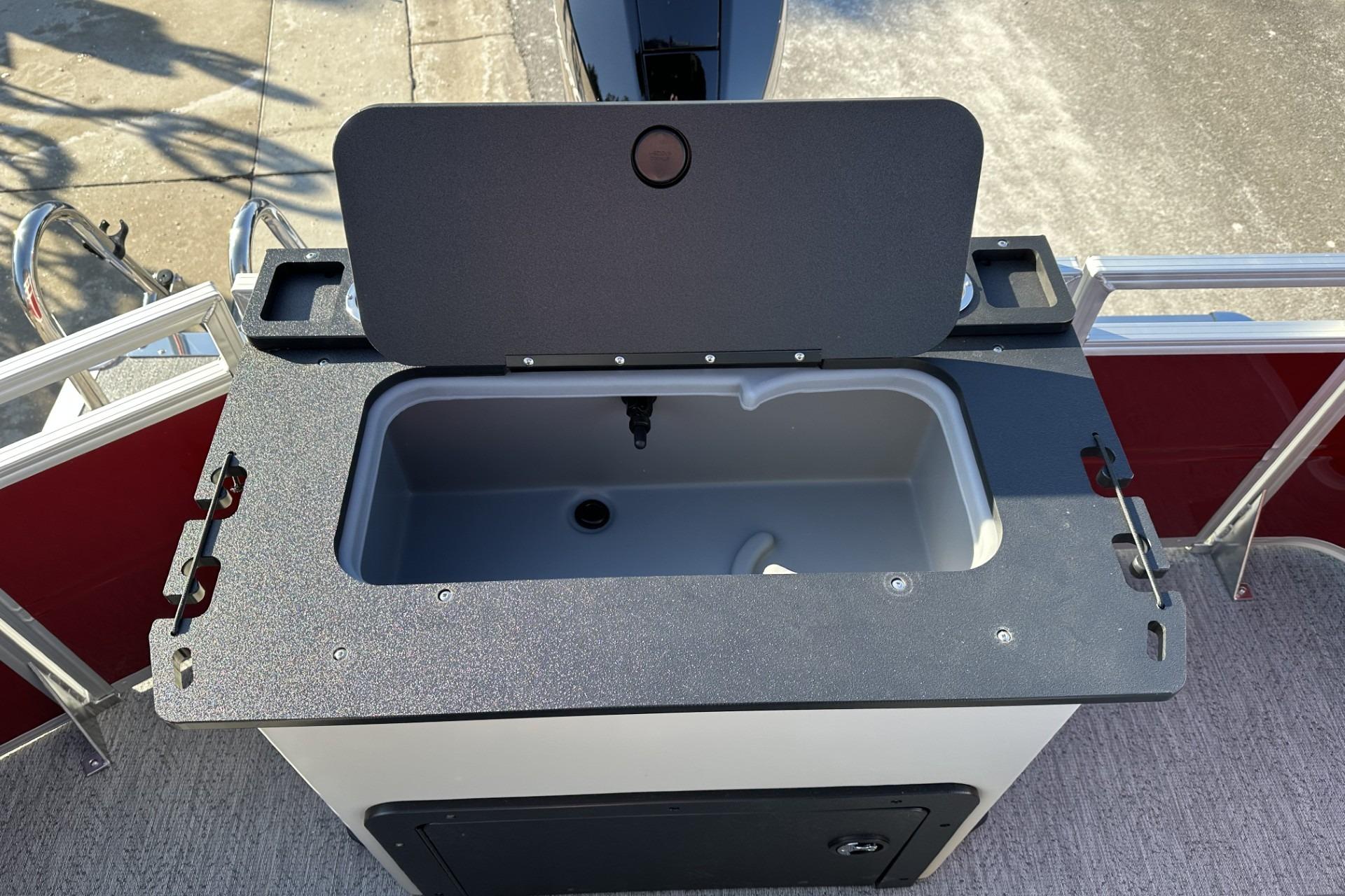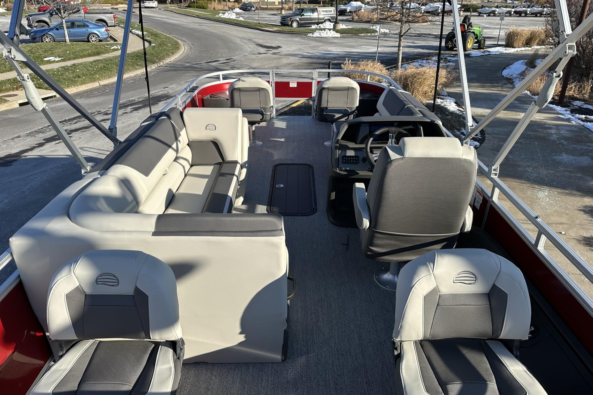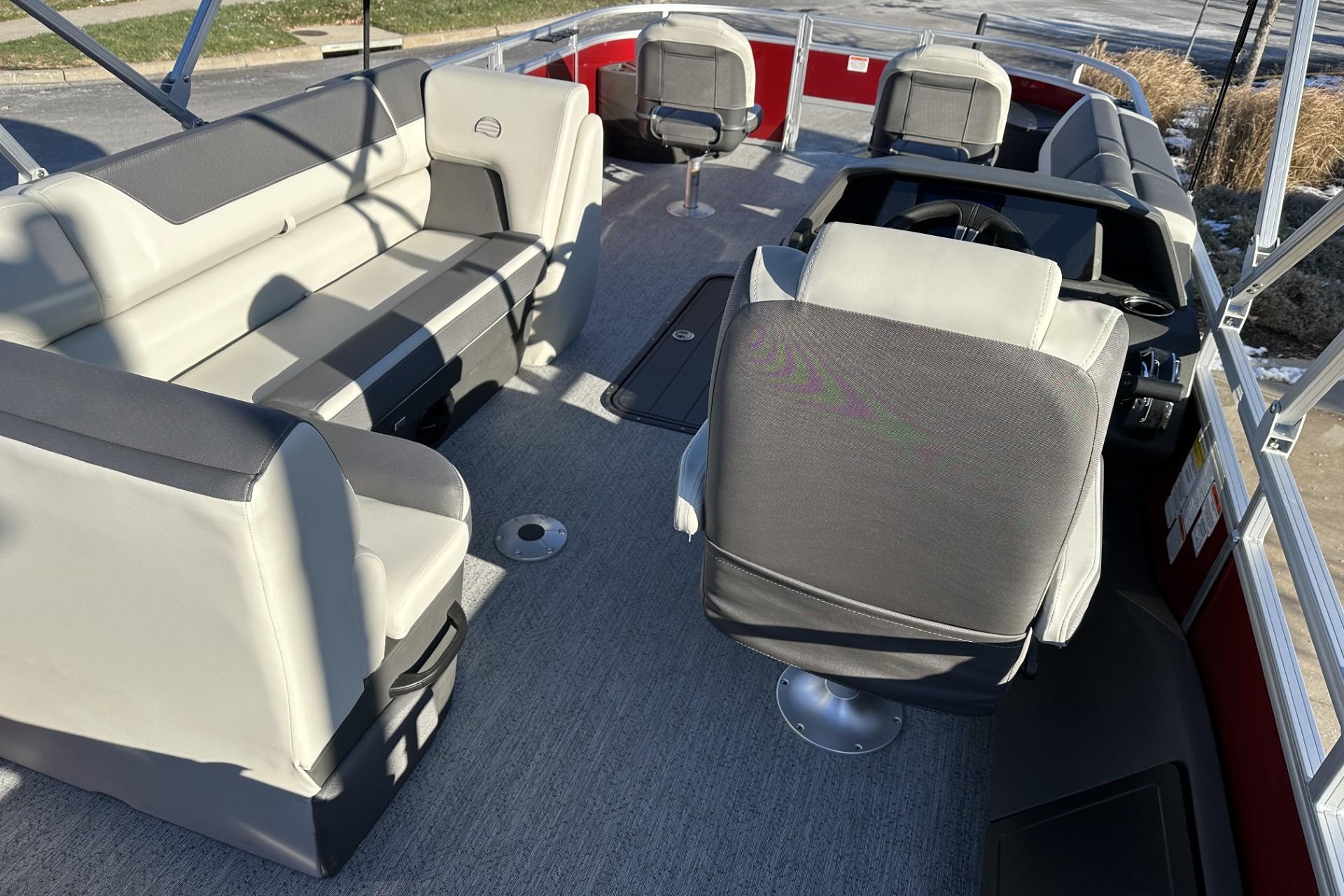 Captains can control it all with the SUN TRACKER FLARE™ touch-screen gauge display. Set up the 10' bimini top, grab your rod out of the lockable rod box, and post up in one of the two fishing decks—each of which sports a 16-gal. aerated livewell—and two swiveling fishing chairs next to rod and tool holders. The dual lounges or aft bench with hidden storage are ready for relaxation. The lounges’ all-new open section in the backrest increases accessible storage and even has extra cupholders. 2026 also brings a wider, ergonomic boarding ladder.