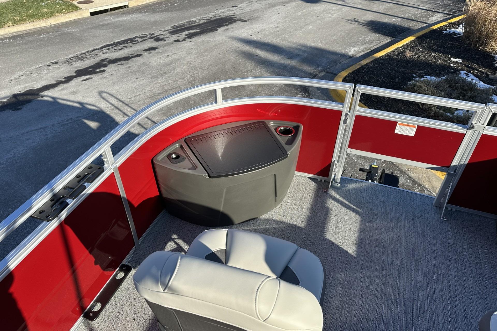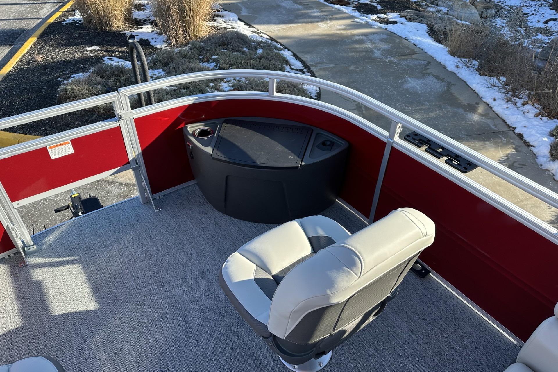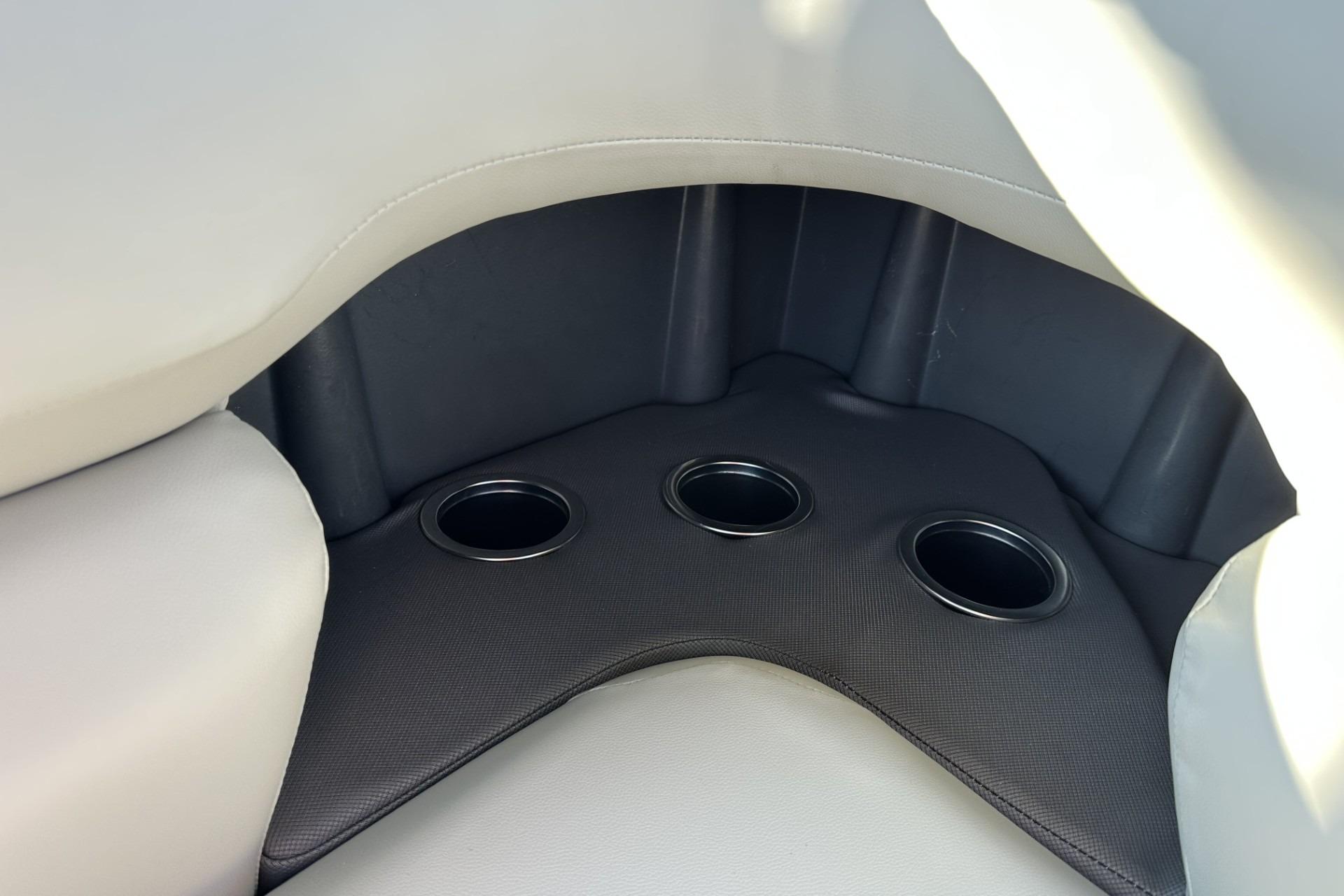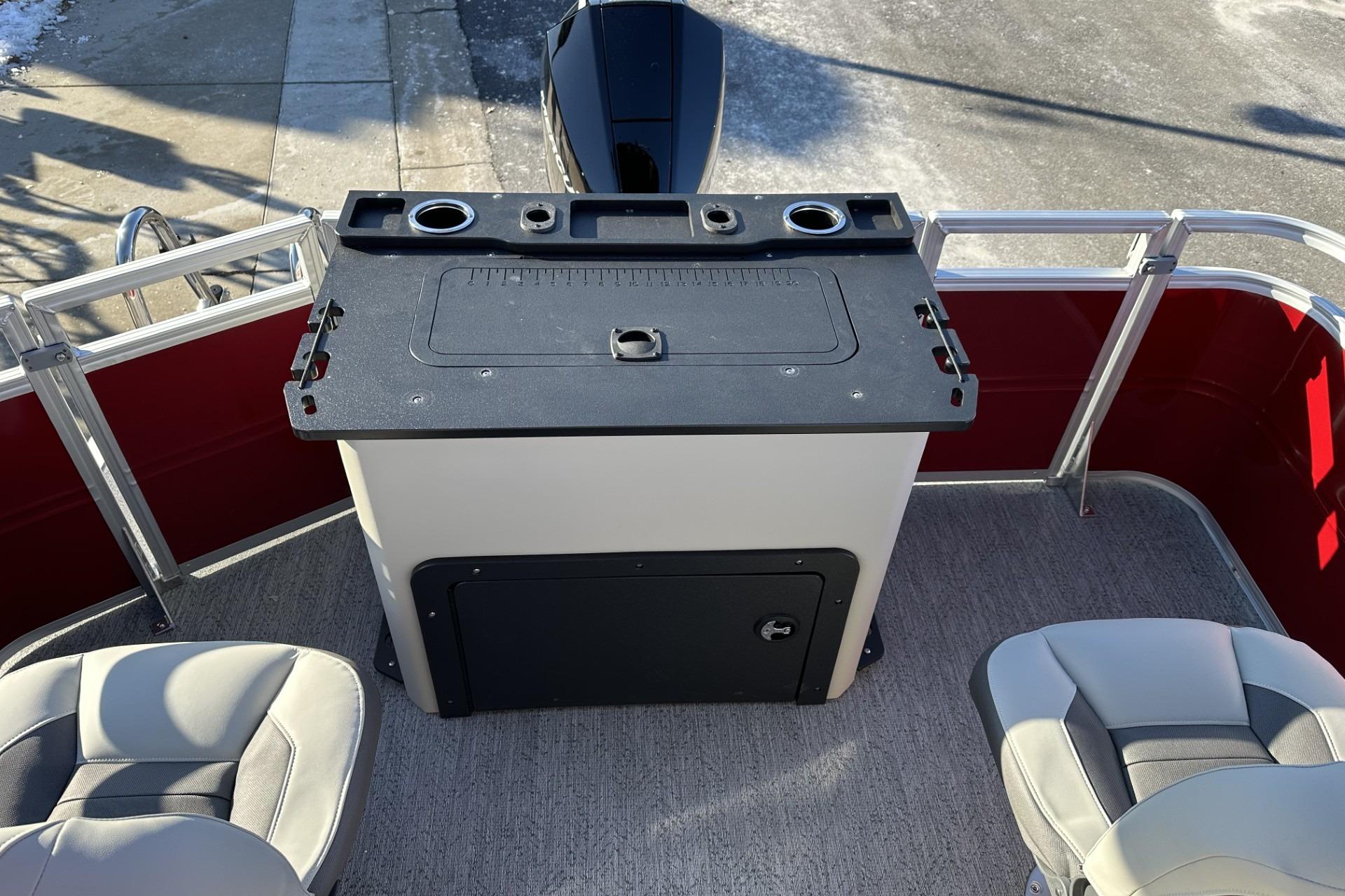 • Front fishing station w/2 pedestal seat base locations; rail-mounted rod & tool holders; & bow starboard storage compartment w/drink holder, rod holder & composite lid w/fish ruler